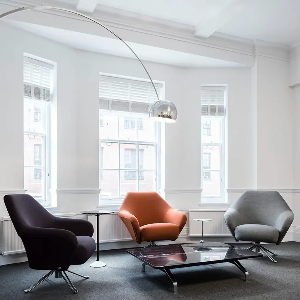 Part of "ABV Collection", this swivel armchair designed in 1956 is a timeless piece of furniture capable of proving unrivaled comfort through a mechanism that allows it to automatically return to its original state. Its steel frame consists of a four-spoke base with a satin nickel finish that supports the sinuous and voluptuous seating area, where the thick seat cushion is set in a wraparound structure comprising the backrest and closed armrests.