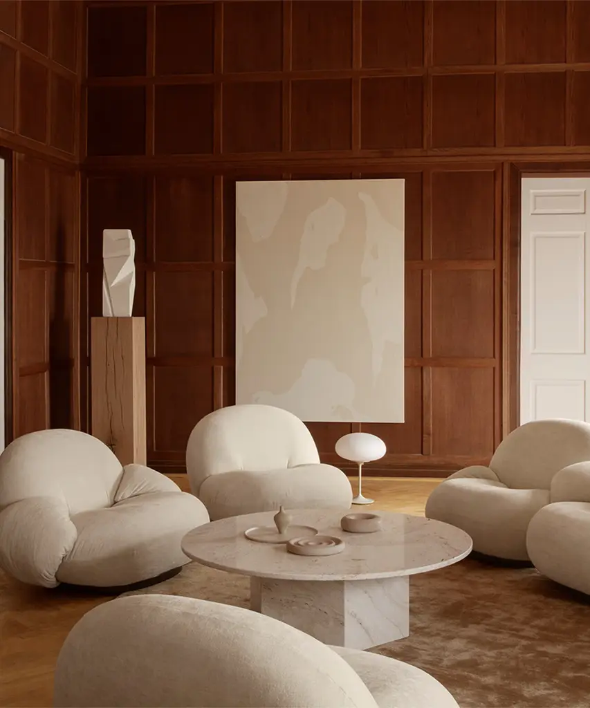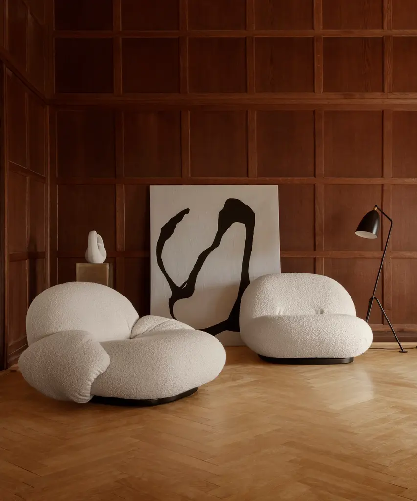 A joyful modernist, Paulin’s low-slung pieces provided a new laid-back perspective on life and his forward-looking, eclectic and sculpturall approach to furniture design instantly caught the mood of the swinging 60’s. The Pacha lounge chair is fullly upholstered, has a painted wood base and is available with a fixed base or returning swivel base. Designed by Pierre Paulin for Danish design purveyor, Gubi.