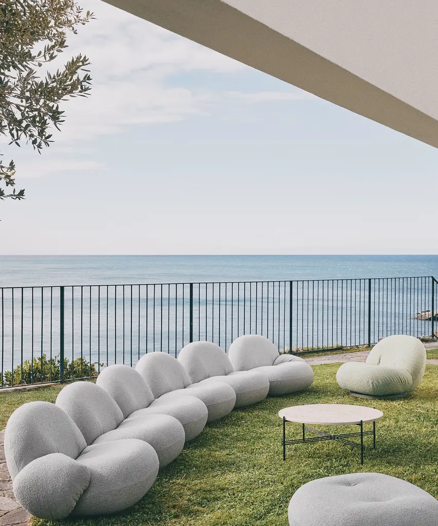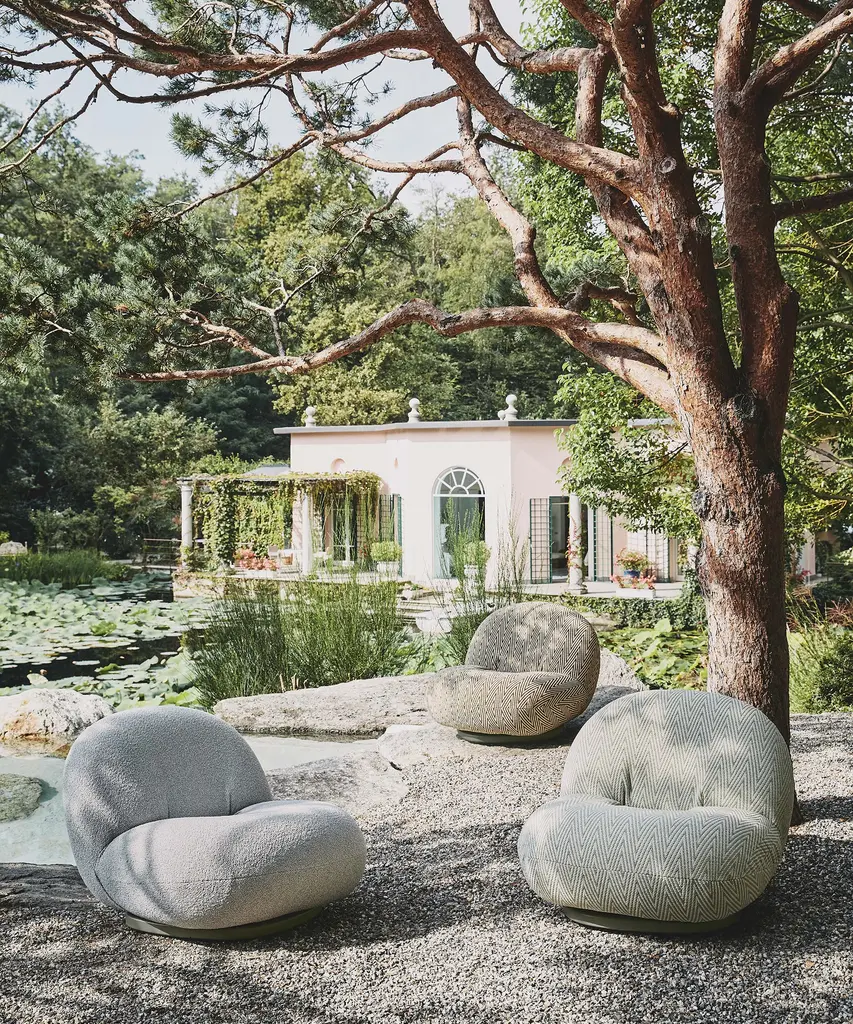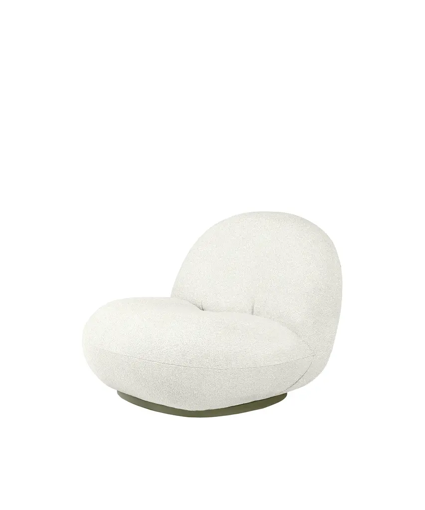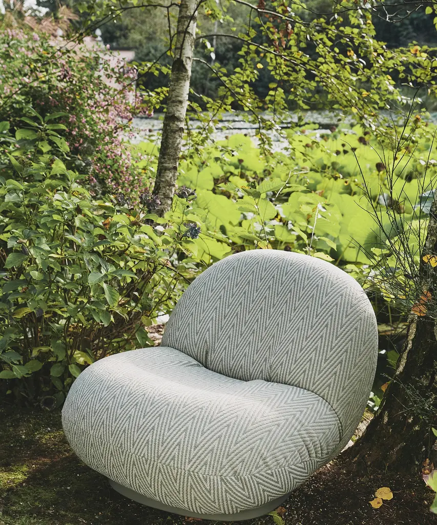 A joyful modernist, Paulin's low-slung pieces provided a new laid-back perspective on life and his forward-looking, eclectic and sculptural approach to furniture design instantly caught the mood of the swinging 60's. The Pacha lounge chair is fully upholstered, has a painted wood base and is available with a fixed base or returning swivel base. Designed by Pierre Paulin for Danish design purveyor, Gubi.