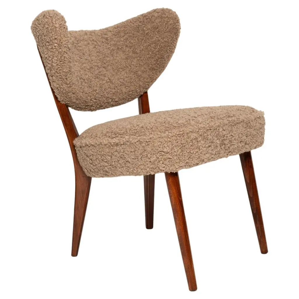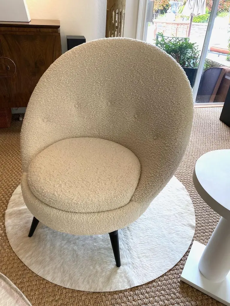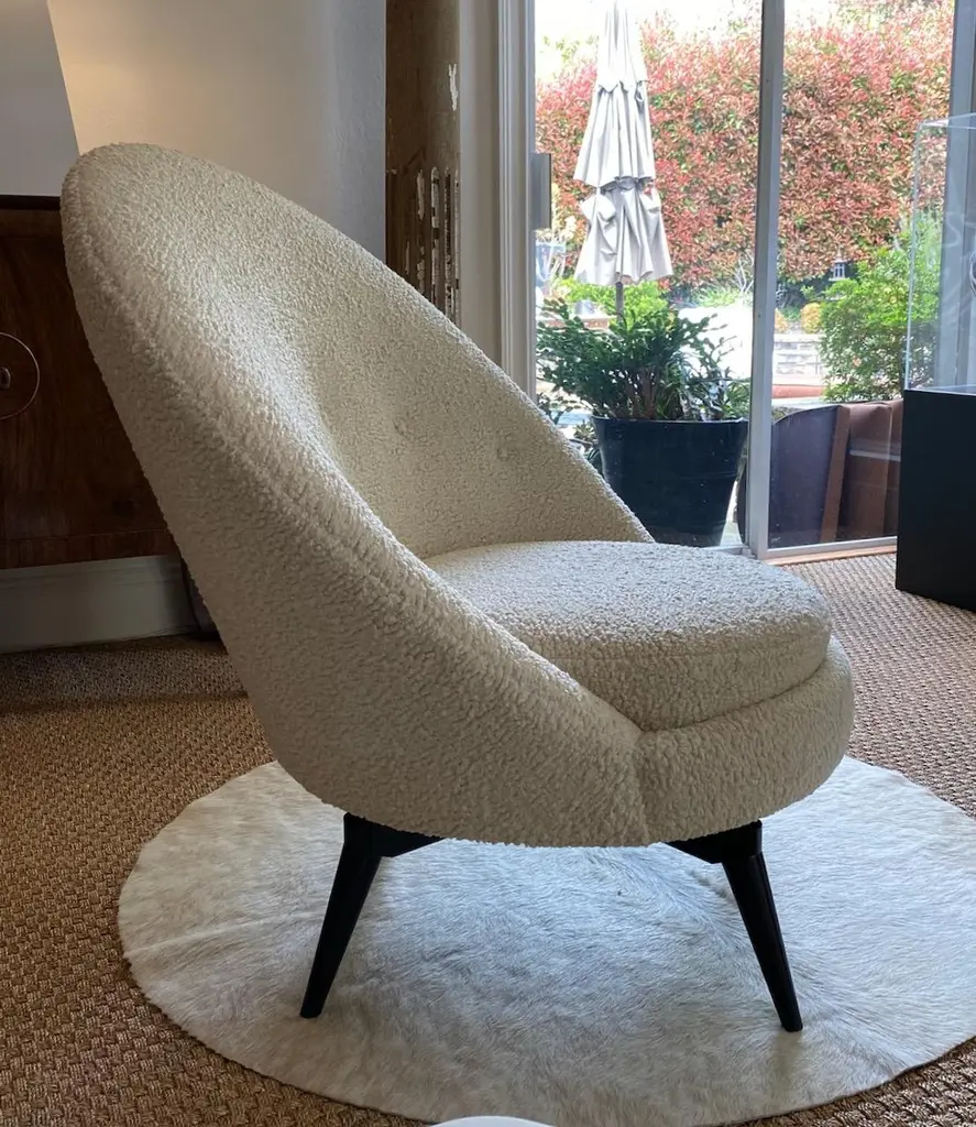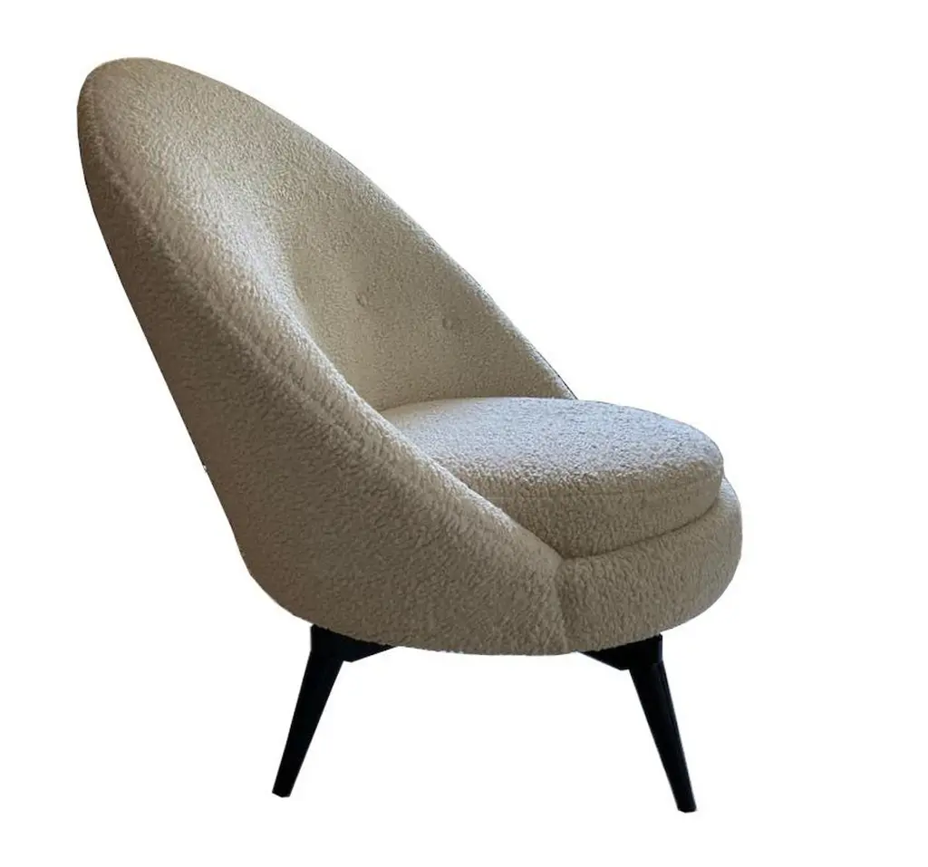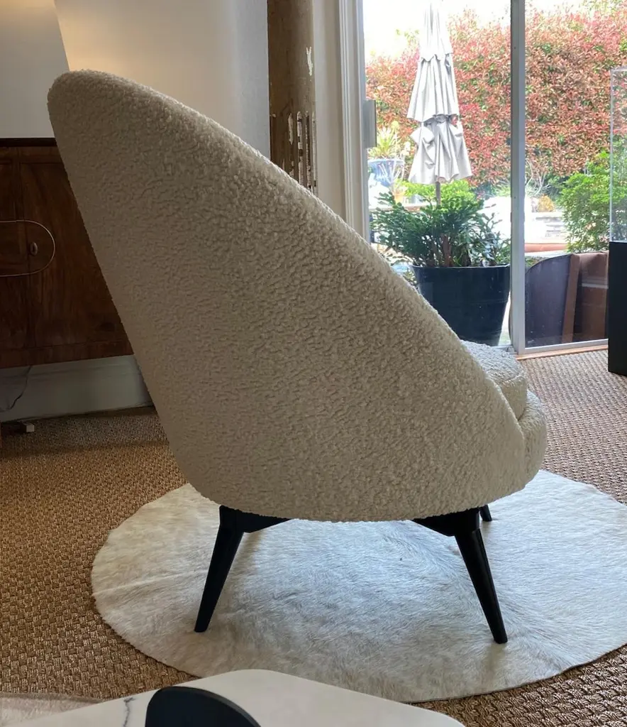 Swivel Egg chair in the French mid-century style. This sophisticated chair is upholstered in a luxurious heavy-weight Bouclé. This super stylish and versatile example is as comfortable as it looks and is painstakingly patterned with a hardwood frame, Dacron and foam over webbed and sprung seat, and newly engineered bases with steel swivel plates with nylon ring bearings. The swivel bases are finished in Espresso lacquer. COM upholstery is available and recommended.