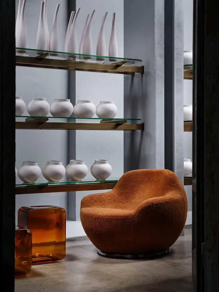 PALLA is a cutting-edge armchair, both in its design and approach to seating.It is a manifesto of the creative fervor of the 1960s, an era marked by the search for new forms of freedom, even in design.Presented at the eighth edition of the Salone del Mobile in Milan in 1969, this armchair stands out for its radical concept, challenging the conventions of traditional furniture and exploring new ways of relaxation and sociability.Starting from the volume of a sphere, the form has been deconstructed into a perfect balance between function and shape.The seat and footrest interlock in a dynamic dialogue, giving rise to a playful and balanced design where comfort is expressed through generous volumes and a sophisticated attention to detail.Today, more than fifty years after its debut, it retains its original design identity, reaffirming its expressive strength.Offered in its original dimensions with optimized comfort, and in a fixed or swivel version with a return mechanism, it continues to challenge design conventions, bringing a bold aesthetic and the pioneering vision of its designer into contemporary interiors.