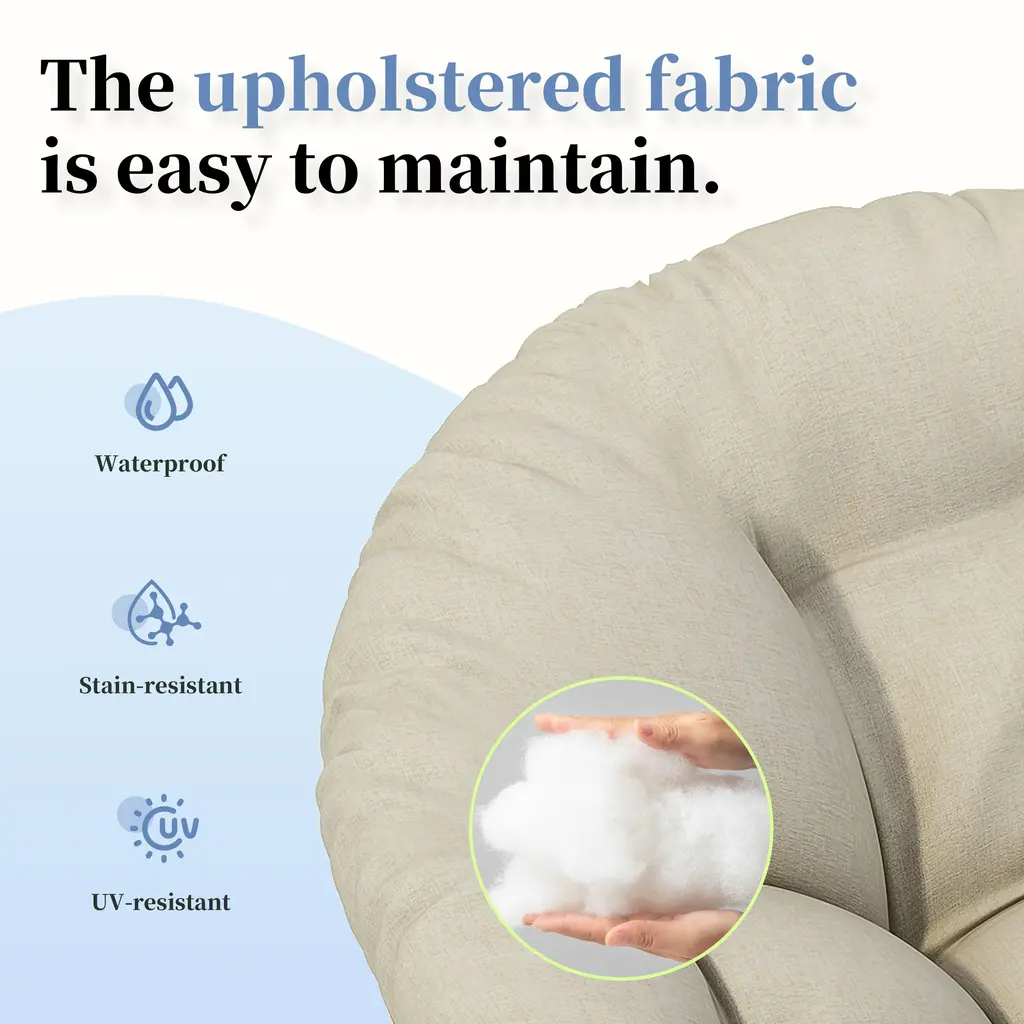 Relax in style and comfort with this accent chair, designed with ergonomics to provide excellent support and promote proper posture. Its ultra-thick cushion offers cloud-like comfort, while the high-density padding ensures long-lasting coziness for lounging or unwinding. Crafted with a sturdy metal frame and elegant wicker weaving, it combines durability with timeless appeal. The waterproof, stain-resistant, and UV-resistant fabric makes it perfect for both indoor and outdoor use, maintaining its beauty and functionality over time. Featuring a smooth 360 ° swivel and adjustable feet, this chair ensures effortless versatility and stability on any surface.
