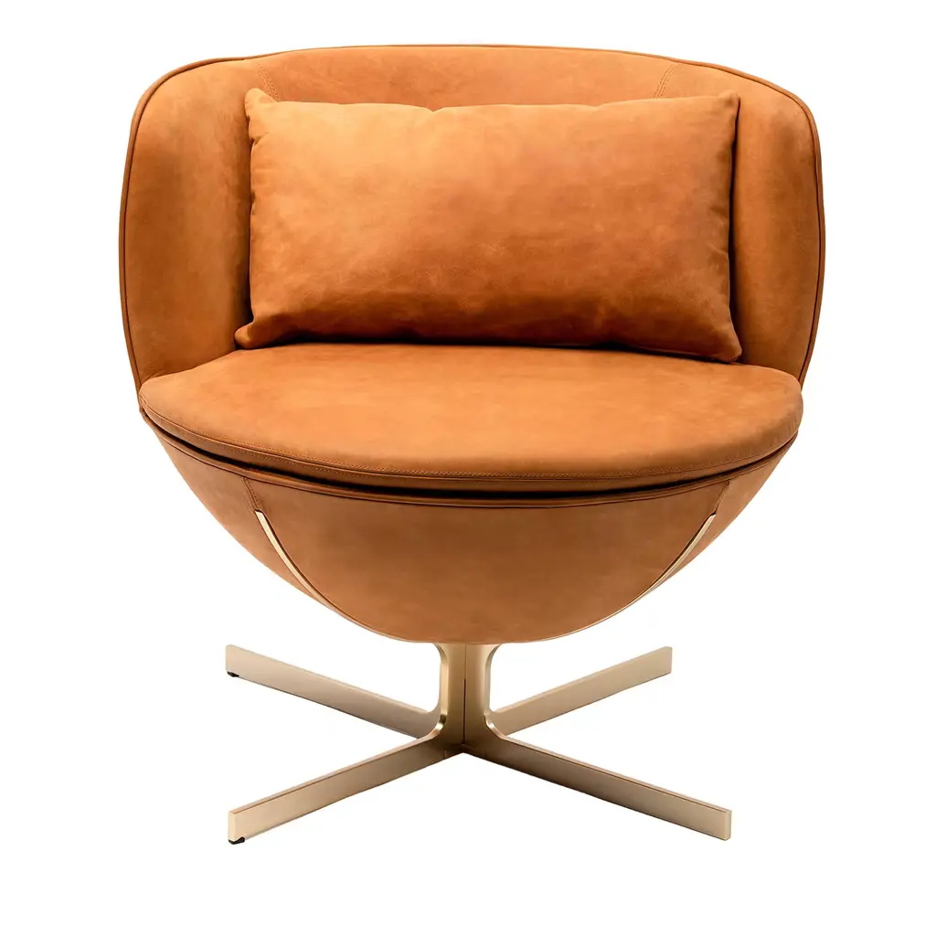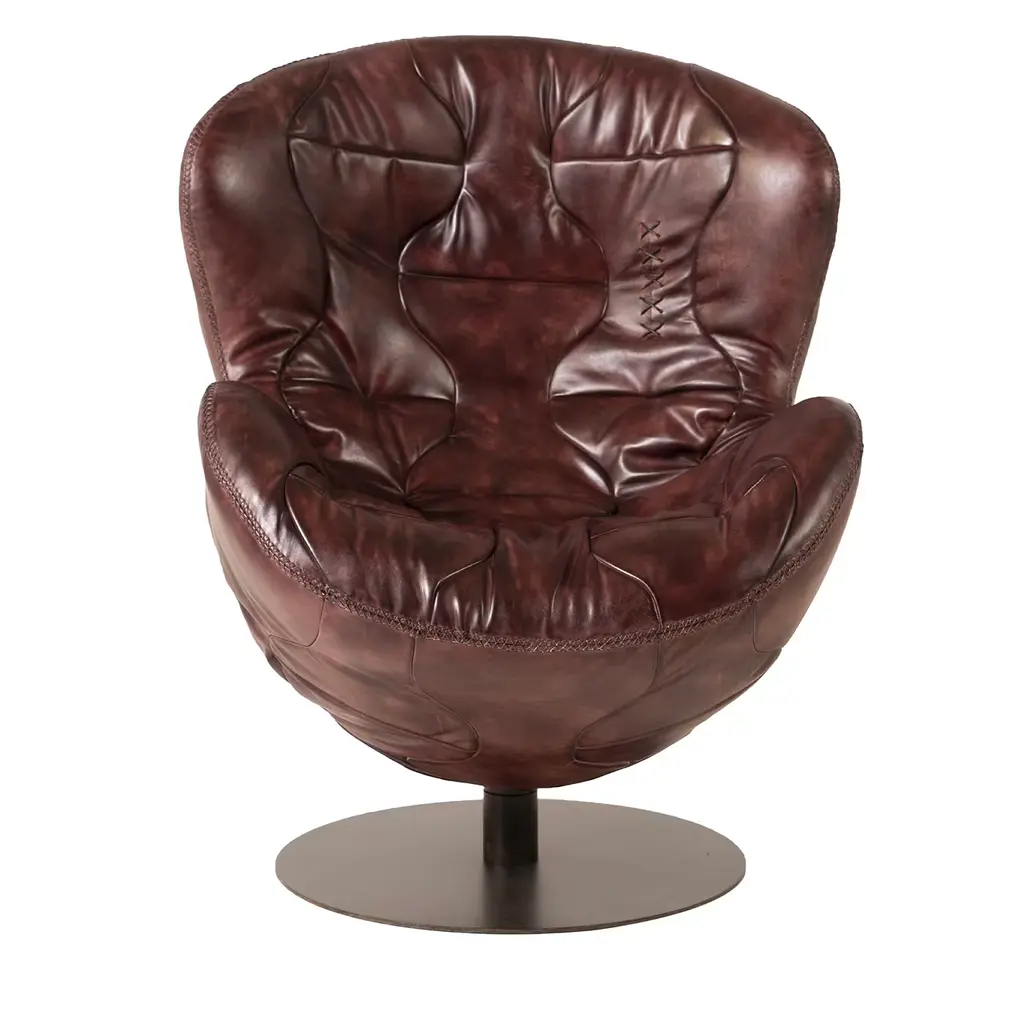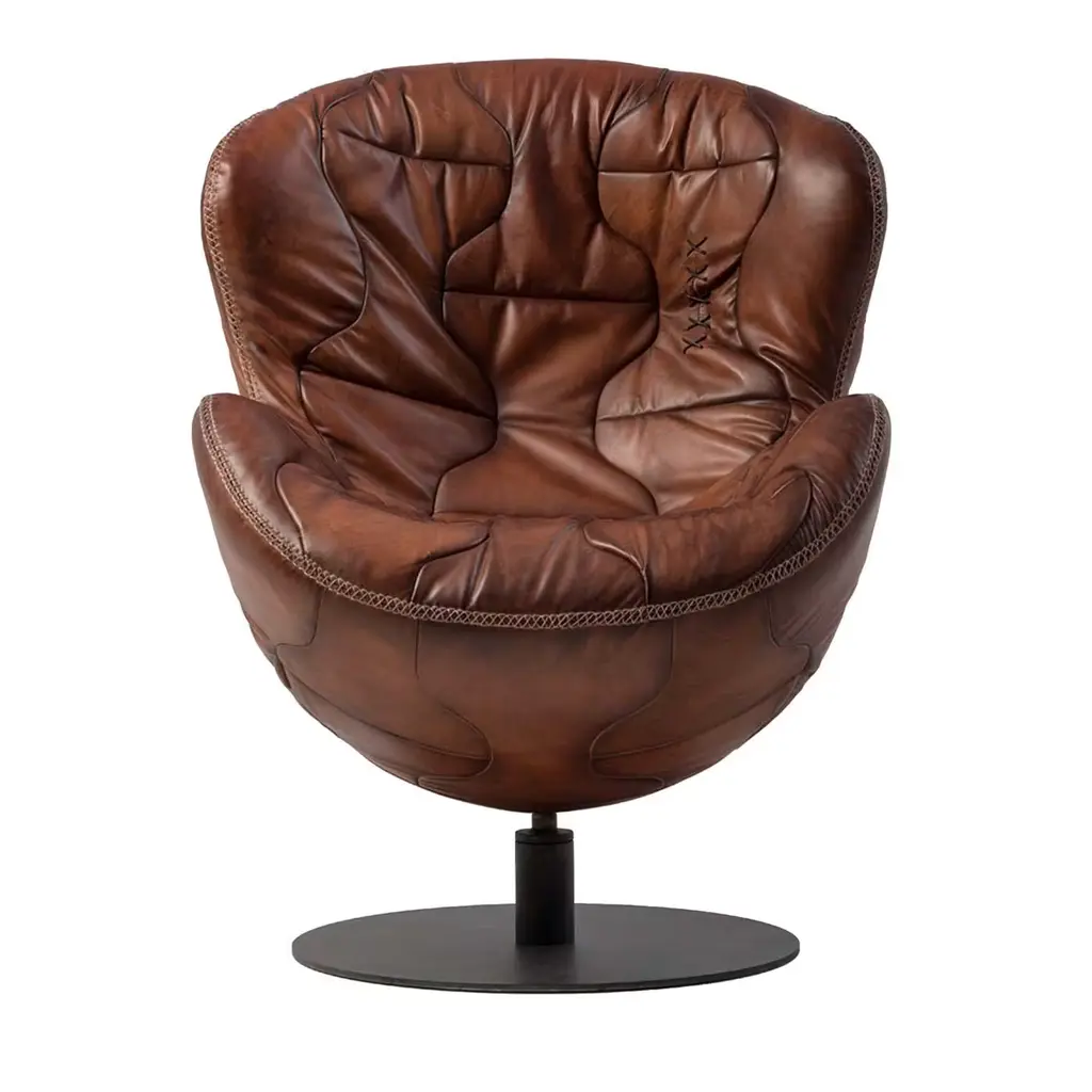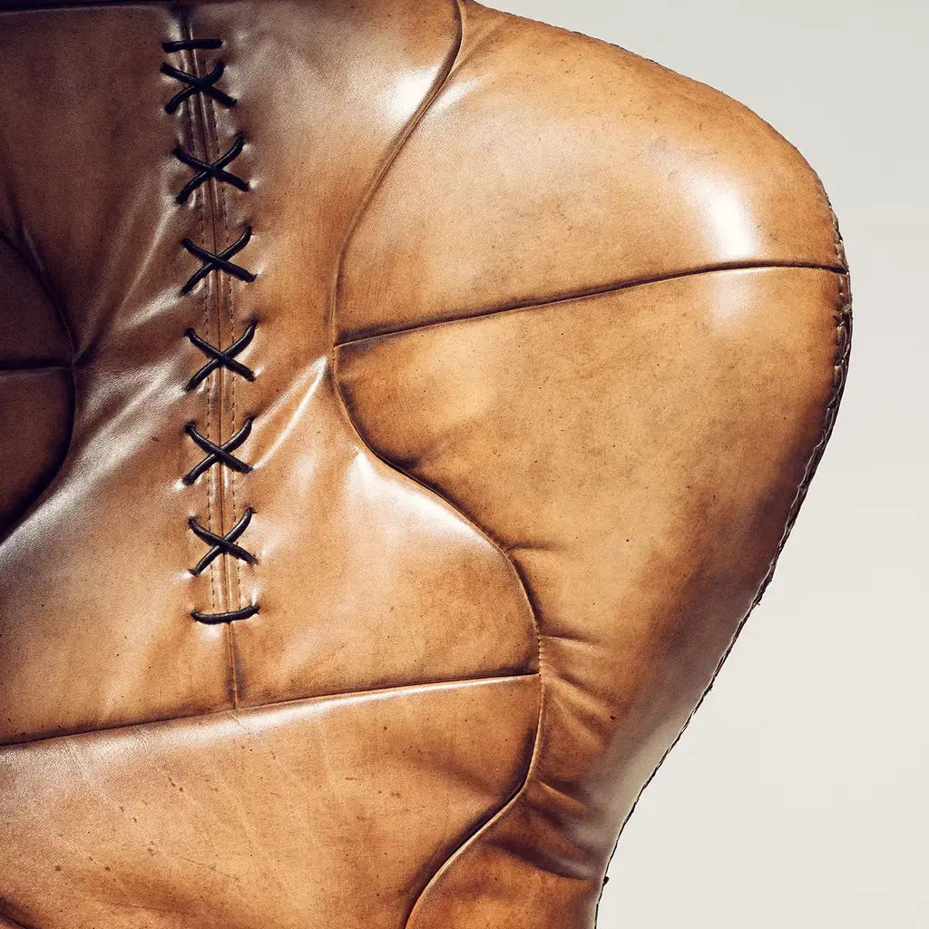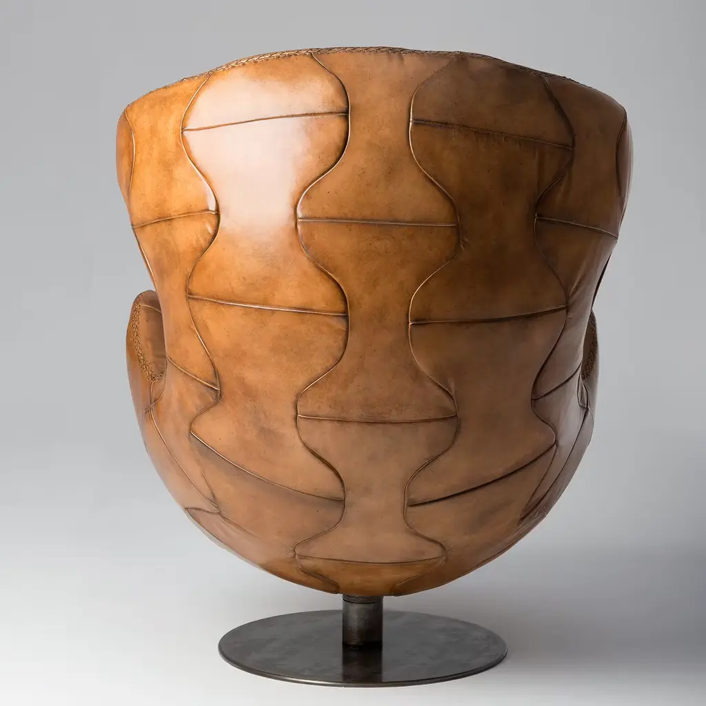 The Pelé Armchair is handcrafted using the same techniques used in the construction of original leather footballs. Paying homage to the world famous football player, this piece is made from hand-tanned split leather, boasting an antiqued finish achieved through an age-old Tuscan artisanal process. A swivel steel base completes the design, adding a contemporary touch and ensuring maximum practicality.