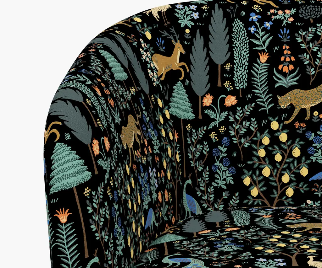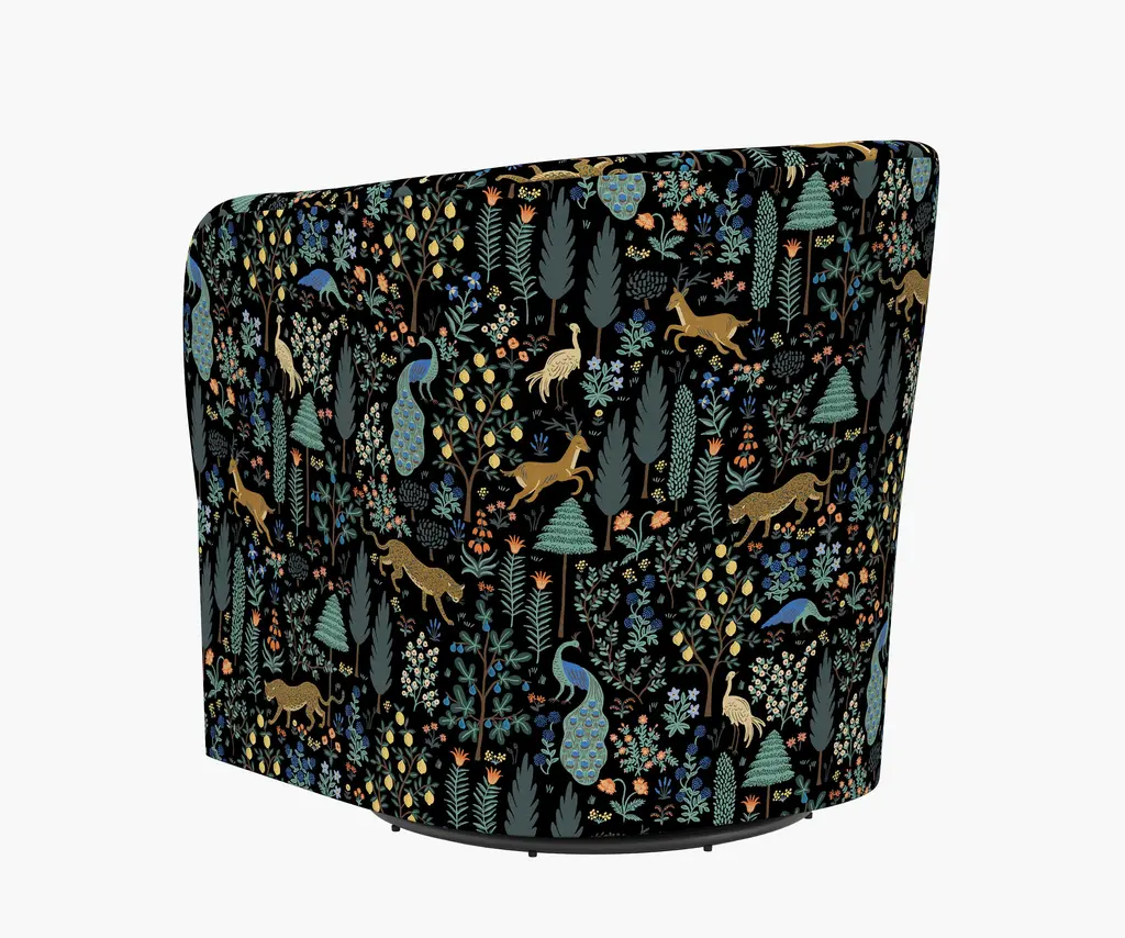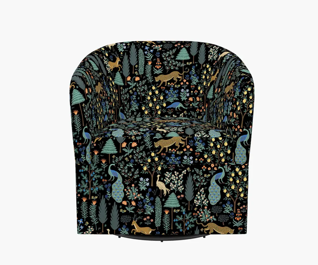 With clean lines and a comfortable seat, this statement-making chair offers a smooth 360-degree swivel. Select from 17 illustrated fabrics for your made-to-order piece, crafted in Chicago by Cloth & Company.