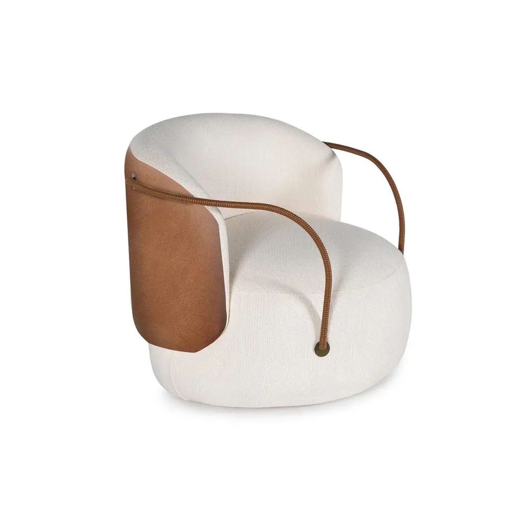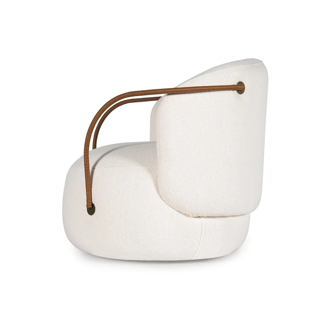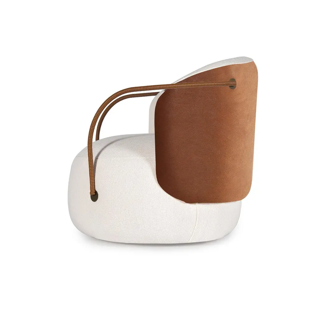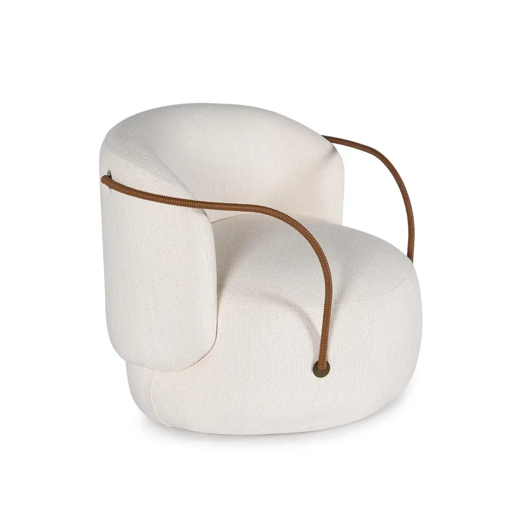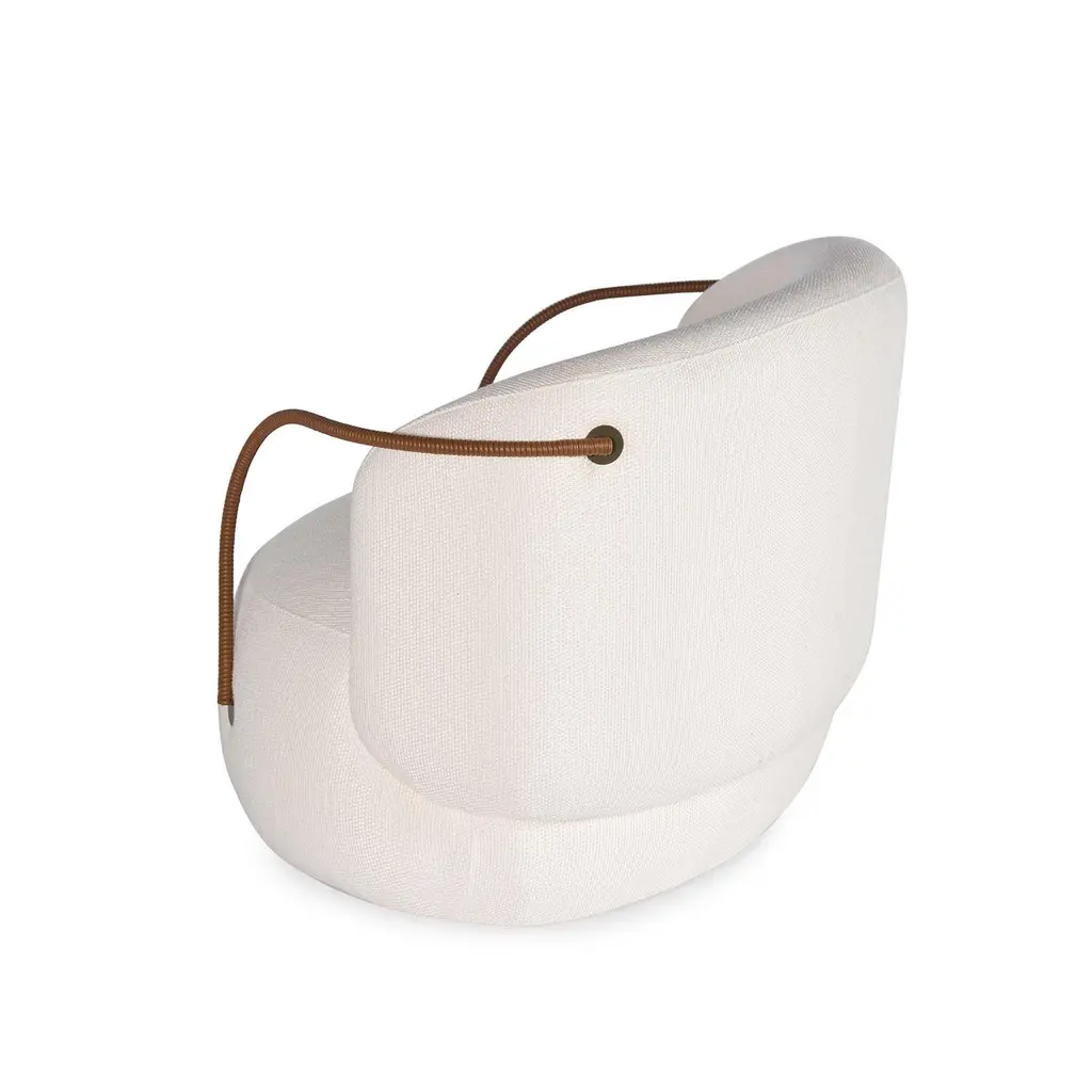 Pietra from Italian: StoneThe Pietra swivel armchair is designed with pure, organic shape. Covered with a mix of comfortable fabrics: off-white boucle on the front and polyester with a “natural skin” finish in coffee color on the back. It has a decorative slim carbon steel arm that has ecological leather strings intertwined by hand, making the sophisticated detail that enhances and enhances the piece.The set pieces are sold separately (couch, armchair, pouf and pillows).
