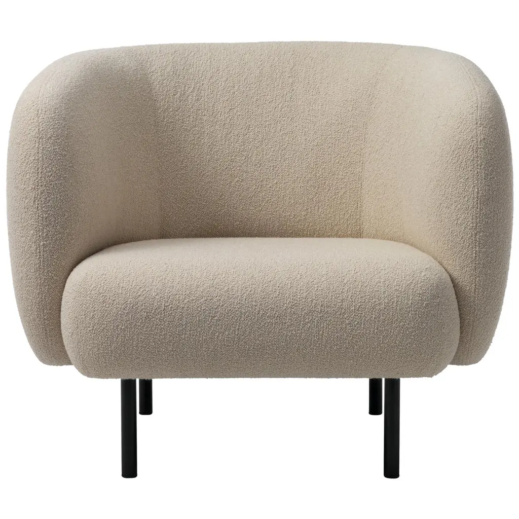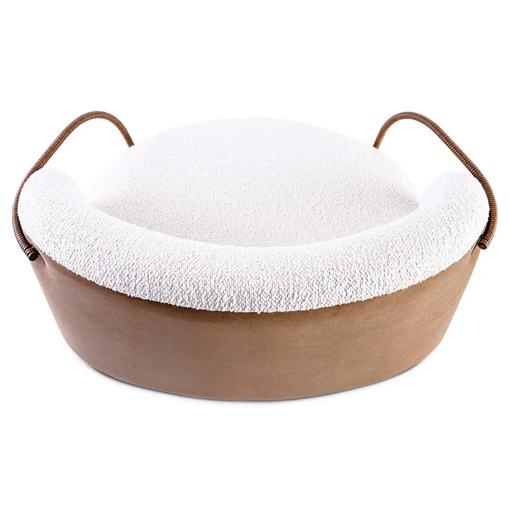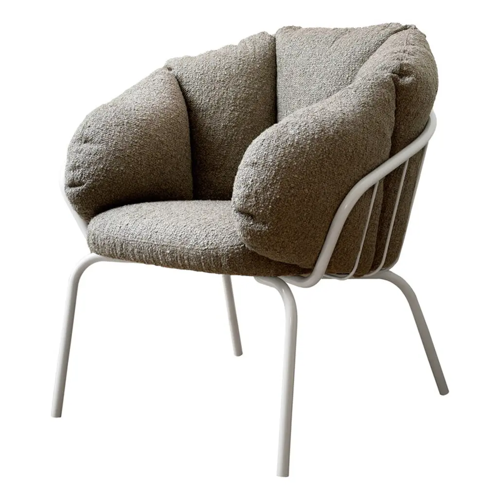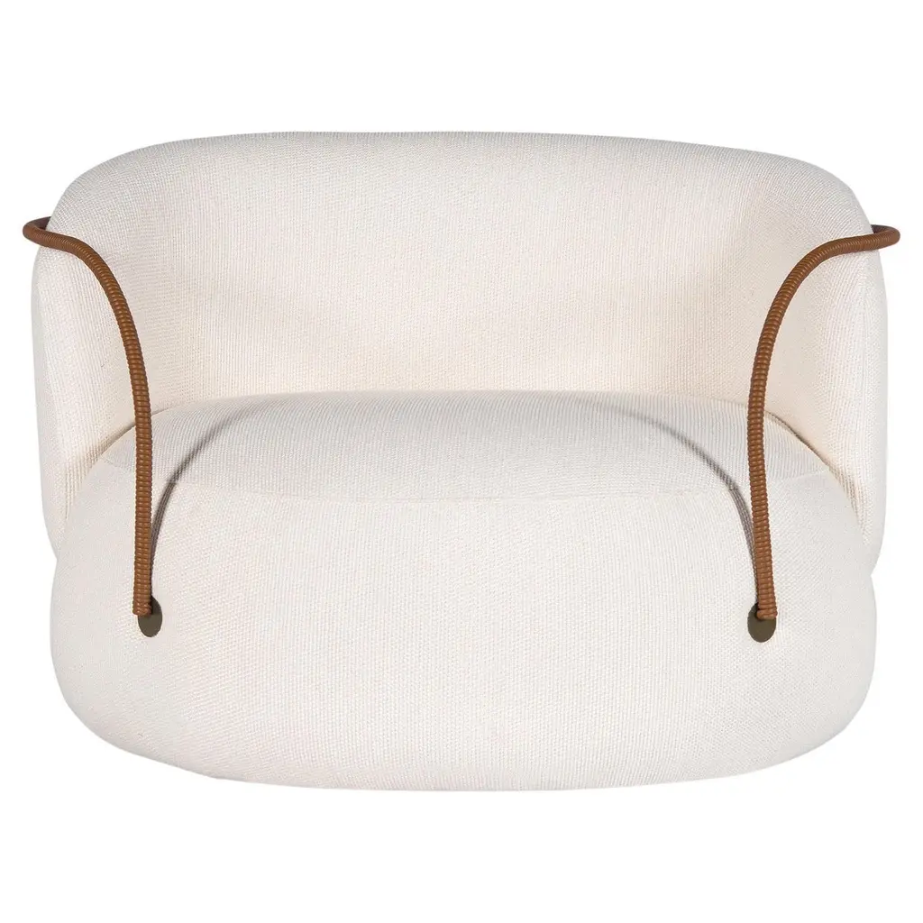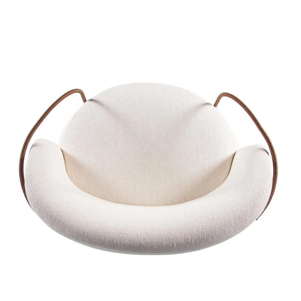 Pietra from Italian: StoneThe Pietra swivel armchair is designed with pure, organic shape. Covered with a mix of comfortable fabrics: off-white boucle on the front and polyester with a “natural skin” finish in coffee color on the back. It has a decorative slim carbon steel arm that has ecological leather strings intertwined by hand, making the sophisticated detail that enhances and enhances the piece.The set pieces are sold separately (couch, armchair, pouf and pillows).