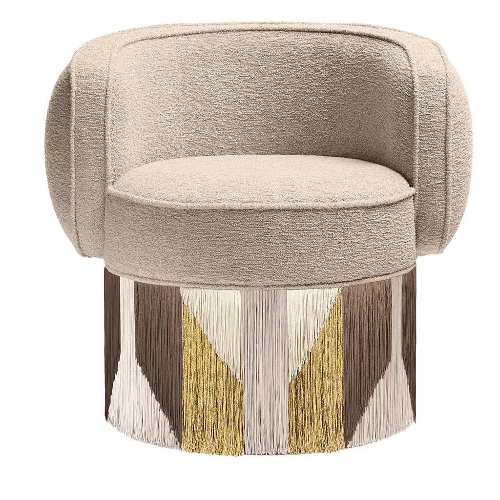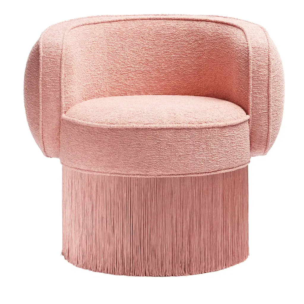 Designed with maximum comfort in mind, this extraordinary Pirouette Clu Flo swivel chair by Lorenza Bozzoli will pair perfectly with a pouf from the same Collection. Featuring a swivel metal base and a snug tub chair silhouette upholstered in plushy pink fabric, along with a spectacular geometric pattern created by the chromatic effects of its viscose fringe skirt. Color customizations are available upon request to the Concierge.