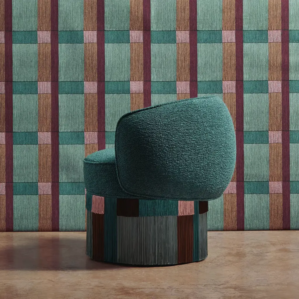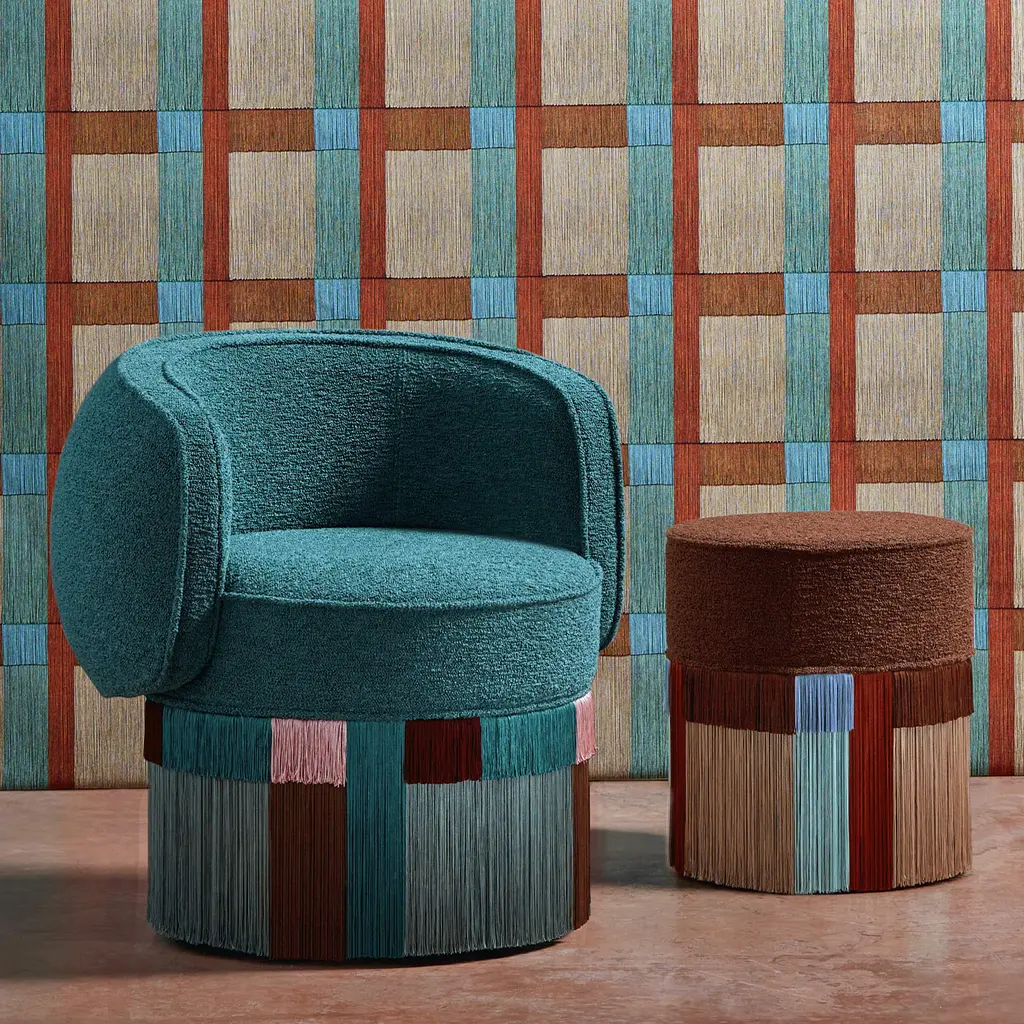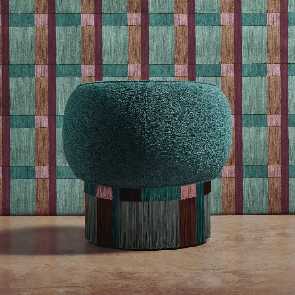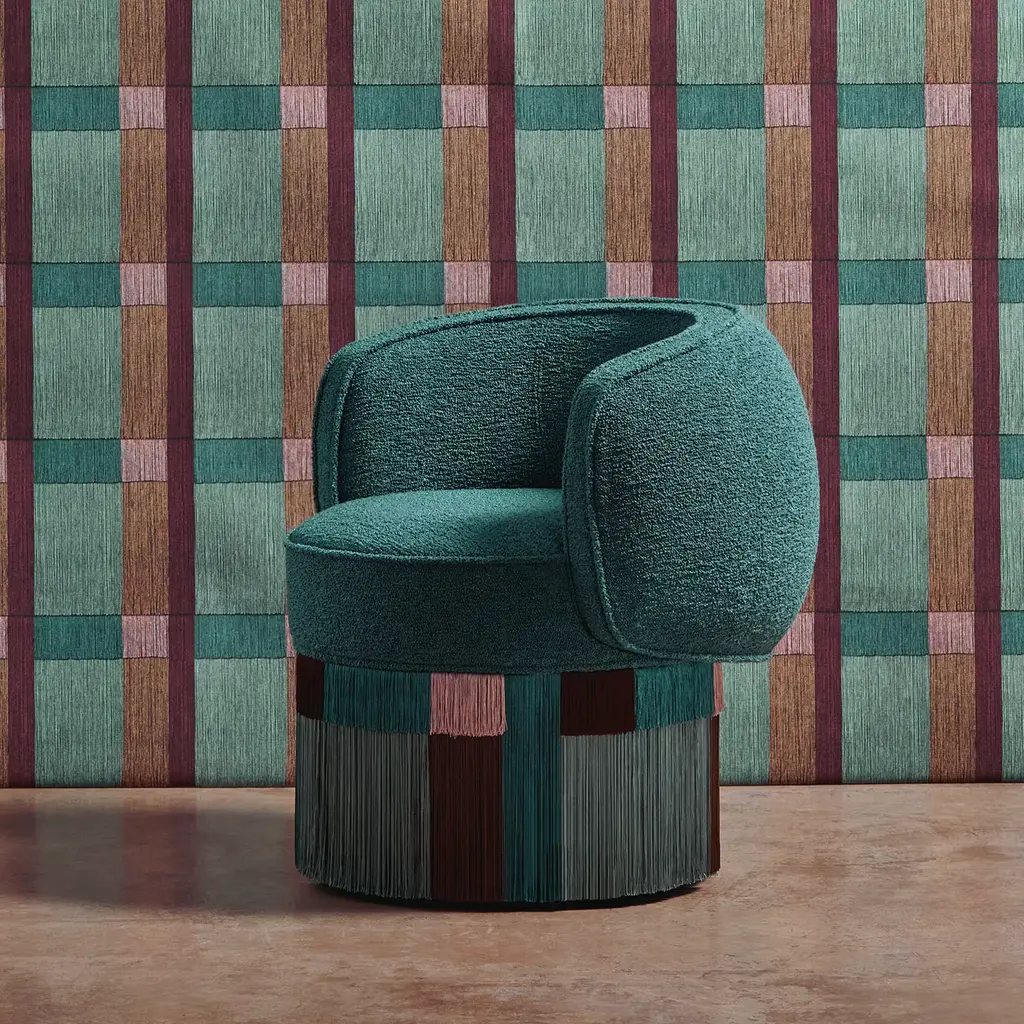 For a captivating touch in a contemporary living area, this gorgeous hand-crafted Pirouette Clou armchair by Lorenza Bozzoli features a metal swivel base and a plush green upholstered padded seat. Embellished by a geometric-pattern fringe skirt with hues of green, brown, and pink, this unique piece is numbered and signed by the designer. Customization is available, please contact the Concierge for information.