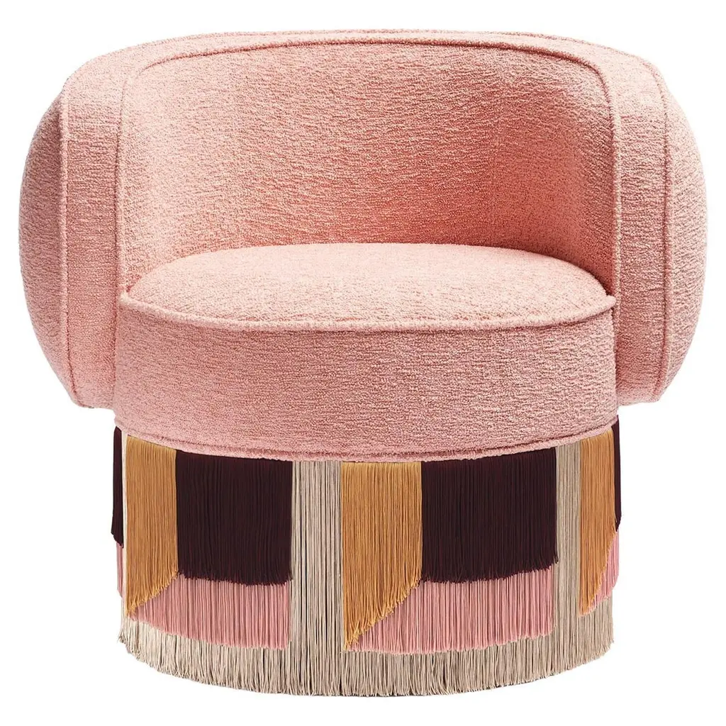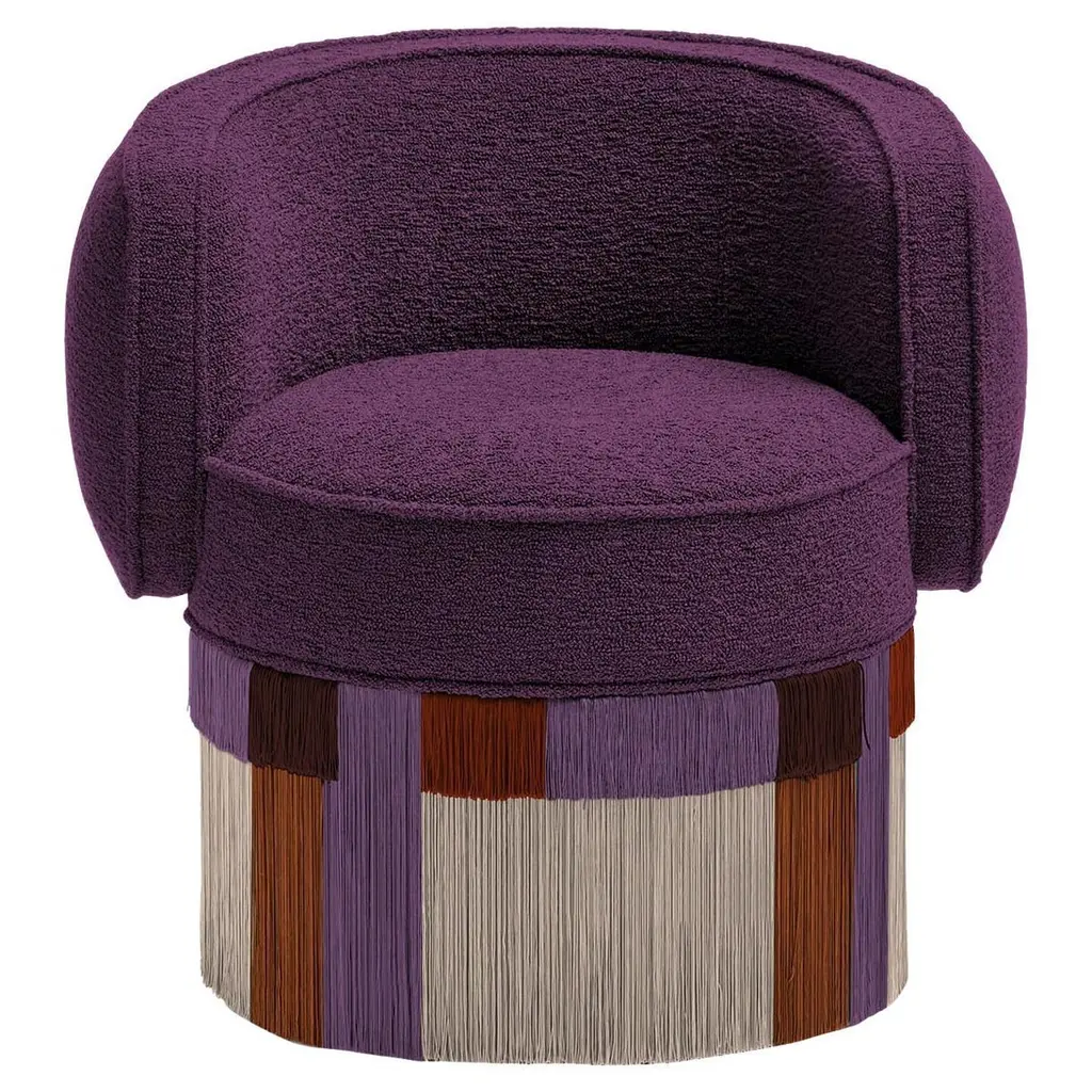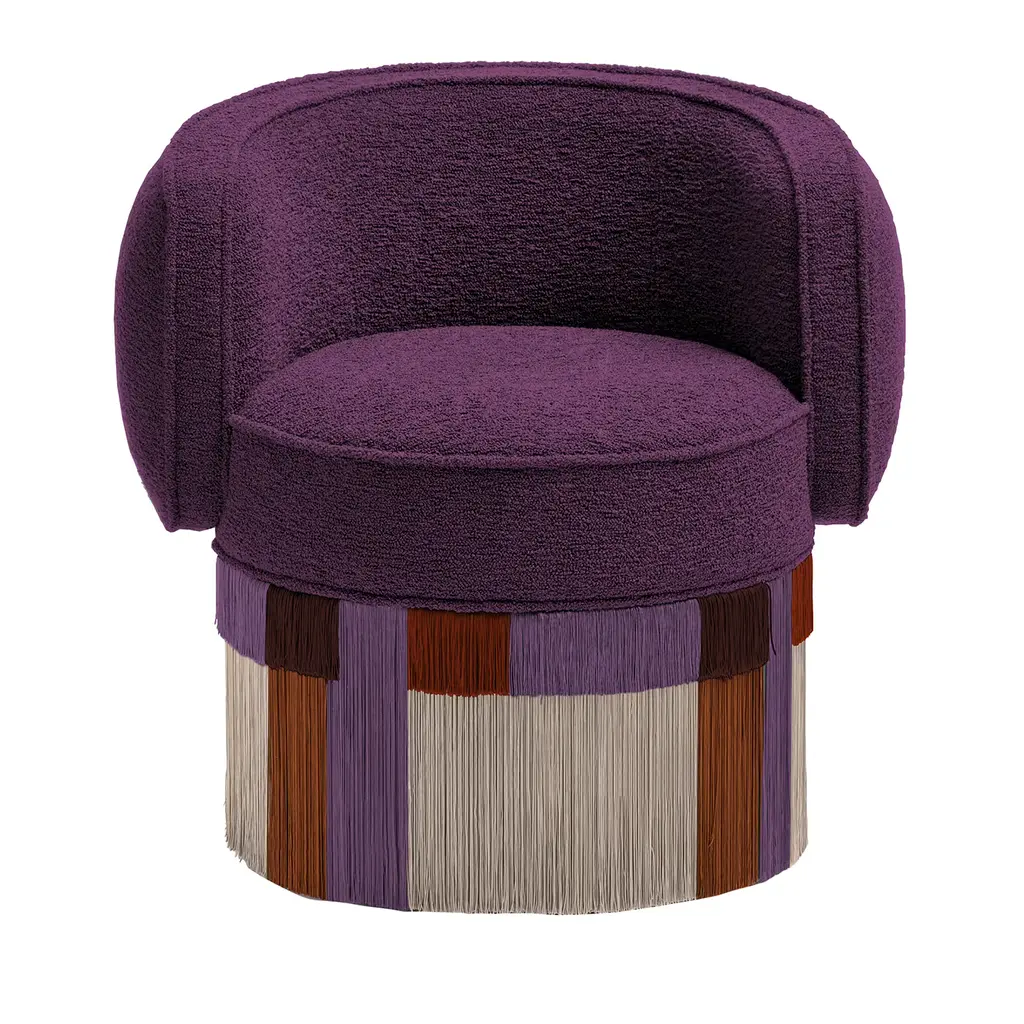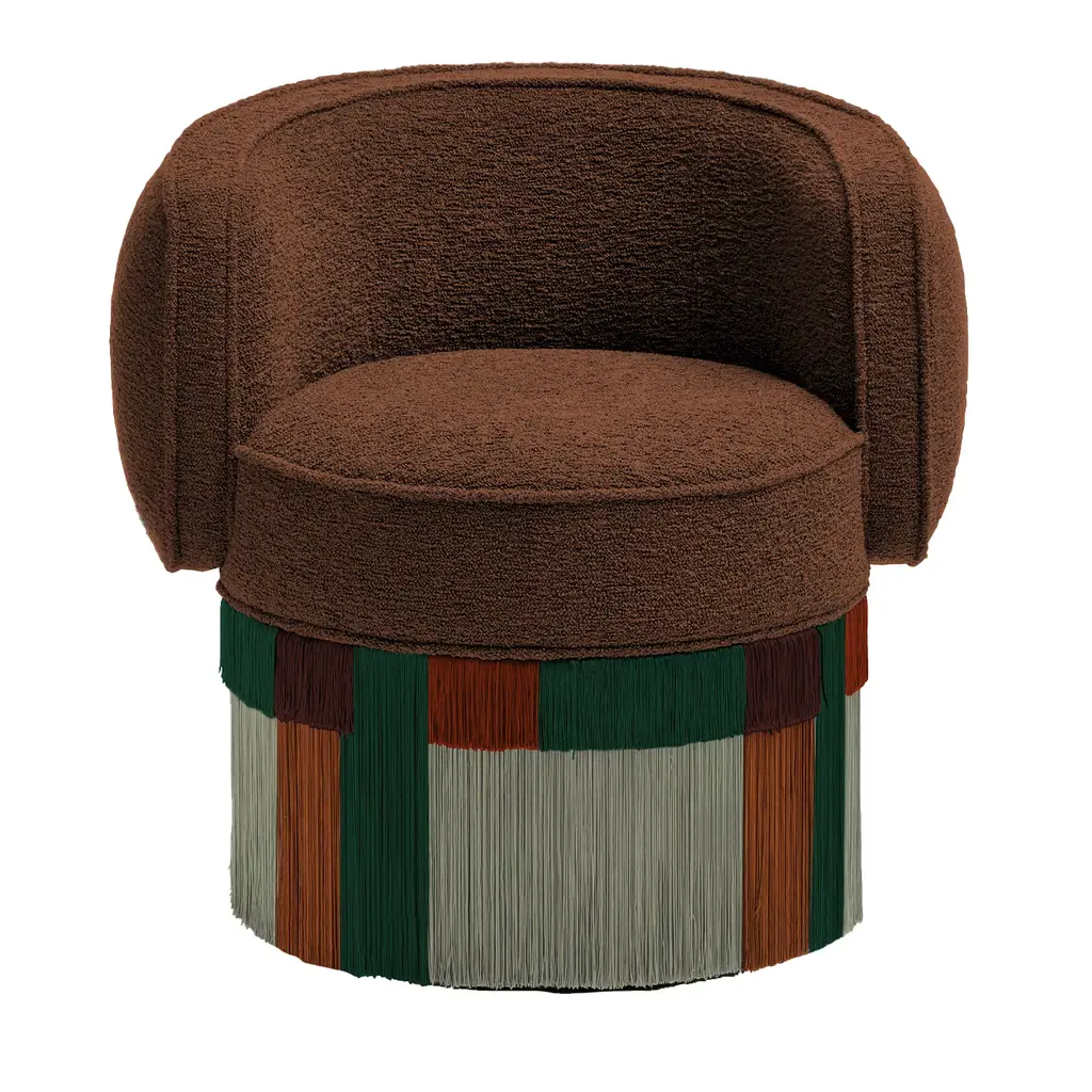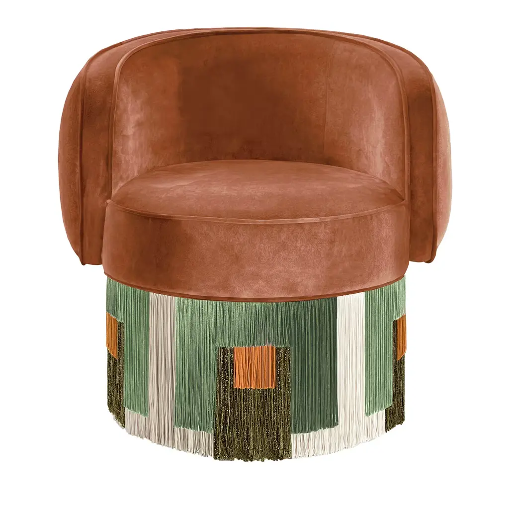 Marked by warm earthy hues, Pirouette Clu by Lorenza Bozzoli will give a vibrant touch to classic or modern interiors, especially when paired with other elements from the Collection. Entirely handcrafted by expert artisans, it showcases a cozy tub chair silhouette on a swivel metal base. Here shown upholstered in plush russet fabric, with an astonishing embellishment of chromatic effects in its floor-length fringe skirt. Color customizations available upon request to the Concierge.