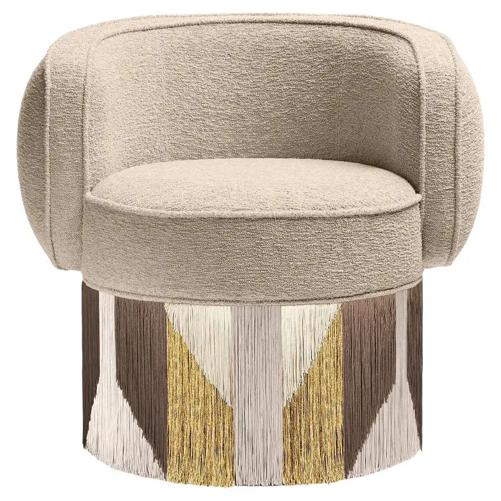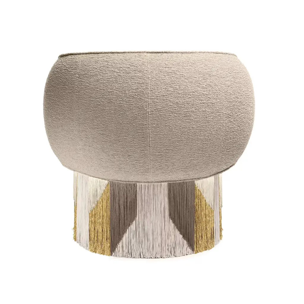Tribal roots and sartorial references blend in this swivel armchair, a refined artisan piece that will strike with its glamorous silhouette. Covered with beige boucle fabric and featuring a sturdy beech, the enveloping seat flaunts a triumph of viscose and lurex fringes around the base, all together outlining an eye-catching tribal-inspired pattern. Please contact the Concierge for color variants. Each bespoke piece is stamped on the bottom of the pouf’s lining and personally signed, numbered, and dated by designer.
