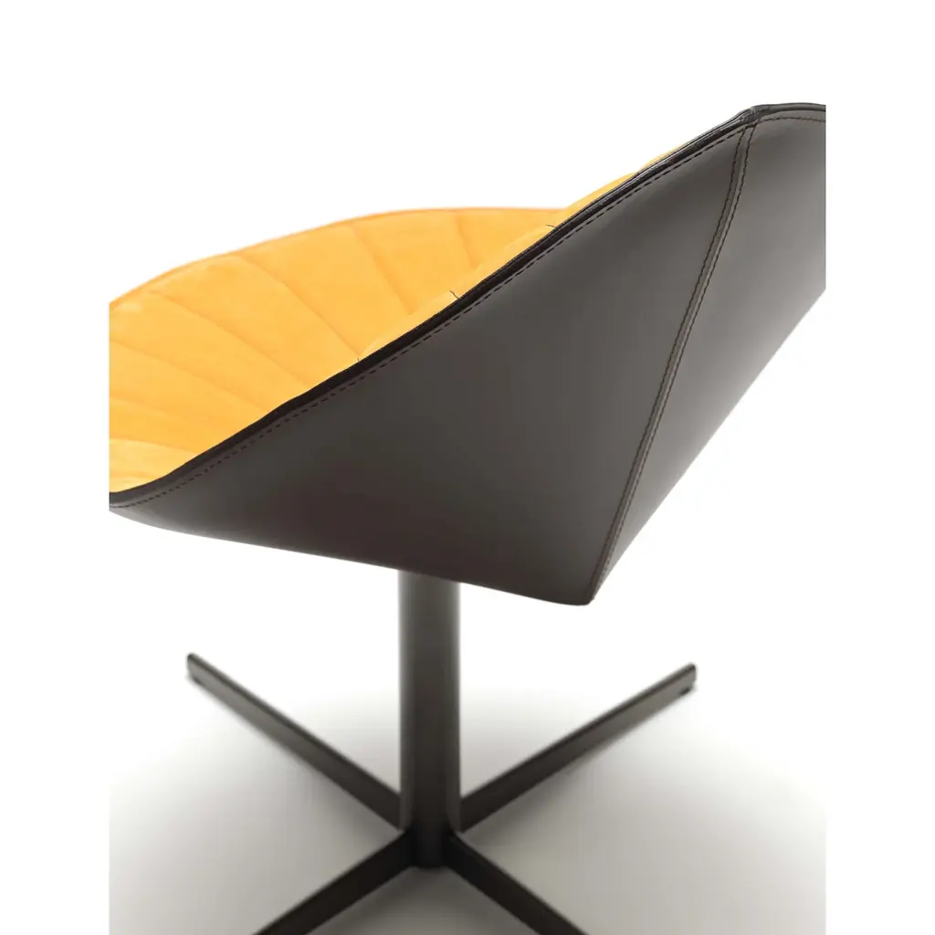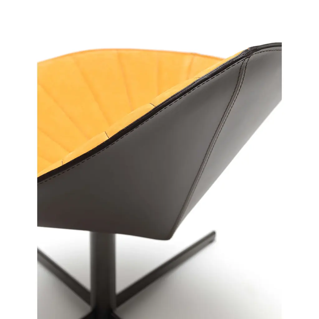 The Fiorile Plisse BC is a dining chair with a cross base, featuring a swivel design and fixed height, constructed from steel in various finishes. The seat and backrest shell is made of slightly padded steel sheet, internally upholstered in pleated premium leather and externally in full-grain leather or contrasting premium leather. The chair showcases elegance and ergonomics in a unique piece, entirely handcrafted. It is ideal for dining rooms and representative settings.