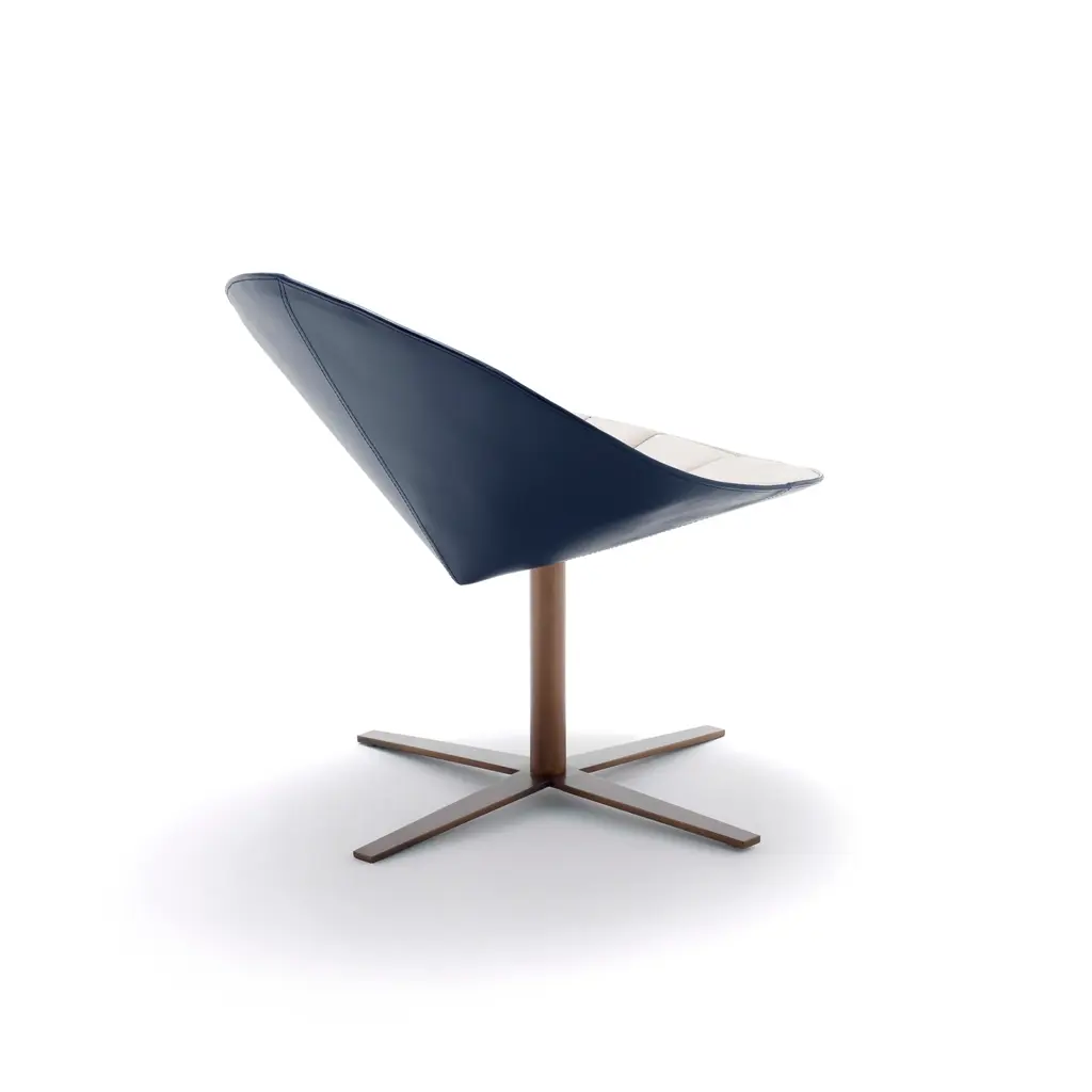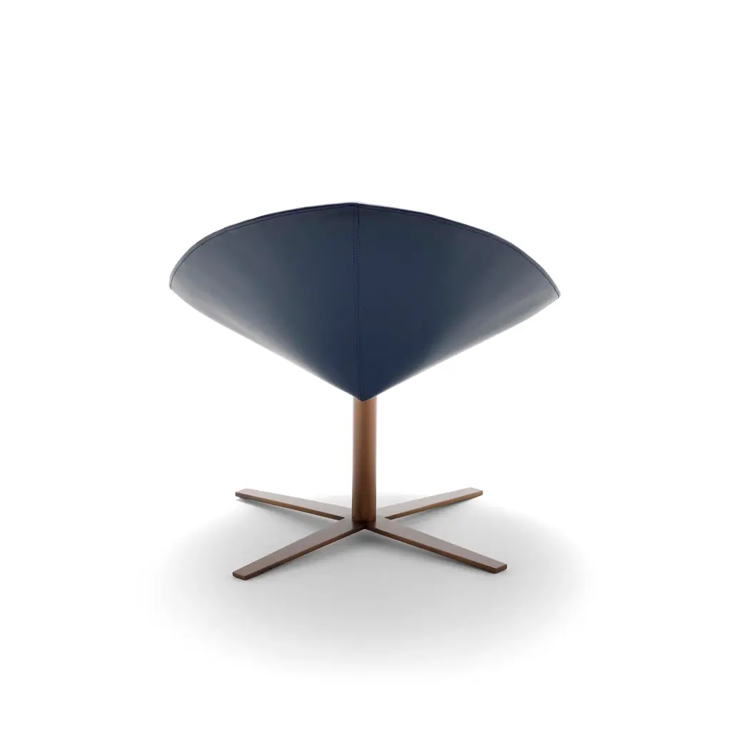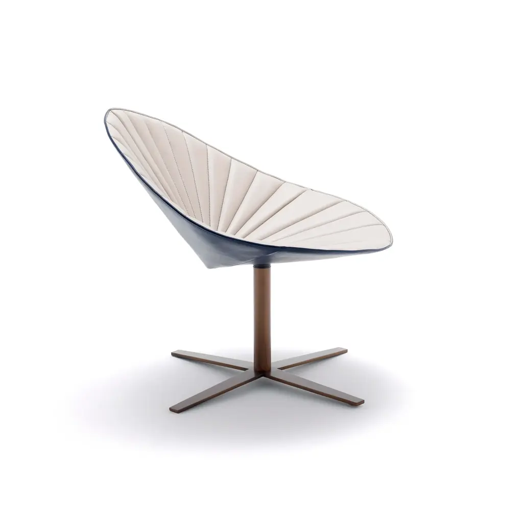 The Fiorile Lounge Plisse BC is a lounge chair with a cross base. The structure is a swivel design with a fixed height, made of steel in various finishes. The shell, crafted from a slightly padded steel sheet, is internally upholstered in pleated premium leather and externally in contrasting full-grain leather or premium leather. It brings refined elegance and a distinctive character to both residential and representative environments.