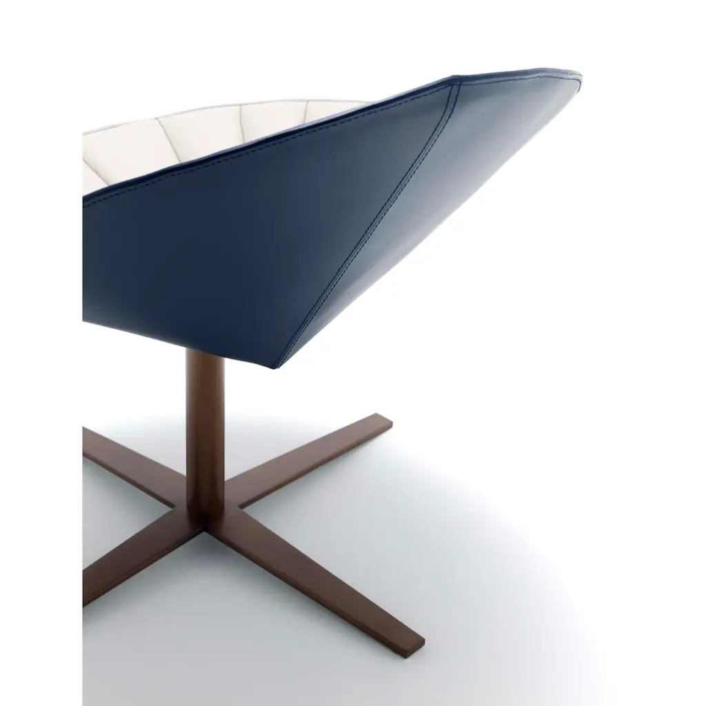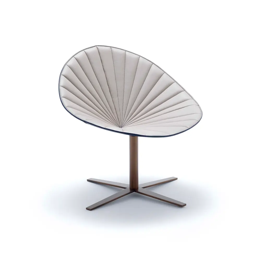 The Fiorile Lounge Plisse BC is a lounge chair with a cross base. The structure is a swivel design with a fixed height, made of steel in various finishes. The shell, crafted from a slightly padded steel sheet, is internally upholstered in pleated premium leather and externally in contrasting full-grain leather or premium leather. It brings refined elegance and a distinctive character to both residential and representative environments.