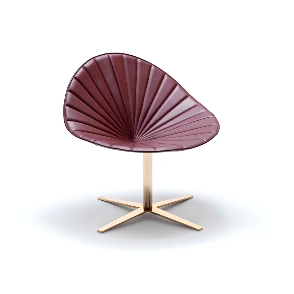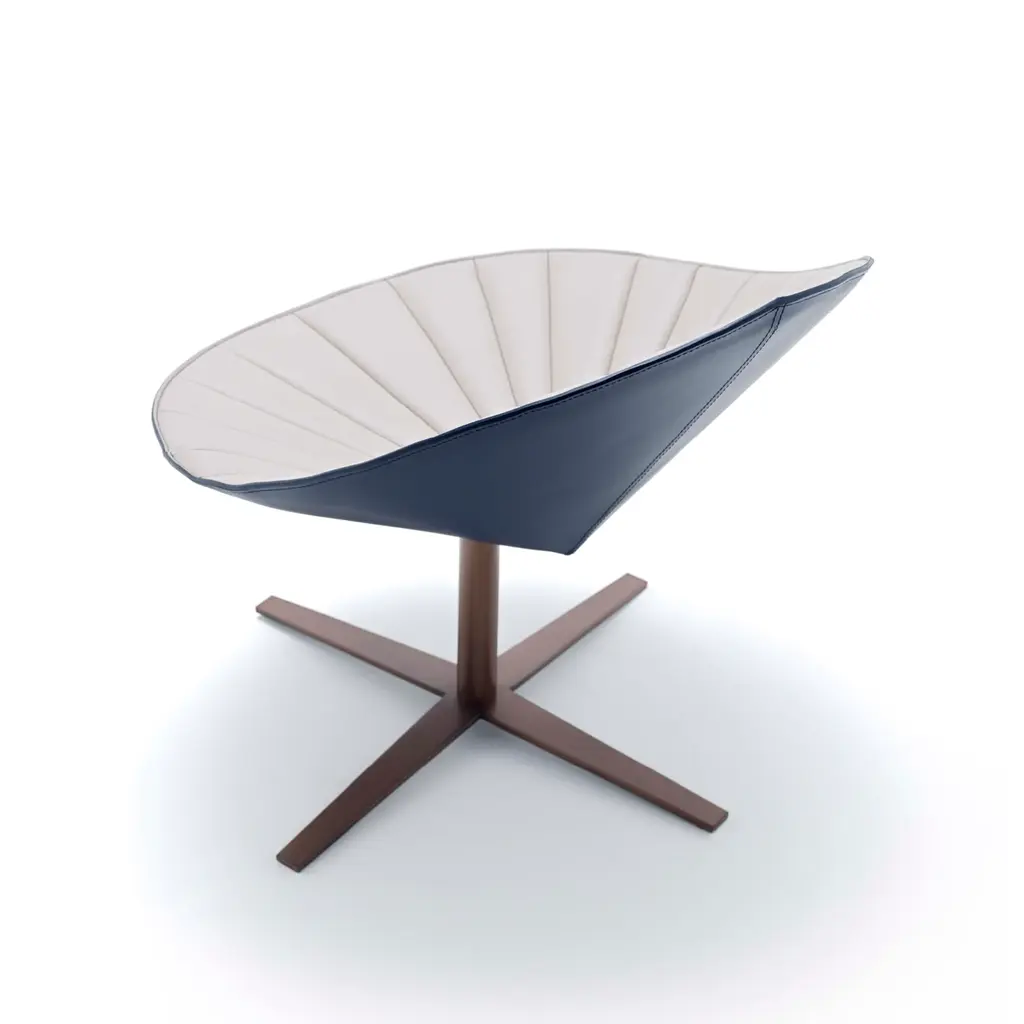 The Fiorile Lounge Plisse BC is a lounge chair with a cross base. The structure is a swivel design with a fixed height, made of steel in various finishes. The shell, crafted from a slightly padded steel sheet, is internally upholstered in pleated premium leather and externally in contrasting full-grain leather or premium leather. It brings refined elegance and a distinctive character to both residential and representative environments.