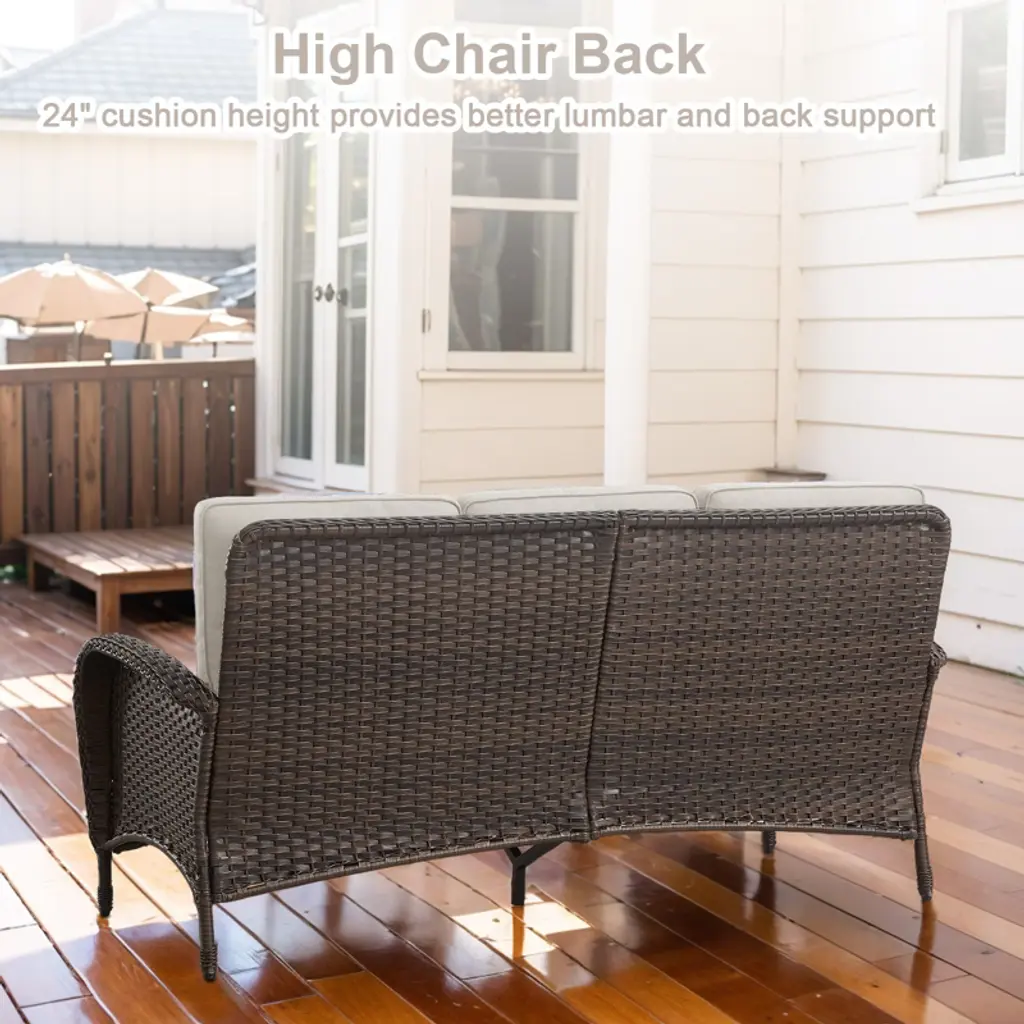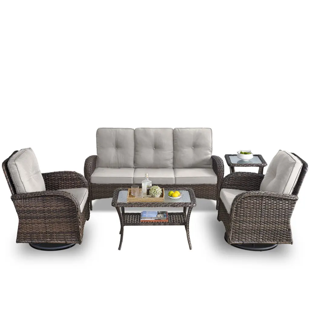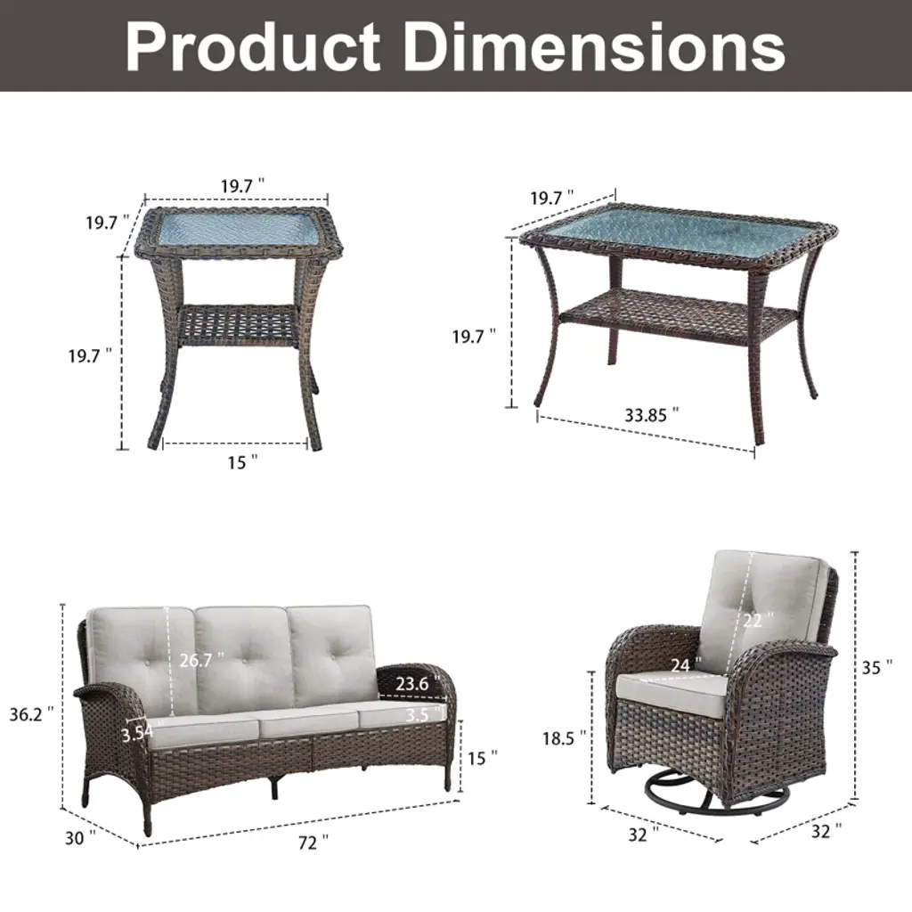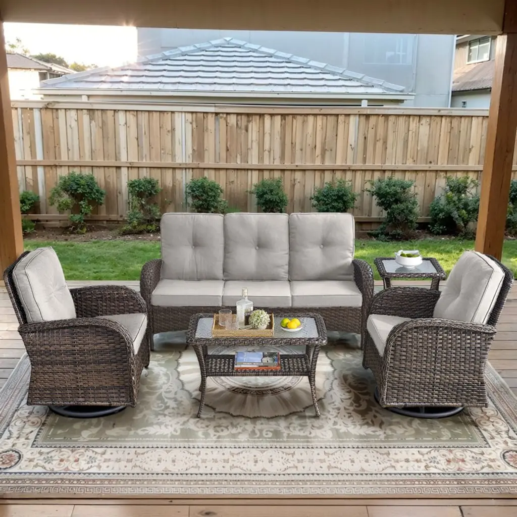 Elevate your outdoor living with the POCASSY 5-Piece Patio Furniture Set, designed for ultimate comfort and style. This all weather wicker furniture patio set includes a spacious 3-seater sofa, two swivel rocking patio chairs, a coffee table, and a side table - all crafted with hand-woven rattan and a durable powder-coated steel frame. The 3.54" thick seat cushions and 6" back cushions provide plush support, while the weather-resistant materials ensure long-lasting use. This versatile outdoor lounge set includes a matching powder-coated steel & tempered glass top coffee table, designed with a sleek, modern look and functional storage space - simply tuck the ottomans underneath for easy organization and a clutter-free setup. Perfect for creating a cozy retreat on your patio, balcony, or garden, this set combines functionality and sophistication for unforgettable moments with family and friends.