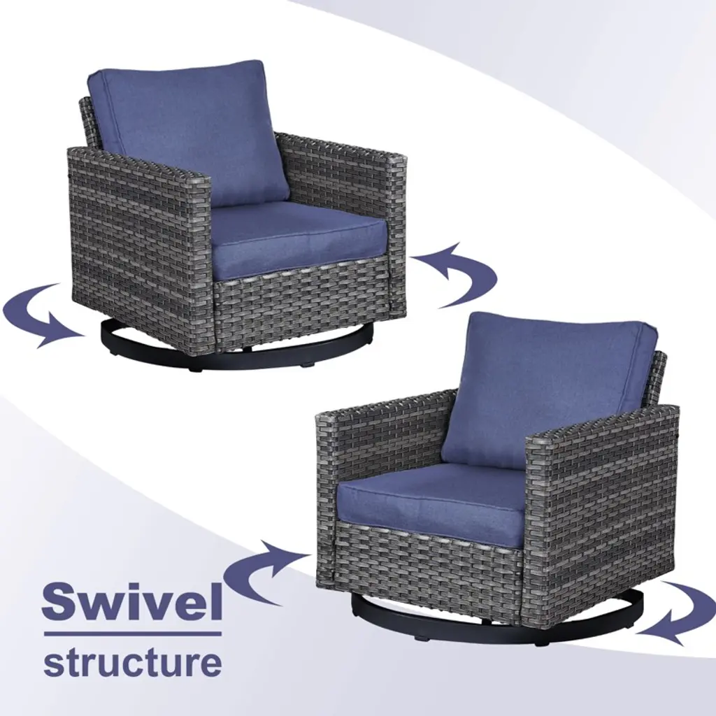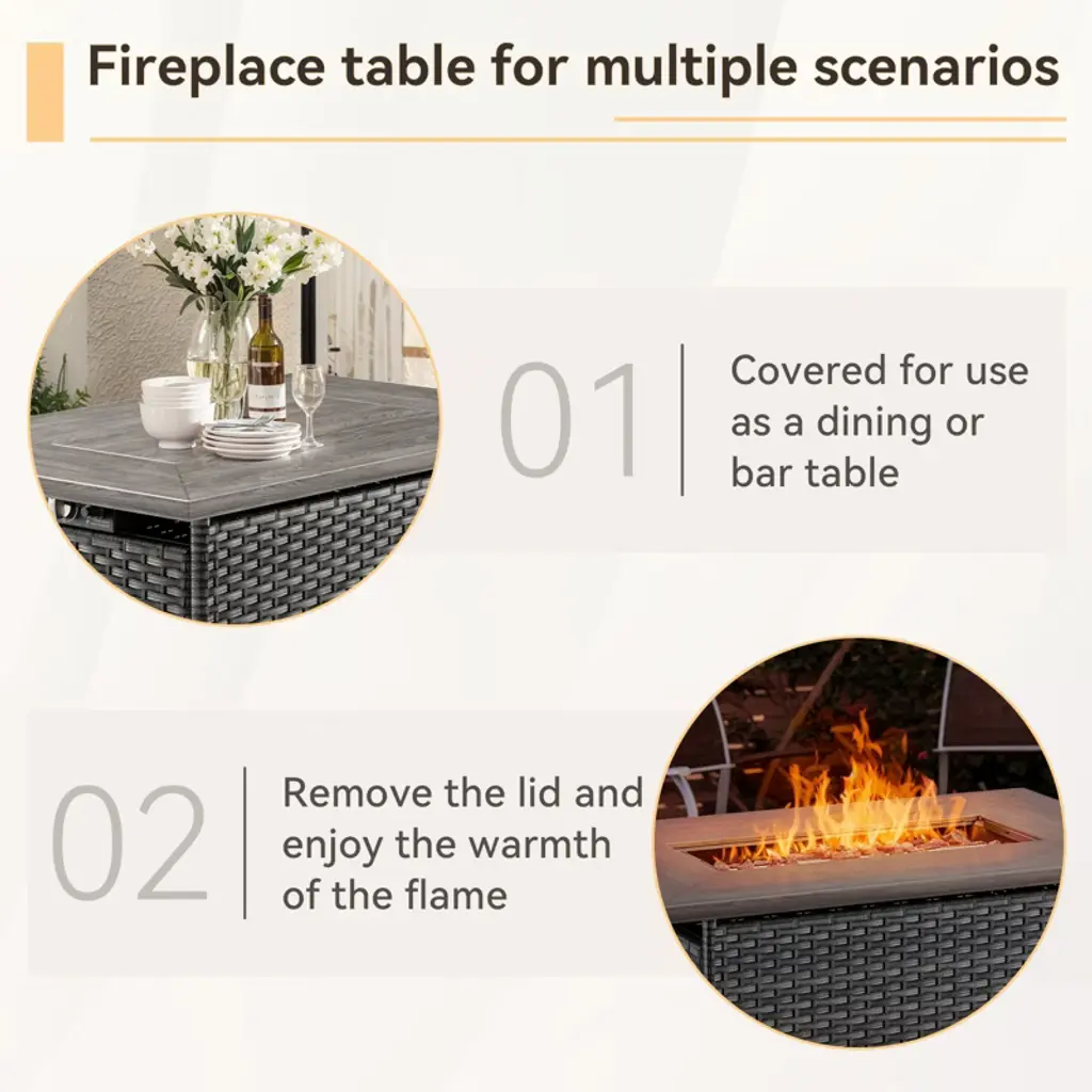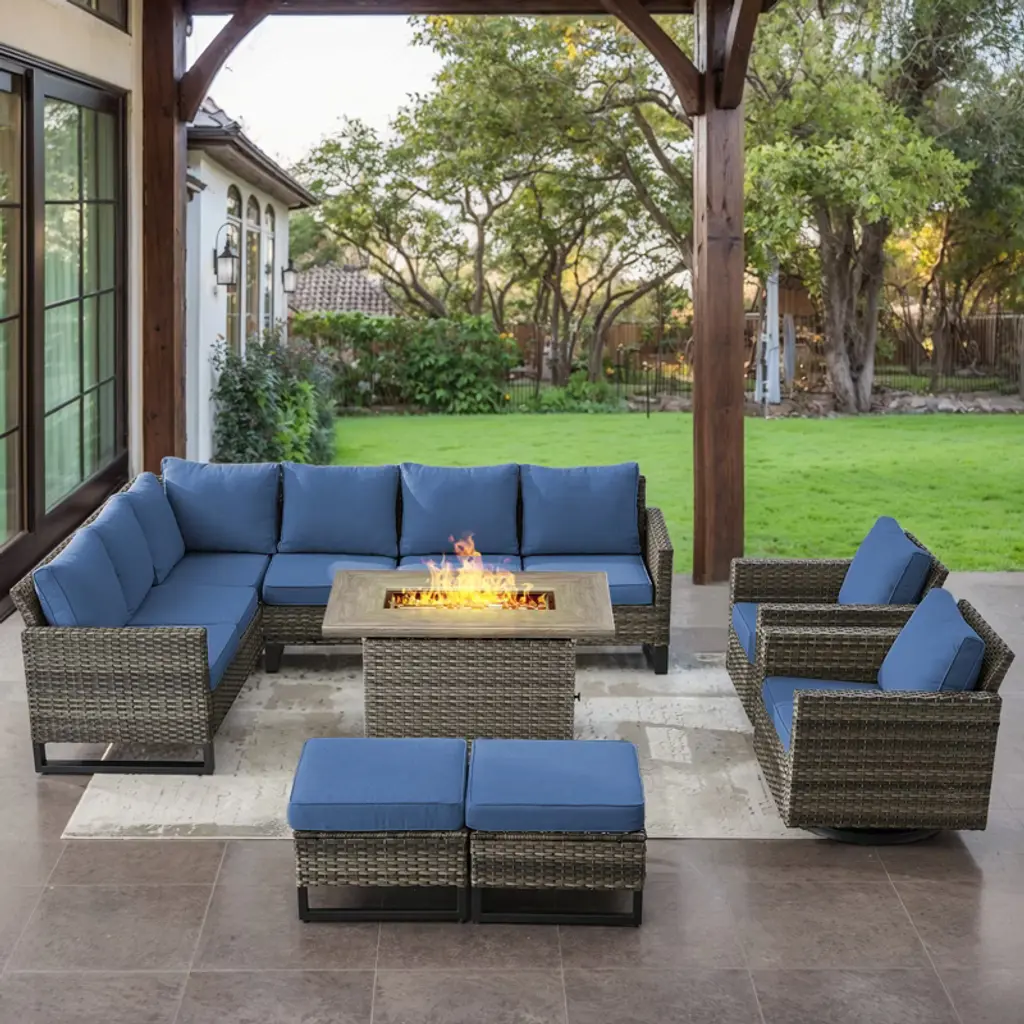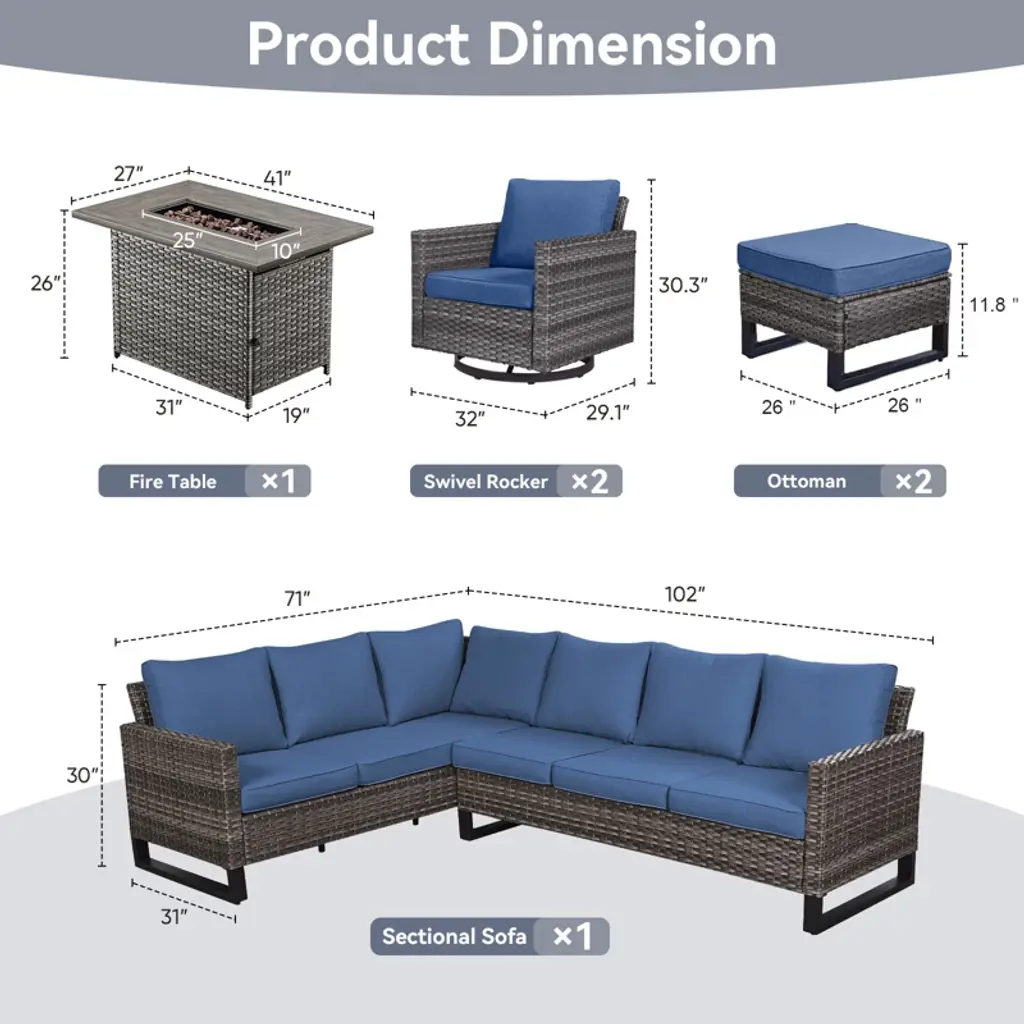 Introducing the POCASSY Sectional Outdoor Furniture Set with a fire pit table is making a grand entrance! This combo is perfect for lounging in your backyard. It includes an L-shaped sectional sofa, two outdoor wicker rocking swivel chairs, and a spacious 41-inch, rectangle 50000 BTU propane fire pit table. Built with a sturdy powder-coated steel frame and wrapped in stylish hand-woven PE wicker, it's not only durable but also a real looker. The fire pit table comes with a handy lid. So, you can stay warm on chilly winter nights and effortlessly flip it into a table in the summer. Whether you're roasting marshmallows or sipping a drink with friends, this sectional sofa couch set is the ultimate upgrade for American family outdoor activities.