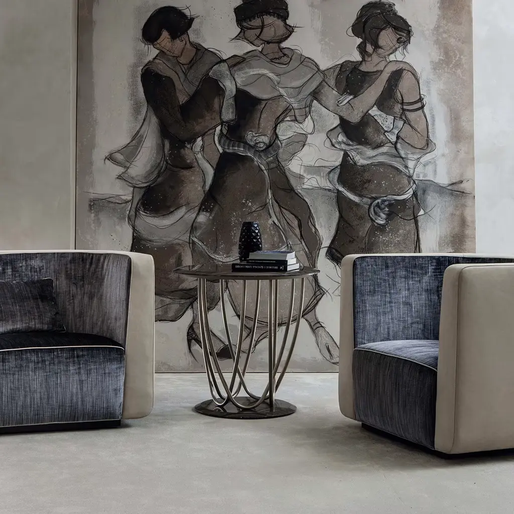An enveloping, well-proportioned shape and an elegant mix of leather and fabric define this armchair. The semicircular silhouette - a continuous line from armrests to backrest - creates an especially welcoming feel, echoed in the blue-gray velvet upholstery of the seat cushion and interior profile. Outside, the leather upholstery is in a coordinating gray color. A concealed swivel base supports this remarkable armchair that will easily fit in any interior decor, from living room, bedroom, to a private study.