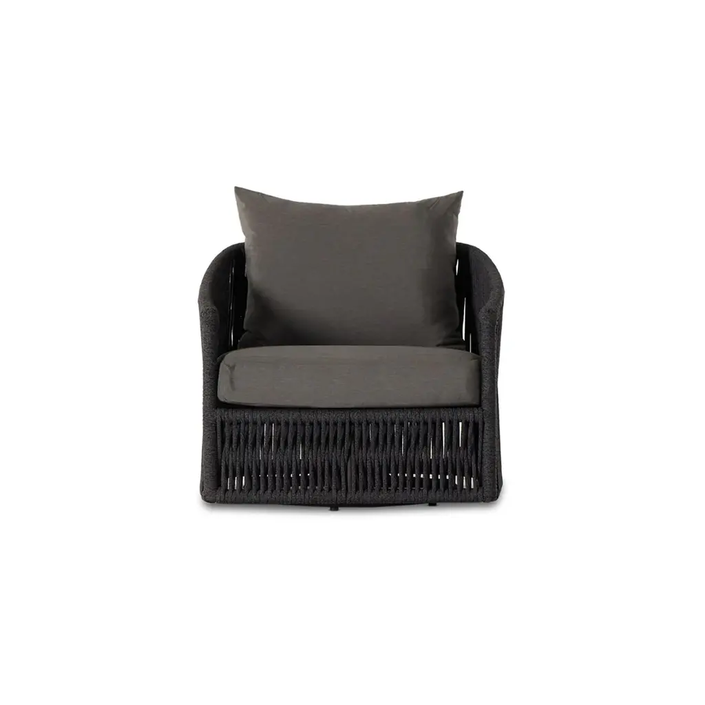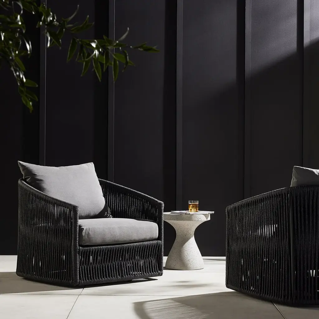 A beautiful rope-based design is woven across a durable, 360-swivel aluminum frame in a rich bronze finish. Topped with a wide cushion and throw pillow, all upholstered in 100% olefin, known for its UV-resistant, water-repellent and quick-drying abilities. Cover or store indoors during inclement weather and when not in use. Ships In 10-14 Business Days All-weather cushions Woven rope frame This image is for illustrative purposes only. The colors shown are accurate within the constraints of lighting, photography, and the color accuracy of your screen.