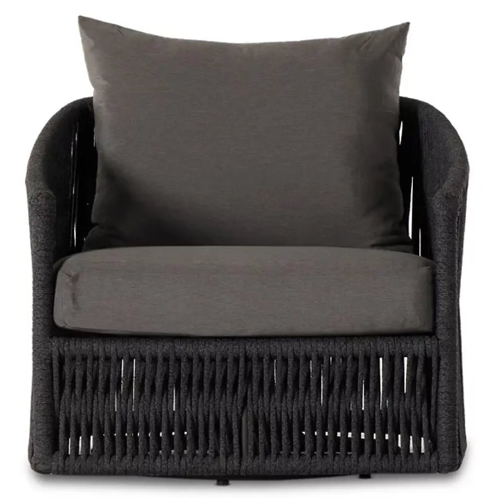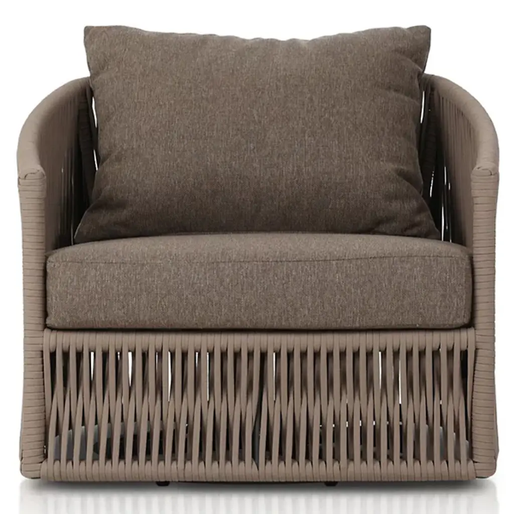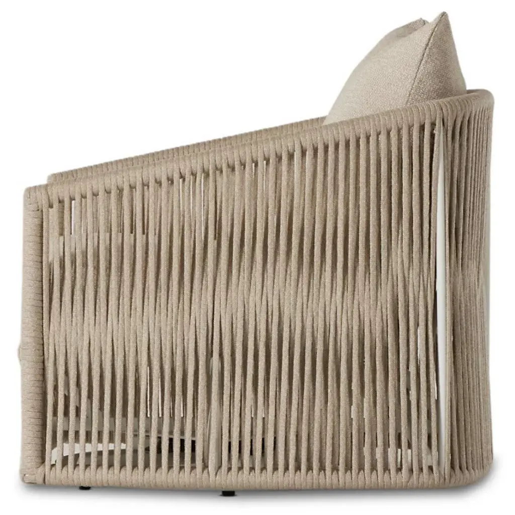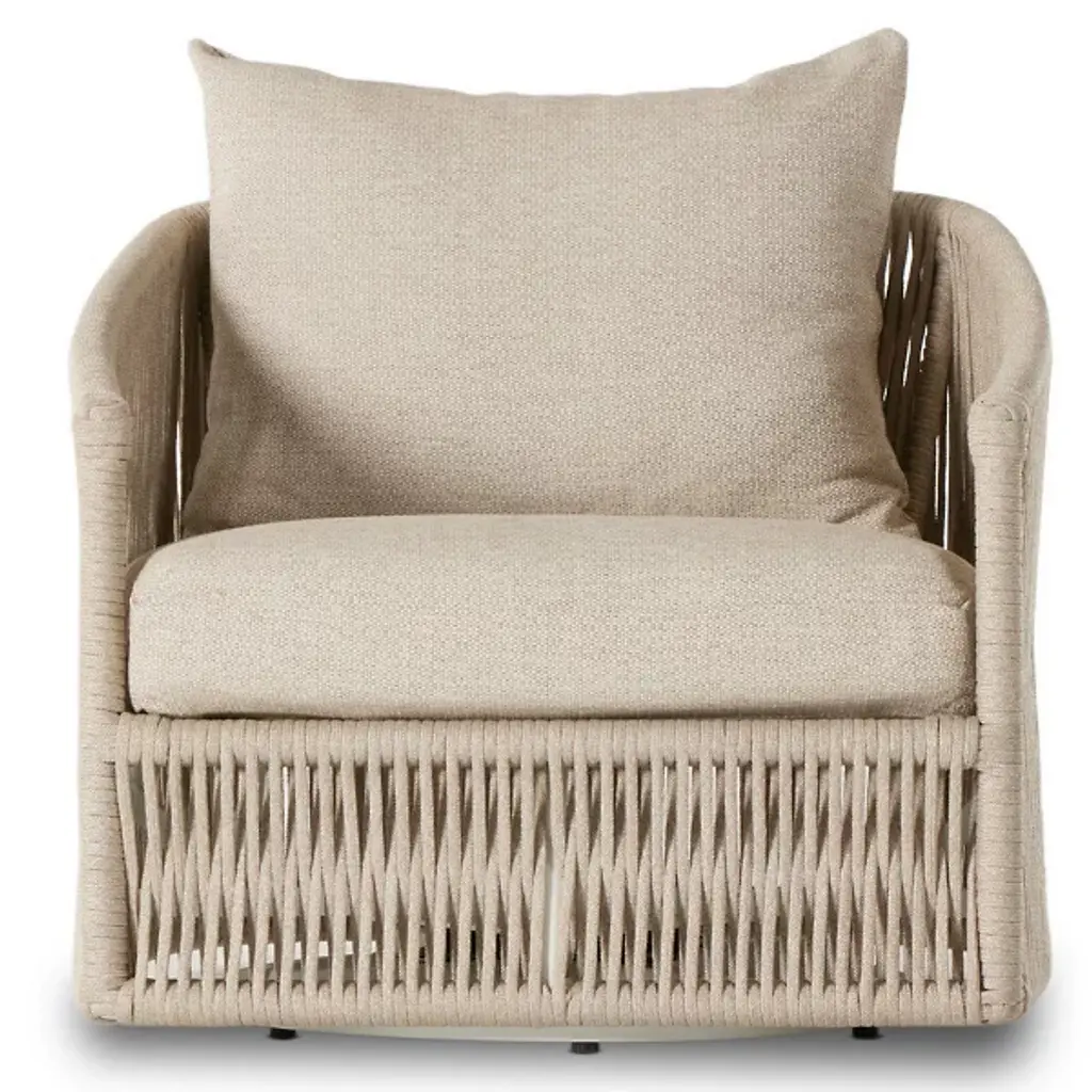 The Porto Outdoor Swivel Chair from Four Hands is intricately woven around a sturdy 360-degree swivel aluminum frame, finished in a rich bronze hue. The chair is topped with a wide, comfortable cushion and an accent throw pillow, both upholstered in 100% olefin fabric, celebrated for its UV-resistant, water-repellent, and quick-drying properties. Perfect for outdoor lounging, this stylish piece blends durability and comfort. Cover or store it indoors to maintain its longevity during inclement weather or when not in use.