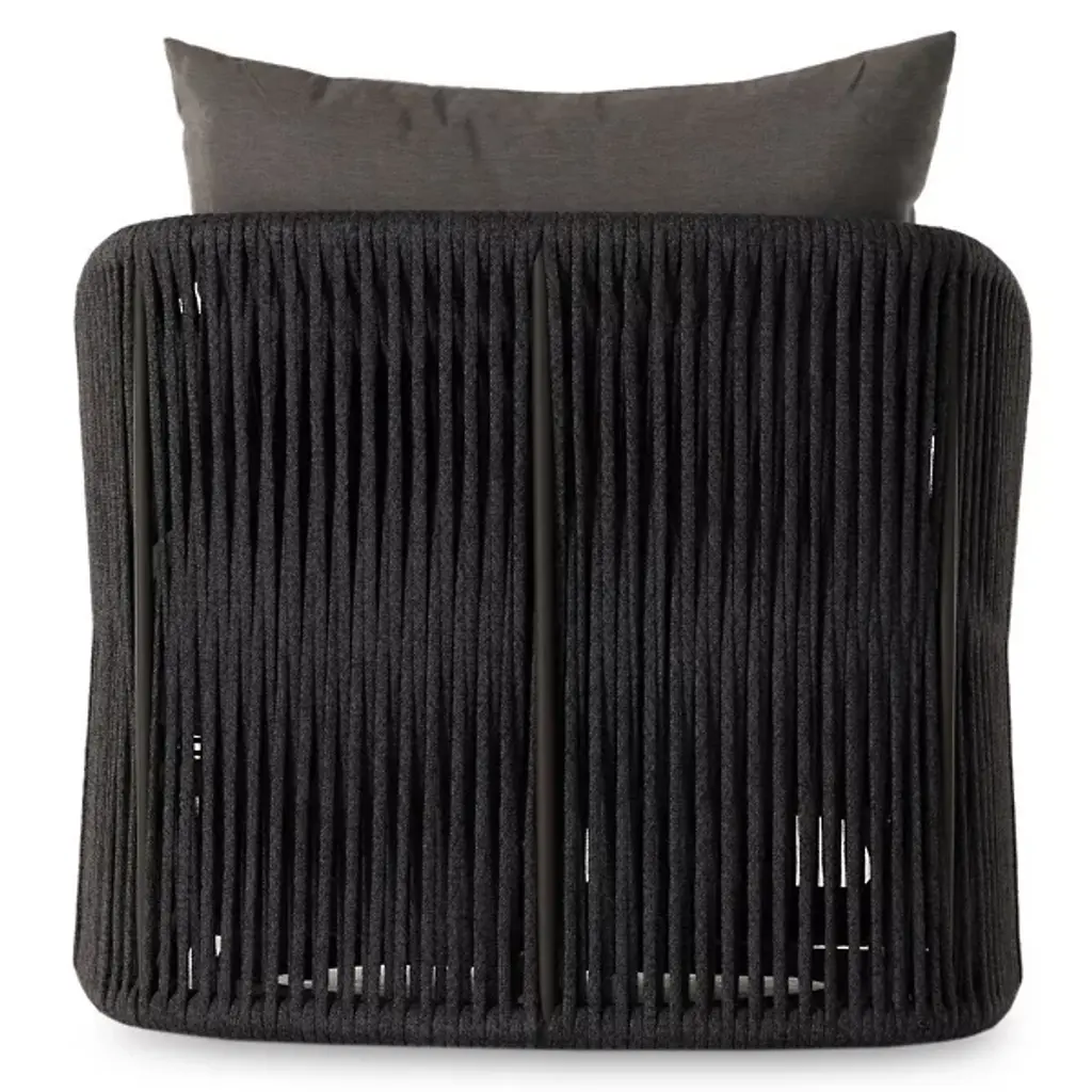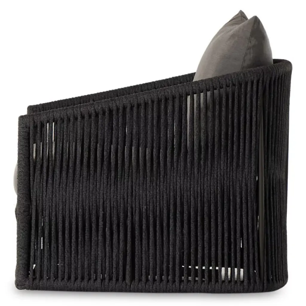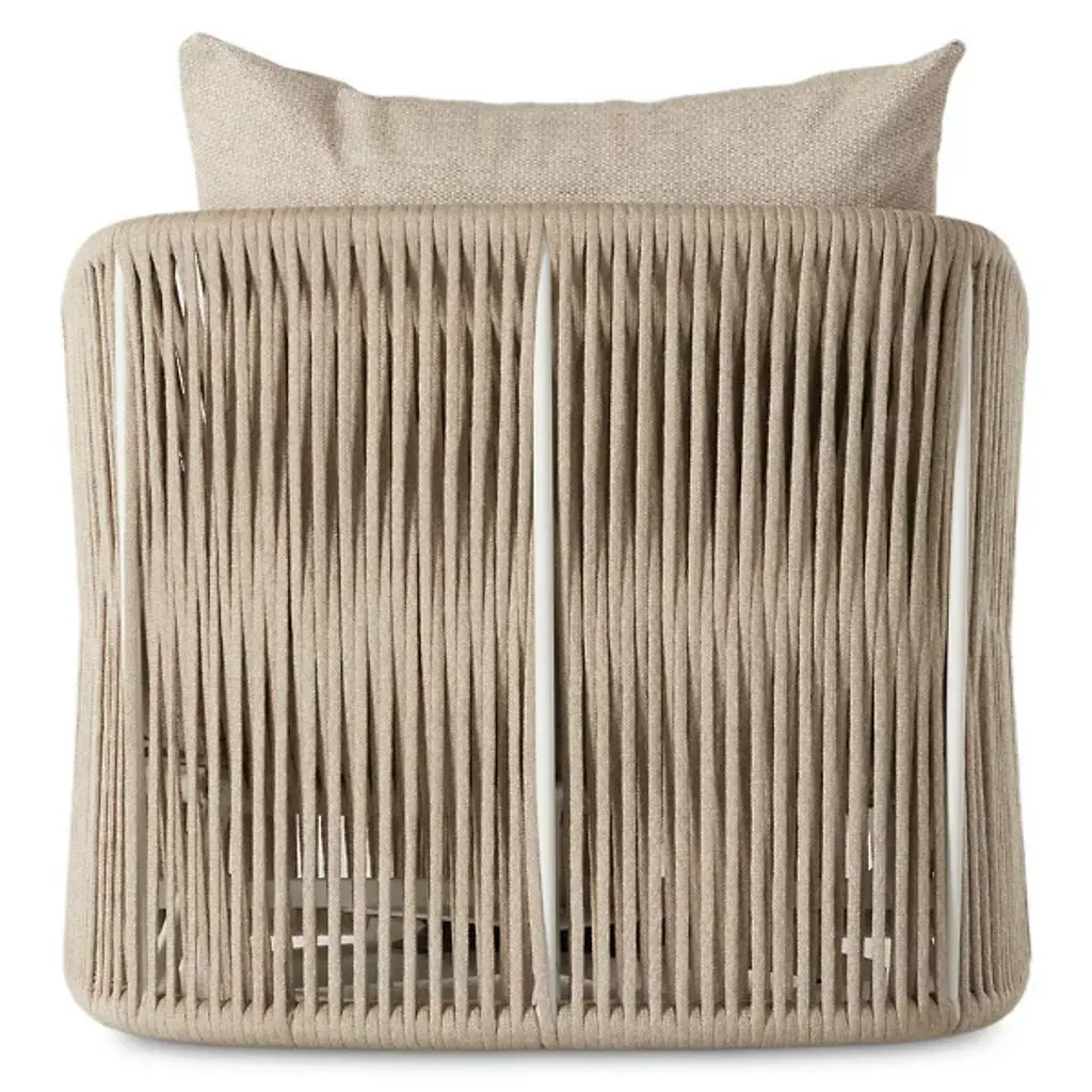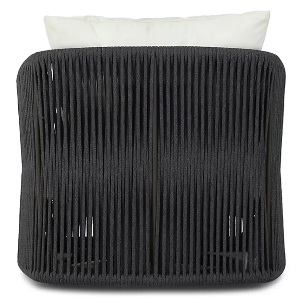 The Porto Outdoor Swivel Chair from Four Hands is intricately woven around a sturdy 360-degree swivel aluminum frame, finished in a rich bronze hue. The chair is topped with a wide, comfortable cushion and an accent throw pillow, both upholstered in 100% olefin fabric, celebrated for its UV-resistant, water-repellent, and quick-drying properties. Perfect for outdoor lounging, this stylish piece blends durability and comfort. Cover or store it indoors to maintain its longevity during inclement weather or when not in use.