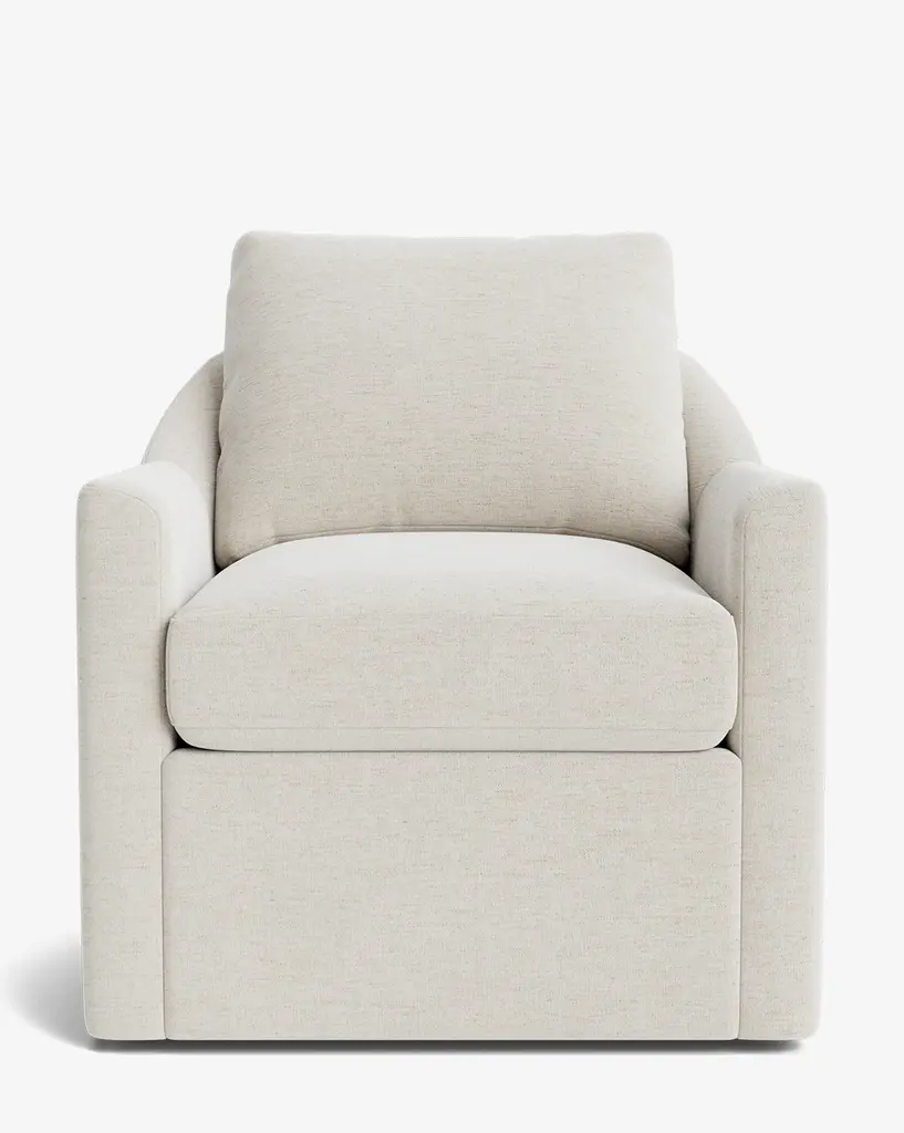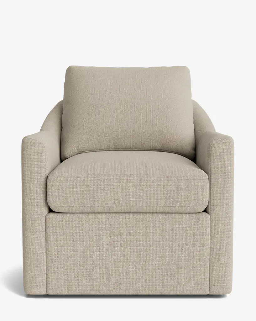 Balancing modern design with classic elements, our Quinnton Swivel Chair was designed with luxury in mind. Featuring feather blend cushions held by its bench-made frame, the swivel chair is both sophisticated and inviting. The chair is customizable in a wide array of fabrics, allowing you to personalize your space.