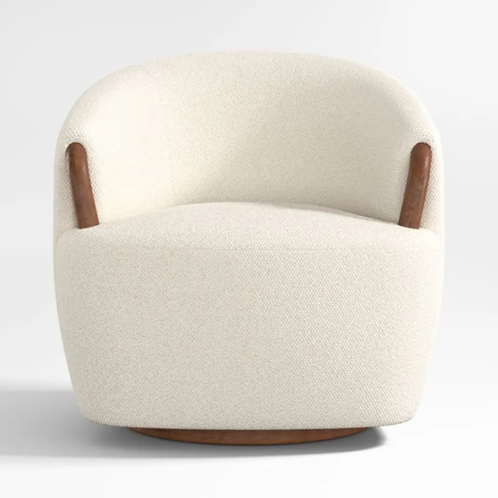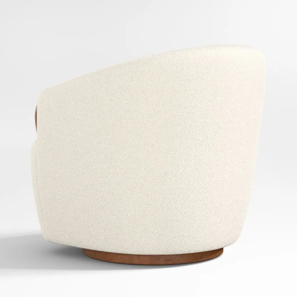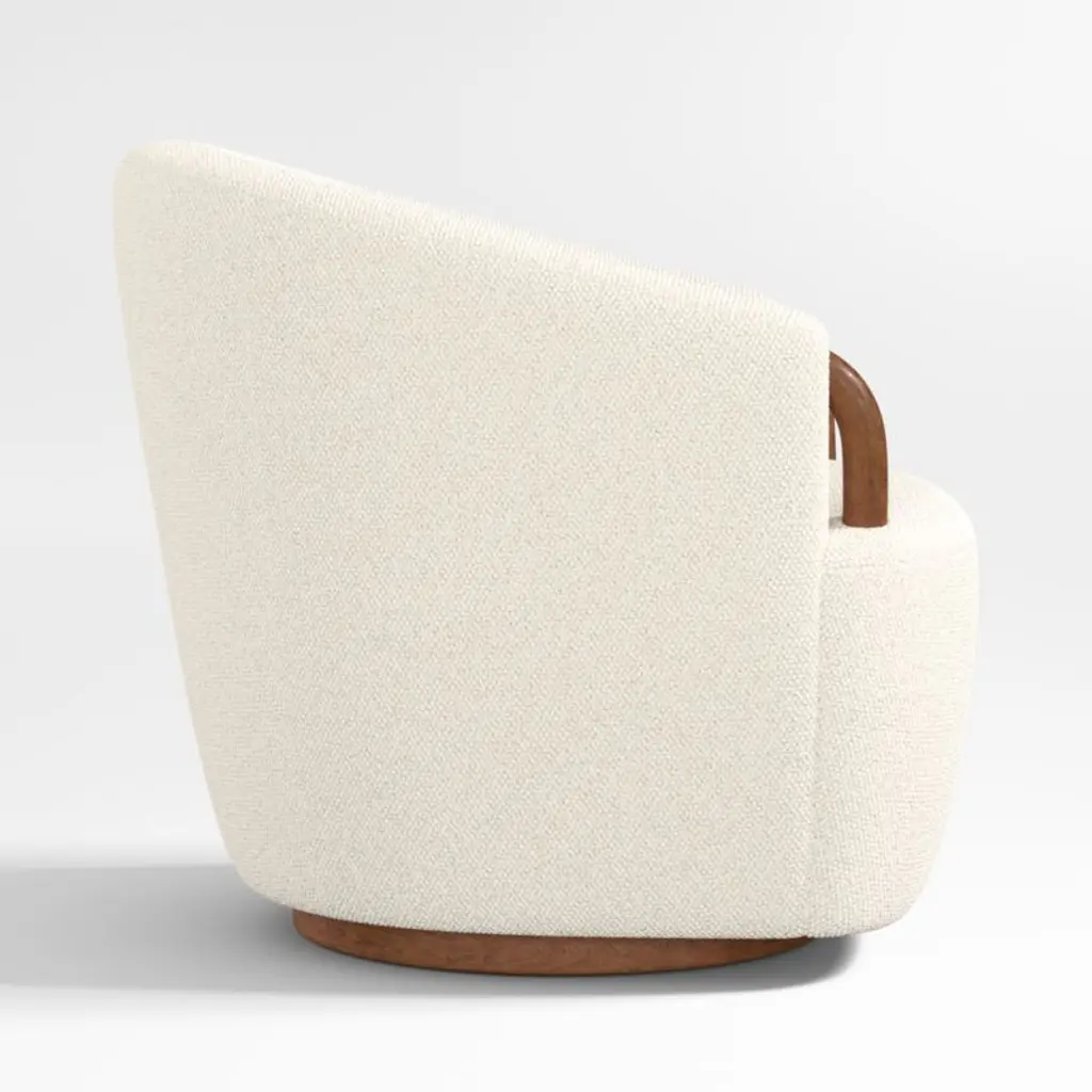 Rapello's embracing contours imbue modern minimalism with luxury, comfort and the relaxed ease of a swivel chair. Tight styling gives a seamless look accentuating the illusion that the back is draping over the exposed oak arms. A nubby ivory weave makes the most of the chair's sleek silhouette, enhancing the enveloping contours with visual and tactile texture. The recessed oak swivel base lets the chair float while turn to follow conversation or get a full view of the room.