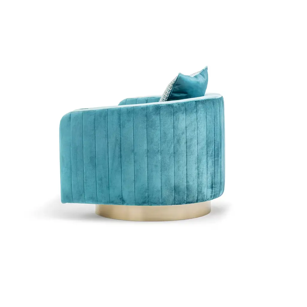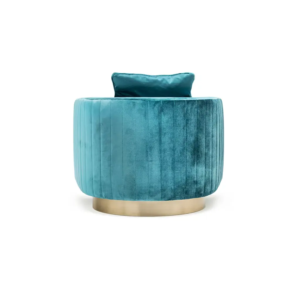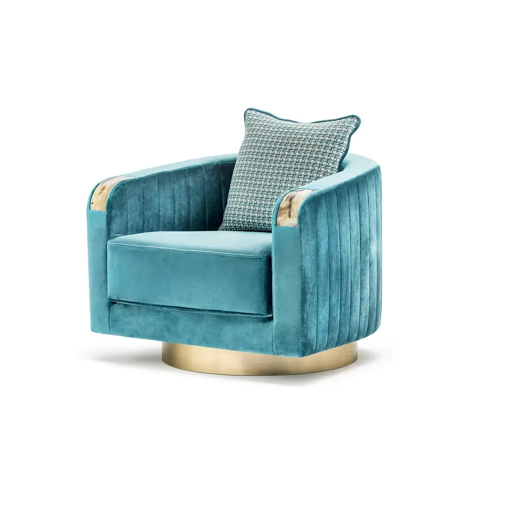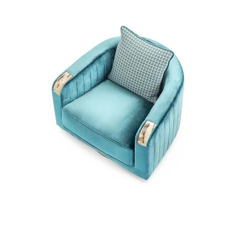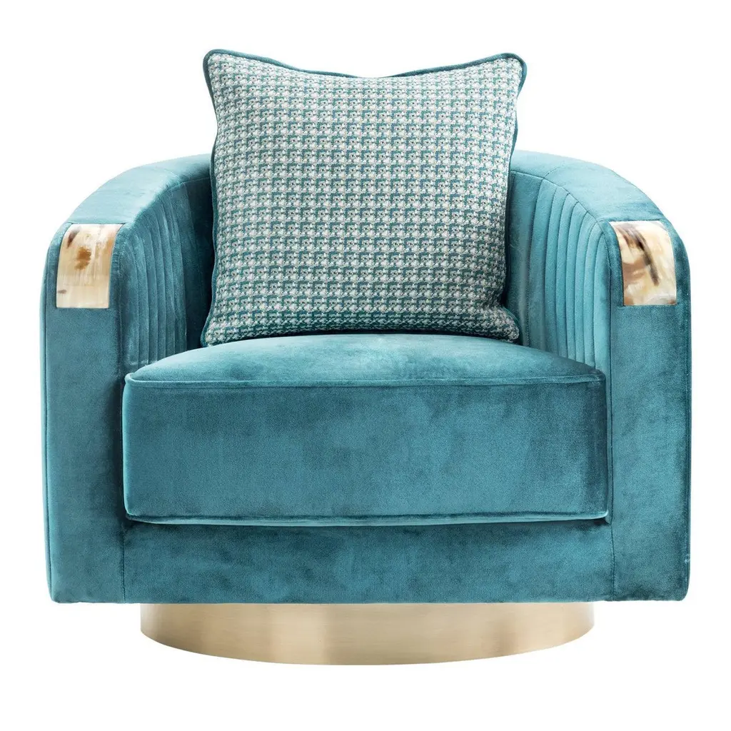 Designed by Filippo Dini, the Rea Swivel armchair is a glorious vision in ottanium colored Splendido velvet. With exquisite curved horn armrests, a wooden base with satin brass effect and a ribbed back and armrests, the chair is also comfortably padded in high quality polyurethane foam, goose down and memory foam.