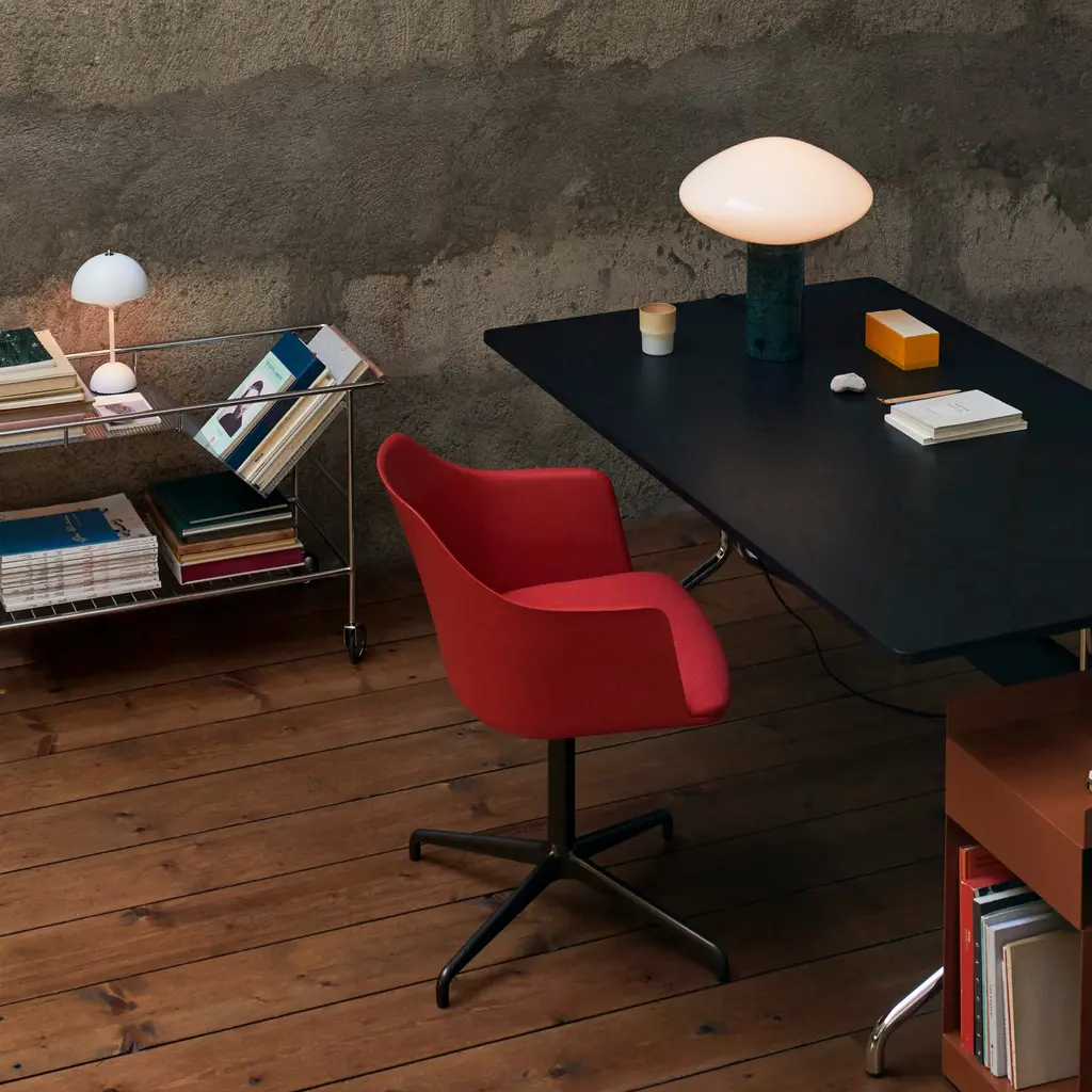 The ease and utility of a swivel base with automatic return complements the comfortable contours of Hee Welling’s sustainable armchair with a custom-upholstered seat. Rely's molded shell is made from 100% recycled plastic and curves around the body, extending out along the side to provide optimal back support. The foam-fill seat offers a range of coverings in fine textiles or leather to go with the choice of chair colors and the extruded aluminum base in black or bronzed finish.