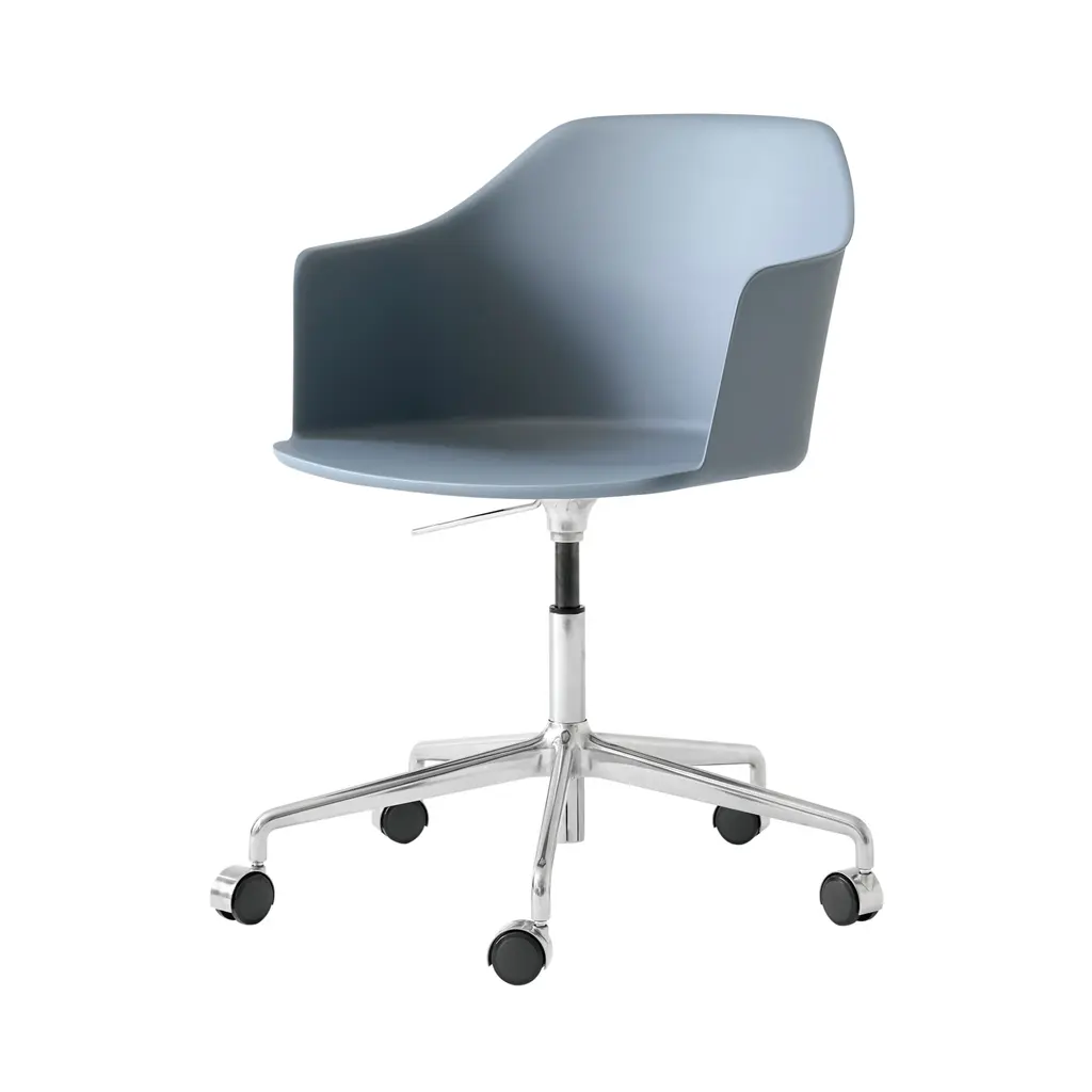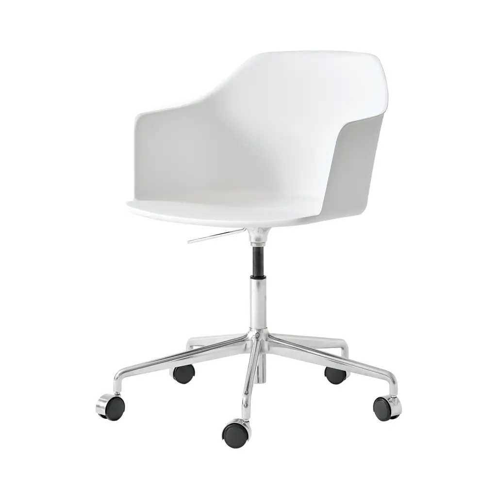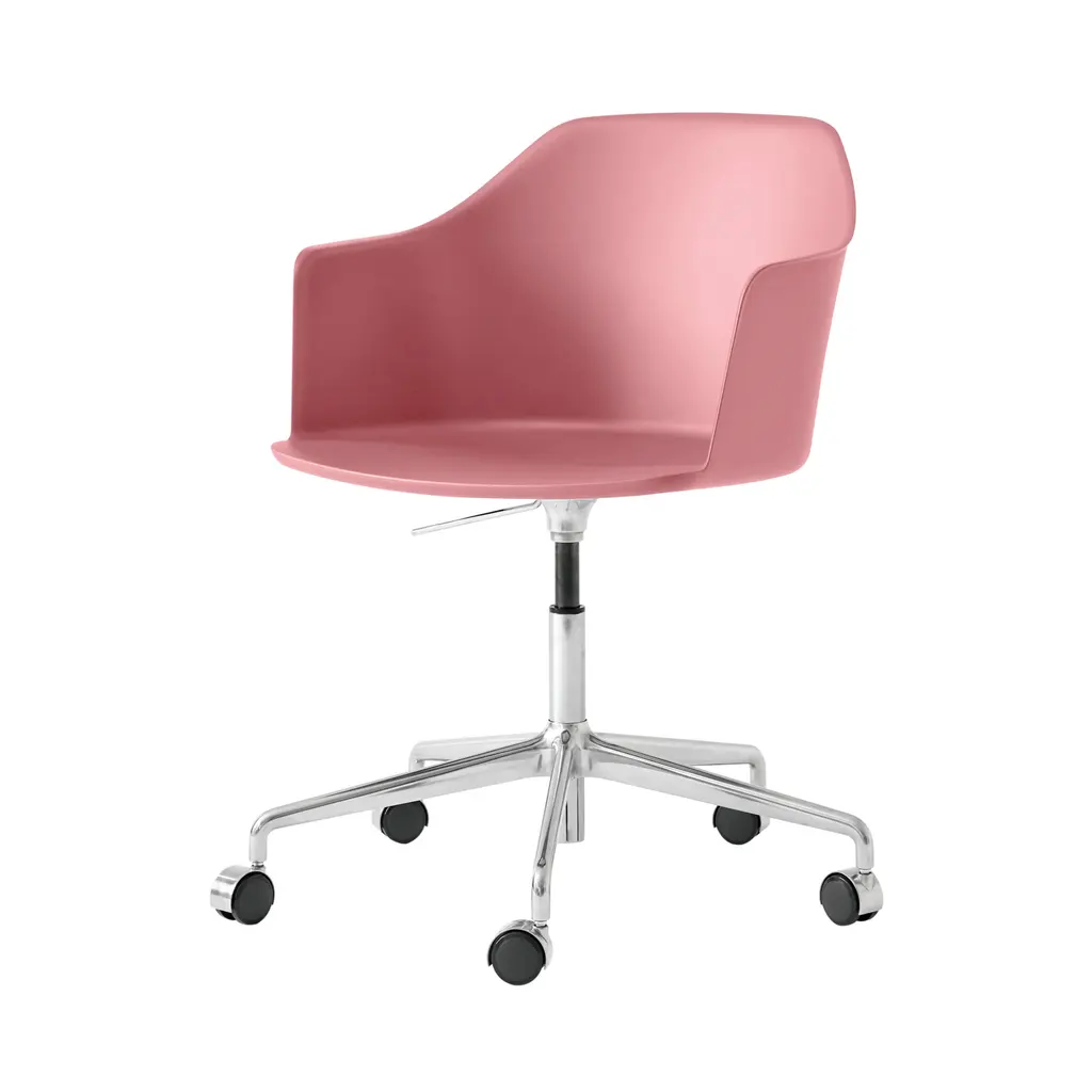 With convenience and utility in mind, &Tradition offers its sustainable molded armchair with automatic gas lift and a 5-star rolling base with castors. Designer Hee Welling's breakthrough take on Scandi molded seating is made from 100% recycled polypropylene, curving around the body and extending out along the sides for comfortable back support. The swivel base with castors is made from extruded aluminum, in a polished finish or black powder coat.
