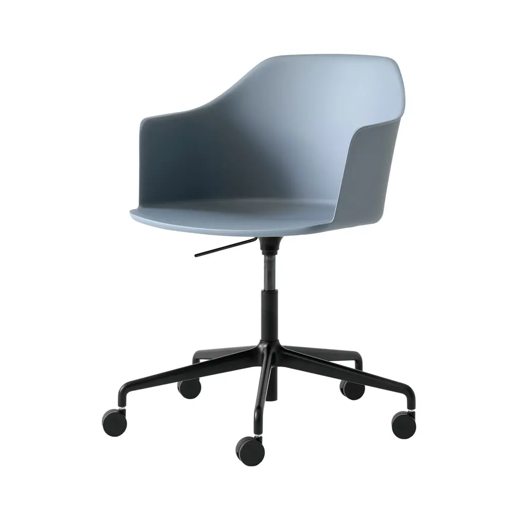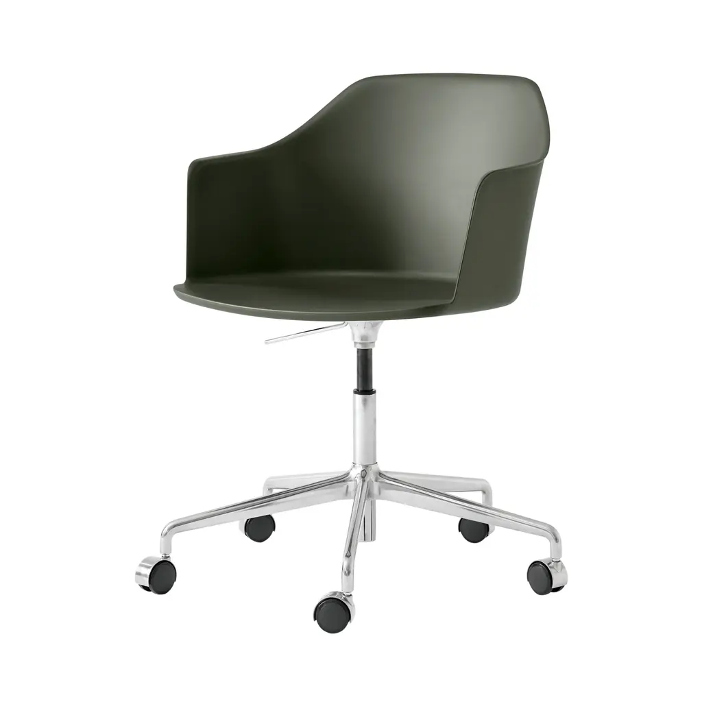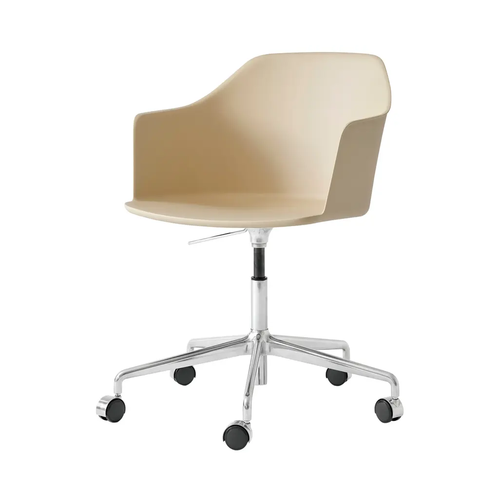 With convenience and utility in mind, &Tradition offers its sustainable molded armchair with automatic gas lift and a 5-star rolling base with castors. Designer Hee Welling's breakthrough take on Scandi molded seating is made from 100% recycled polypropylene, curving around the body and extending out along the sides for comfortable back support. The swivel base with castors is made from extruded aluminum, in a polished finish or black powder coat.