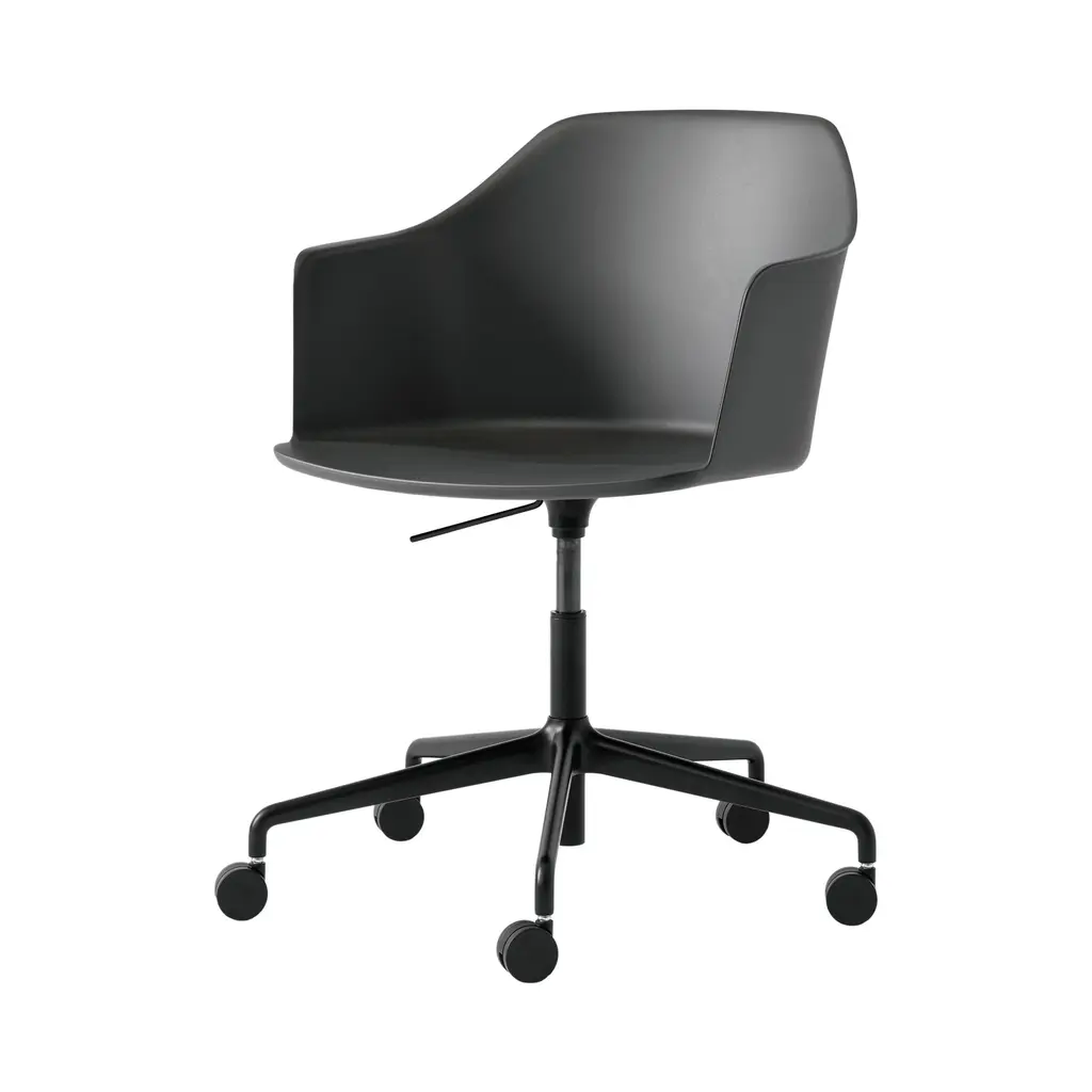 With convenience and utility in mind, &Tradition offers its sustainable molded armchair with automatic gas lift and a 5-star rolling base with castors. Designer Hee Welling's breakthrough take on Scandi molded seating is made from 100% recycled polypropylene, curving around the body and extending out along the sides for comfortable back support. The swivel base with castors is made from extruded aluminum, in a polished finish or black powder coat.