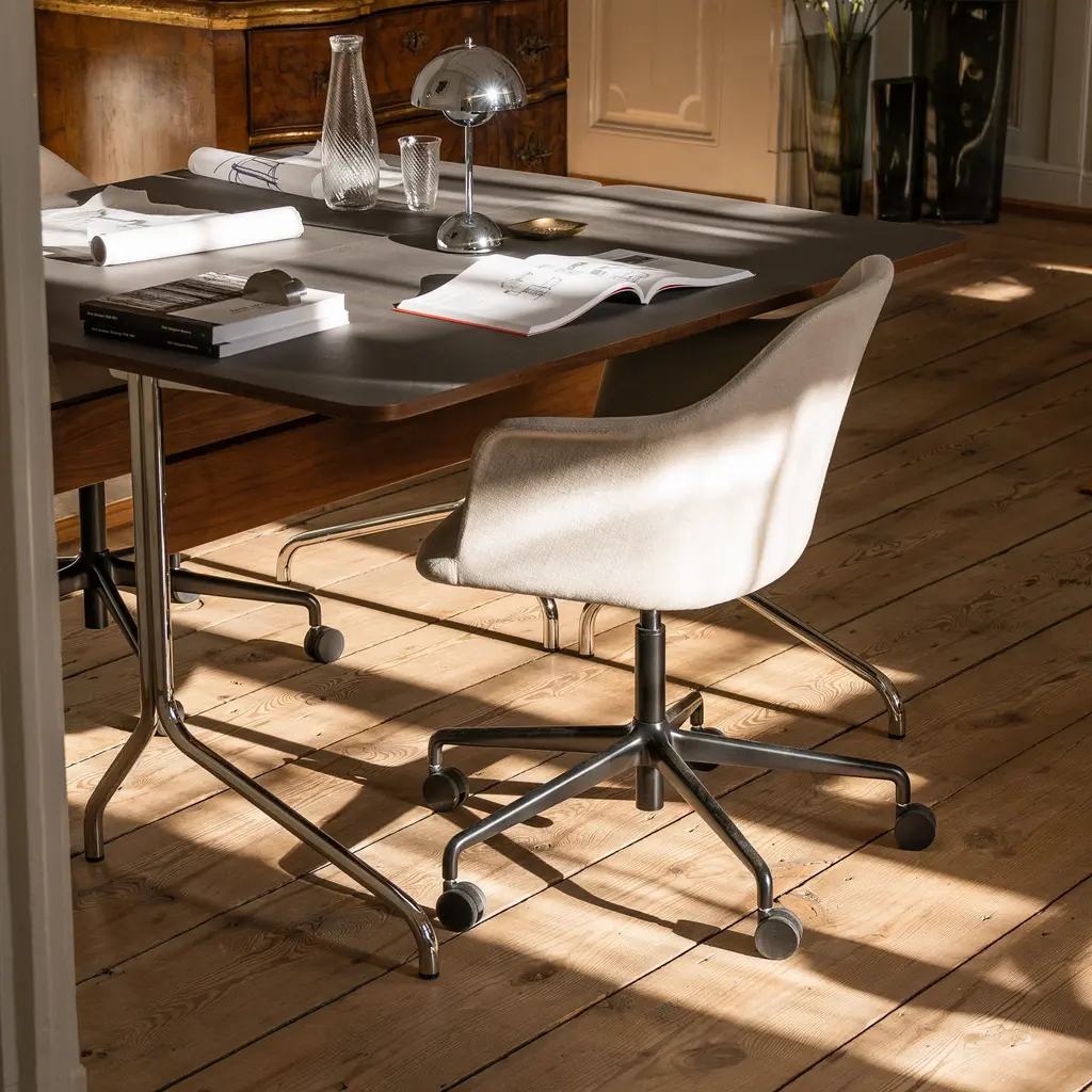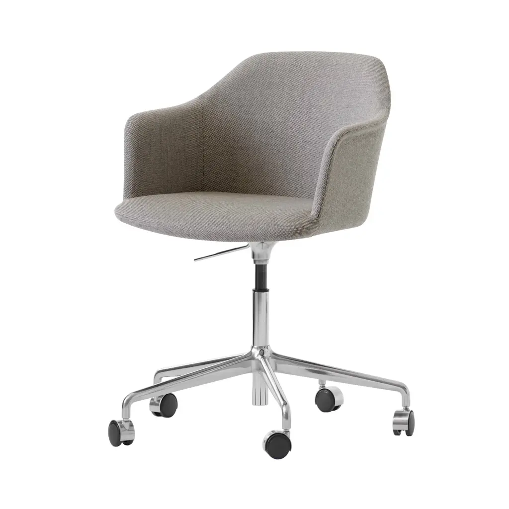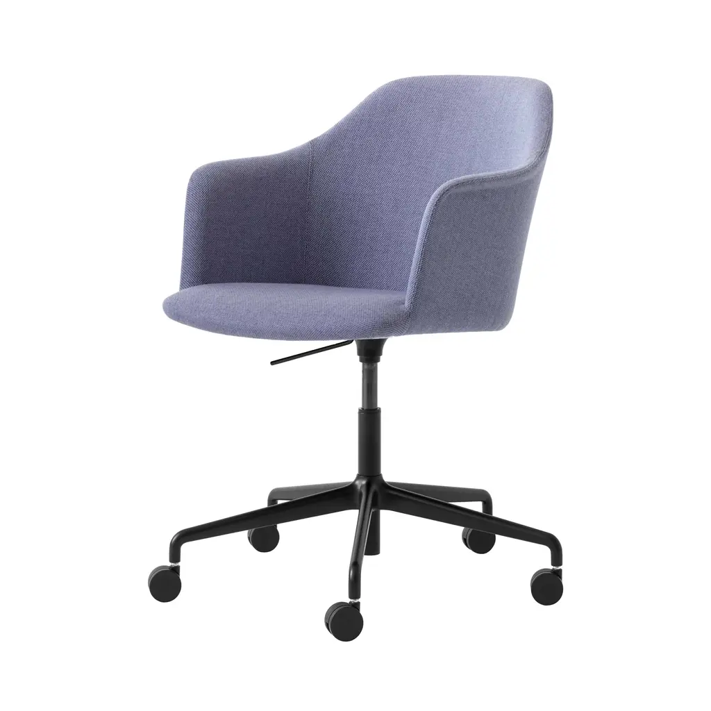 &Tradition's upholstered armchair crafted from 100% recycled plastic adds a model with automatic height adjustment and rolling castors. From lauded Copenhagen designer Hee Welling, this Danish modern classic gets a 21st-century update without sacrificing its notable comfort and enduring style. Sheathed in a custom textile or leather over HR foam, it features a 5-star swivel base in black or polished aluminum with match castors suitable for all floor types.