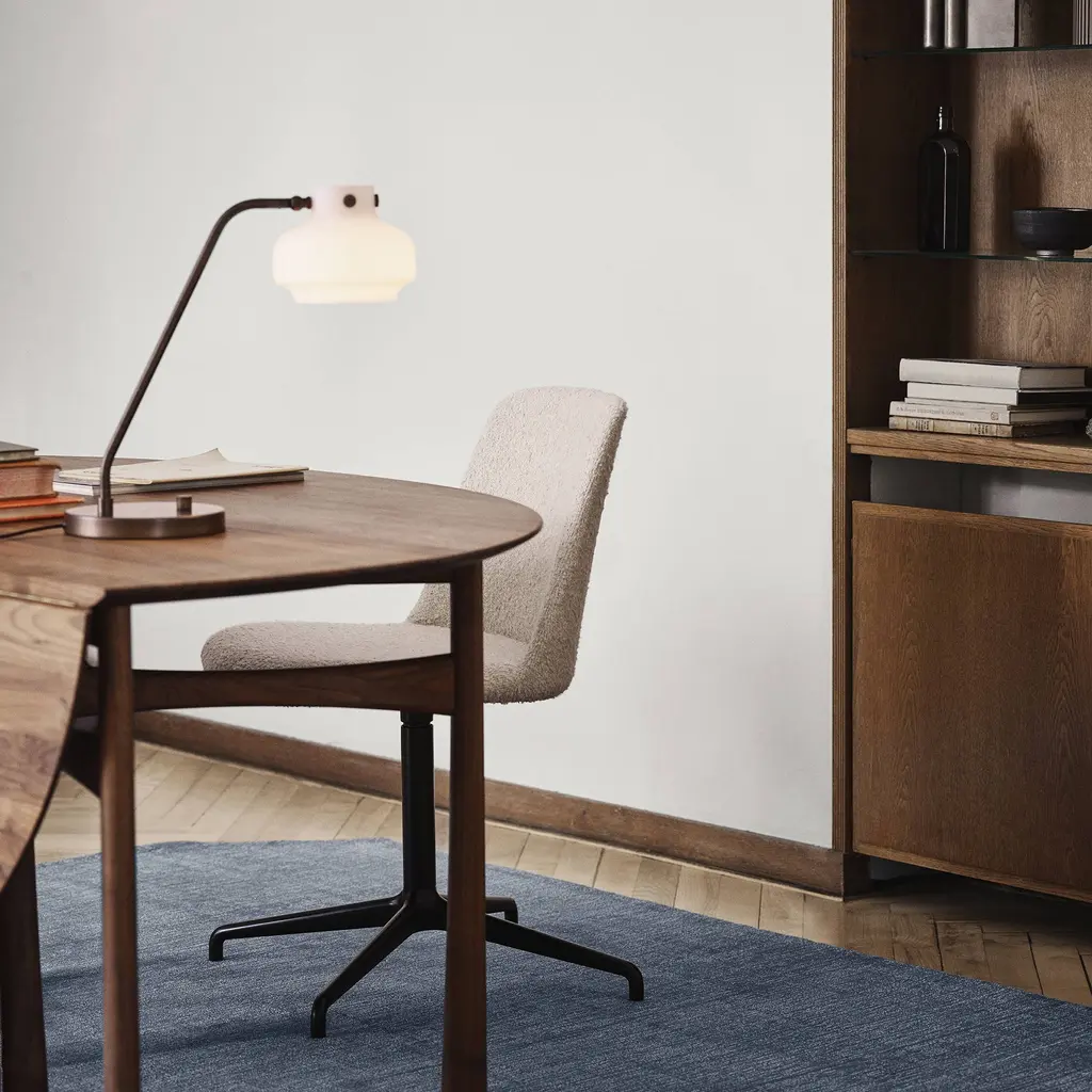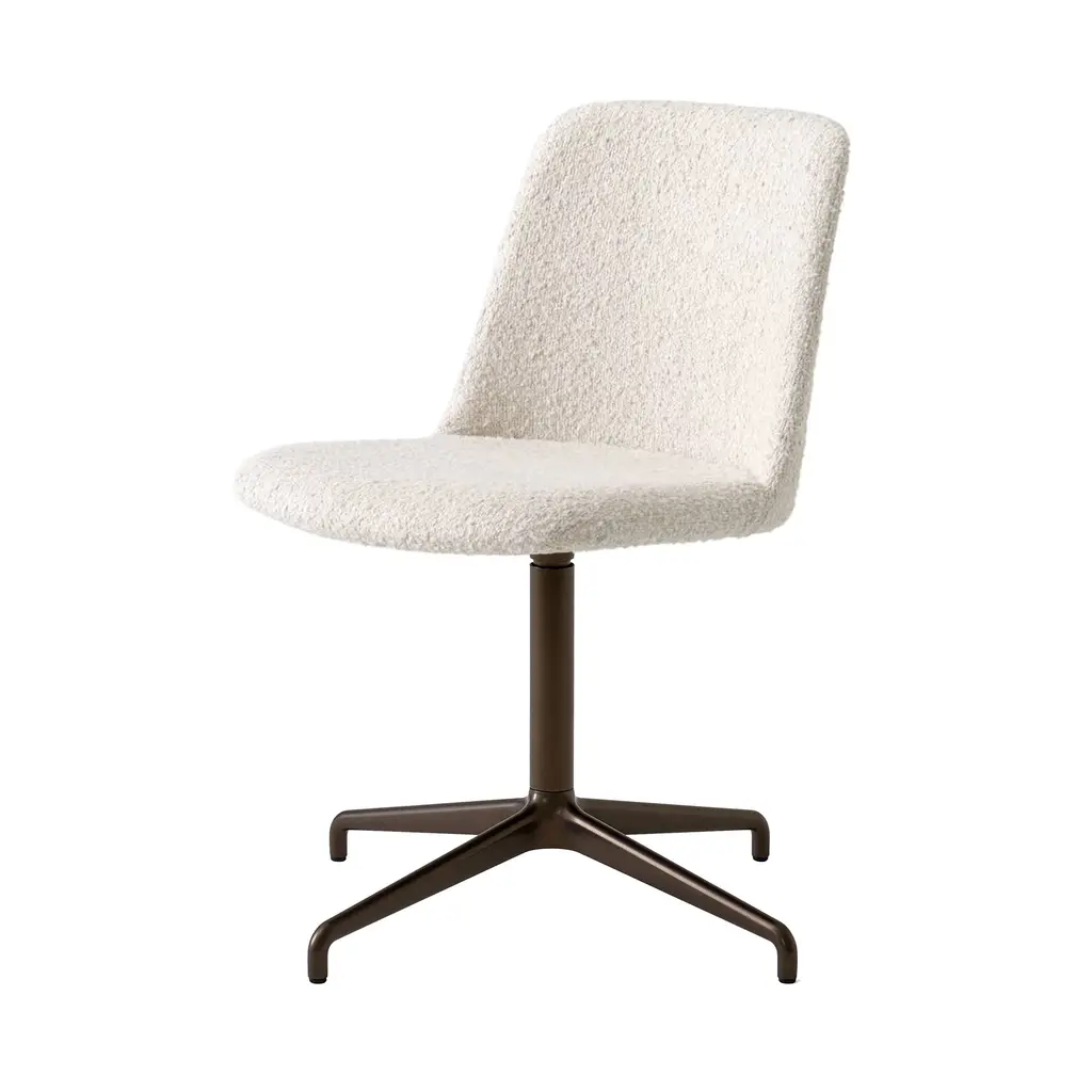 Designer Hee Welling’s Rely, an updated shell chair made from 100 percent recycled plastic, adds a completely upholstered version on a swivel base with the convenient return feature. His version of the Nordic classic for Copenhagen’s &Tradition comes in a choice of select fabrics or leather over a layer of resilient HR foam to complement its ergonomically comfortable contours. The chair base is made from extruded aluminum and is available in a chrome, bronzed or powder-coated black option.
