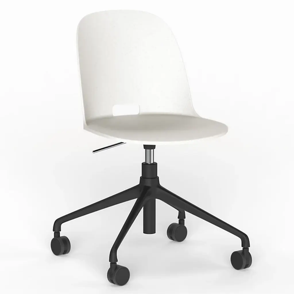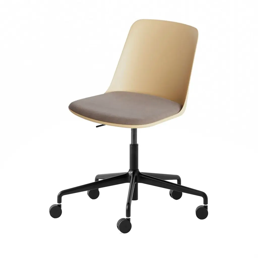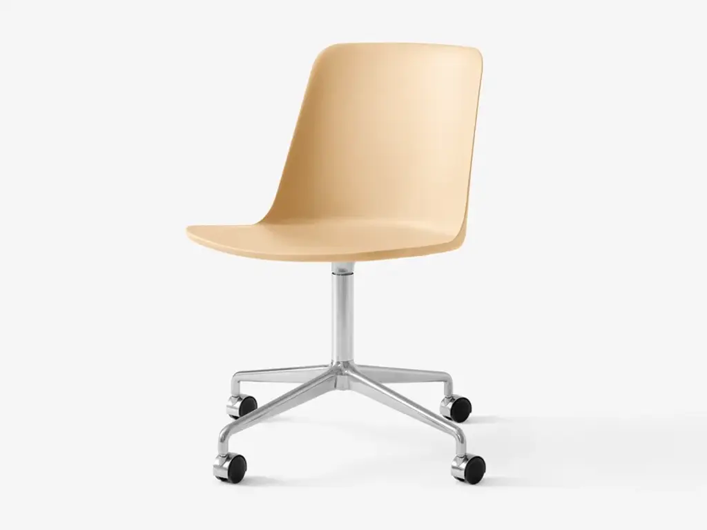 Designer Hee Welling’s eco-friendly Rely shell chair adds an easy-moving version on a swivel base with mobile castors. Reconceived in a 100 percent recycled plastic composite, the dated take on classic Scandinavian ergonomic seating is available in a range of refined colorways. The extruded aluminium swivel base with castors is available in a choice of polished, bronzed or black powder-coated finish.