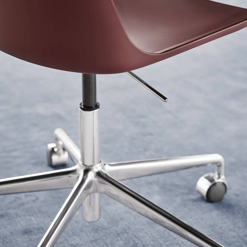 With a swivel function and roll-about base, &Tradition expands on Rely, its updated shell chair crafted from 100% recycled plastic. Danish designer Hee Welling’s eco-friendly version of the molded classic retains its ergonomic comfort and iconic curved silhouette. Available in a range of contemporary colors, the chair features automatic gaslift height adjustment and a sturdy 5-star aluminum swivel base with matching castors.