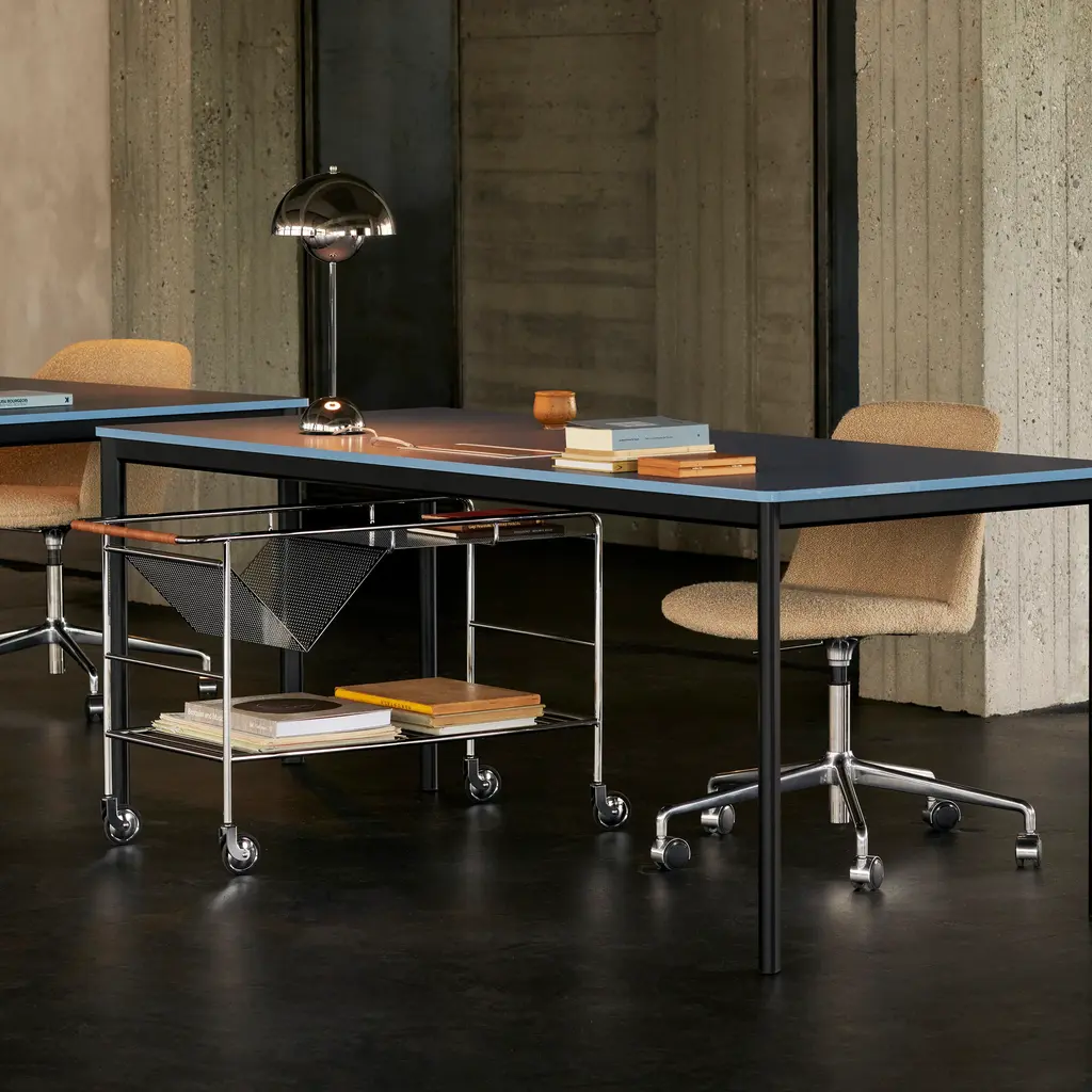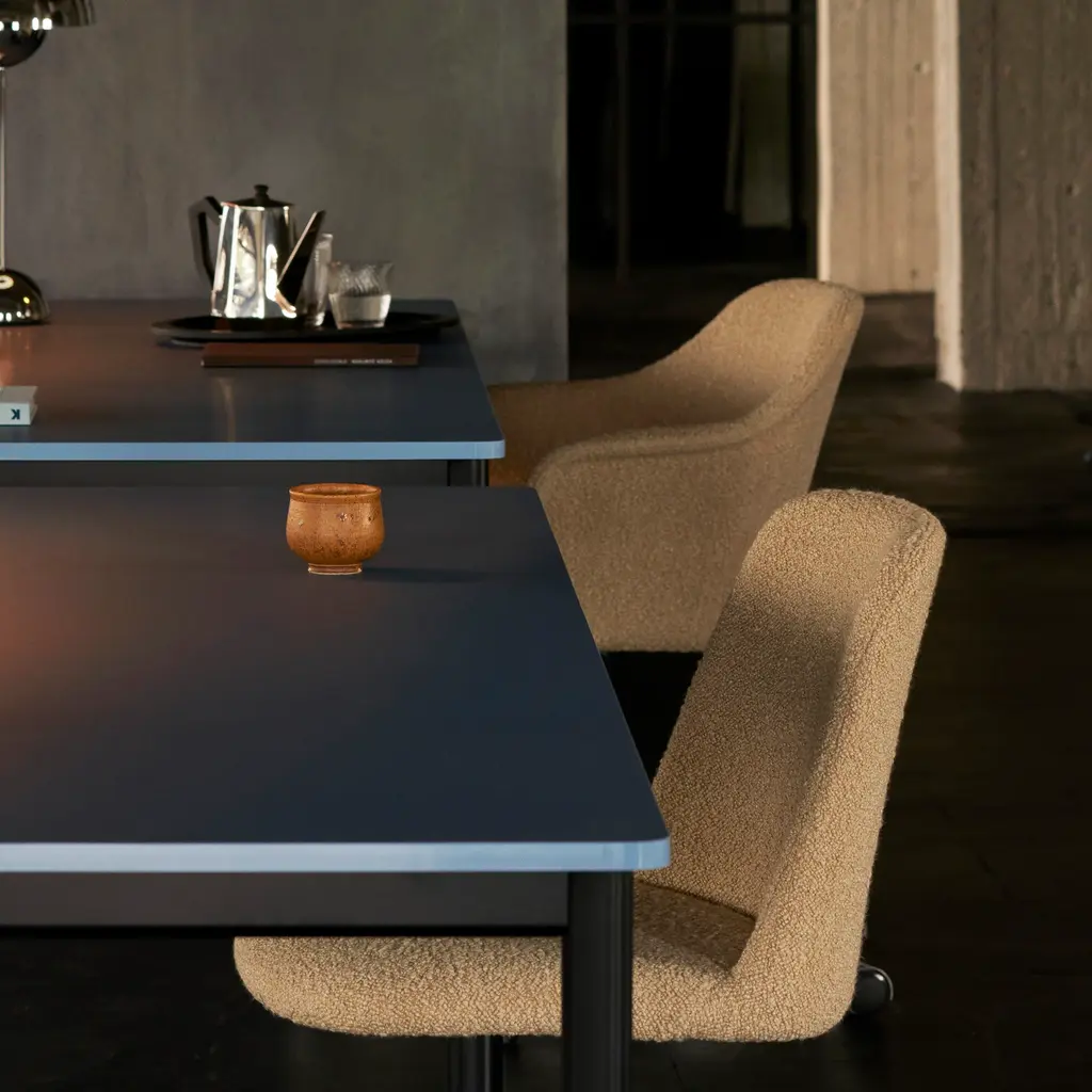 Completely upholstered in custom fabric or leather, &Tradition’s recycled plastic shell chair also features a swivel seat and rolling base. Rely from Danish designer Hee Welling updates the Scandinavian molded classic with its timeless ergonomic comfort and curved expression. This version also adds automatic gaslift height adjustment and a sturdy 5-star aluminum swivel base with matching castors.