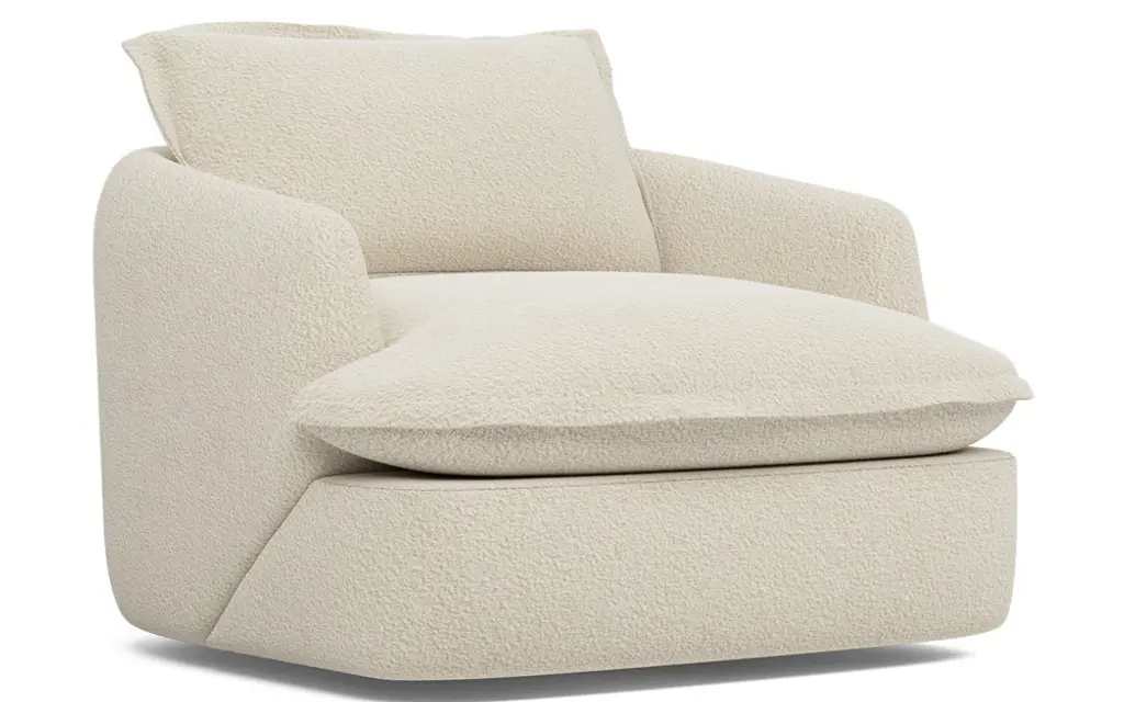 Don't be fooled by the low-profile design; this accent chair is big on the style points. Covered in soft textural upholstery with a plush pillow and hidden swivel, the Ren chair serves seventies style and modern comfort all in one. Don't be fooled by the low-profile design; this accent chair is big on the style points. Covered in soft textural upholstery with a plush pillow and hidden swivel, the Ren chair serves seventies style and modern comfort all in one.