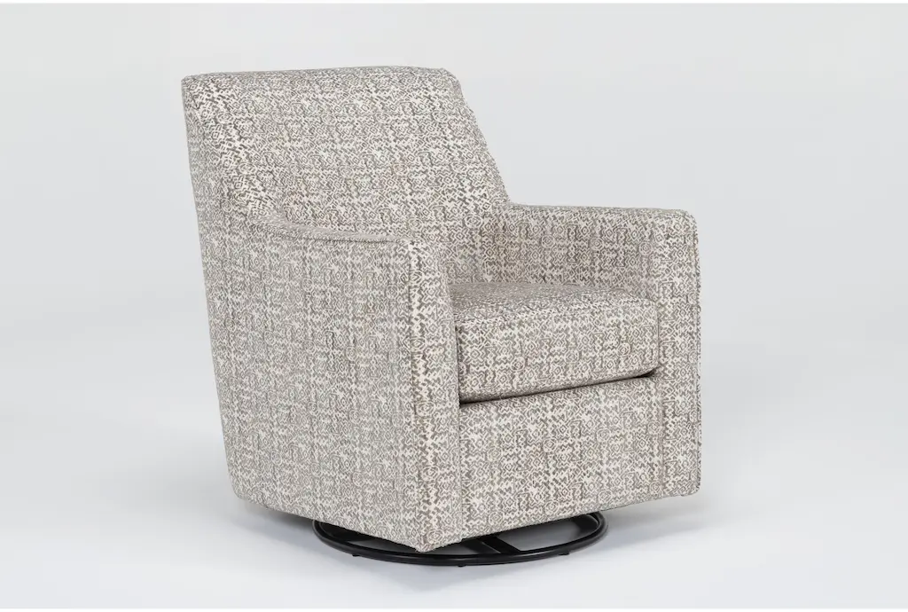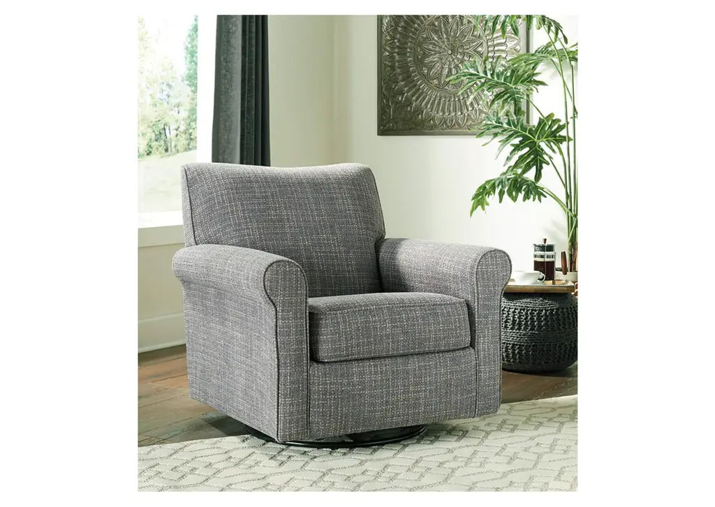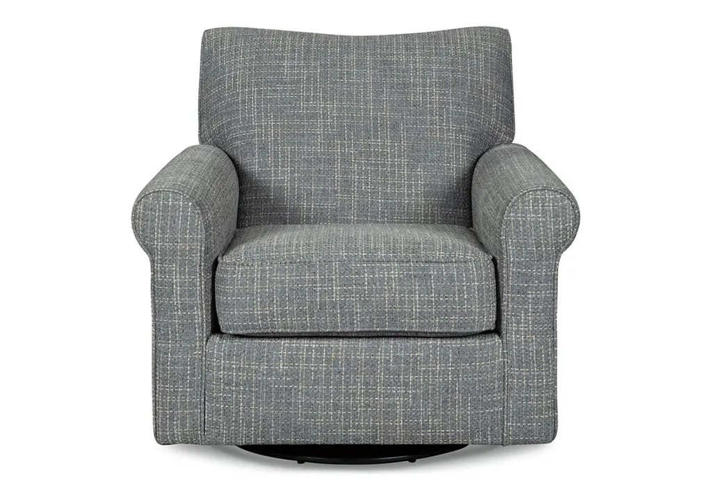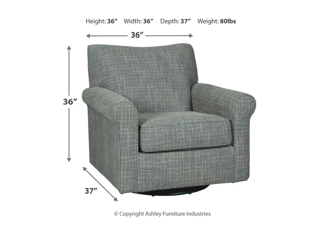Sporting a tantalizing tweed weave fabric in such a soothing blue hue, the Renley swivel glider accent chair gives the classic roll arm chair a modern twist. Smooth, 360-degree swivel caters to your comfort—and your viewing pleasure. Gentle glider feature is designed to rock your cares away. Weight 80.000 lbs. (36kgs.)