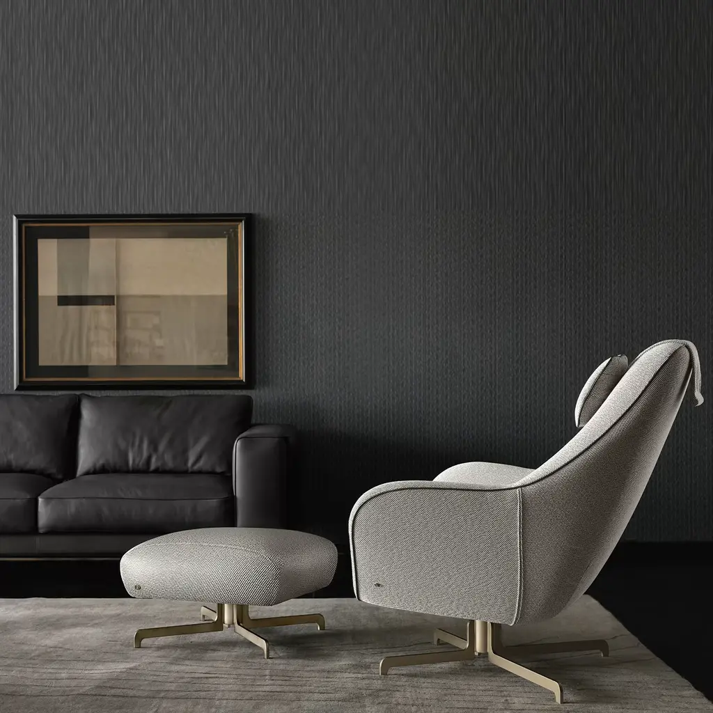 A timeless and versatile design of excellent comfort, this swivel armchair flaunts a 1950s-inspired silhouette that revisits the classic French bergère. Entirely upholstered with a beige fabric showcasing elegant piping, it combines a large backrest in curved 18-mm poplar plywood with a welcoming seat in 25mm fir plywood, fastened with 6cm elastic belts. The piece is padded with polyurethane foam and memory foam encased in an acrylic sheet. The swivel base is fashioned of powder-coated metal for an innovative and shiny accent.