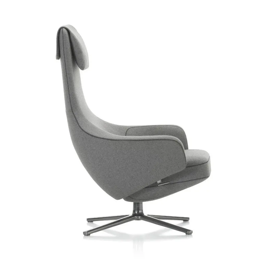 Jointly developed by Vitra and Antonio Citterio, the lounge chairs Repos and Grand Repos introduce a new level of comfort and flexibility to the home environment: with their generous padding, inviting armrests and high backrest, these elegant swivel-based lounge chairs impart an image of supreme comfort. Thanks to the synchronised mechanism concealed beneath the upholstery, sitters can move from an upright posture to a reclined angle for resting and lock the backrest in any position. The resistance of the backrest can be manually adjusted to the user's weight. This ensures great comfort and optimal spinal support across the entire range of movement.