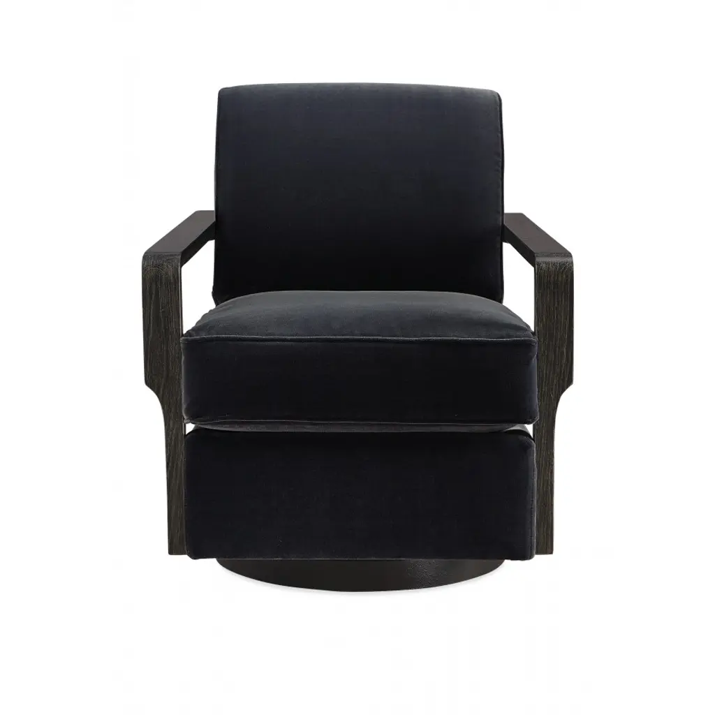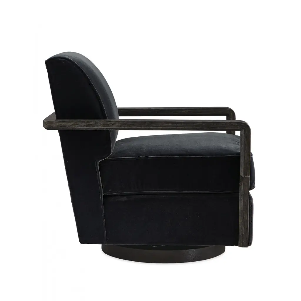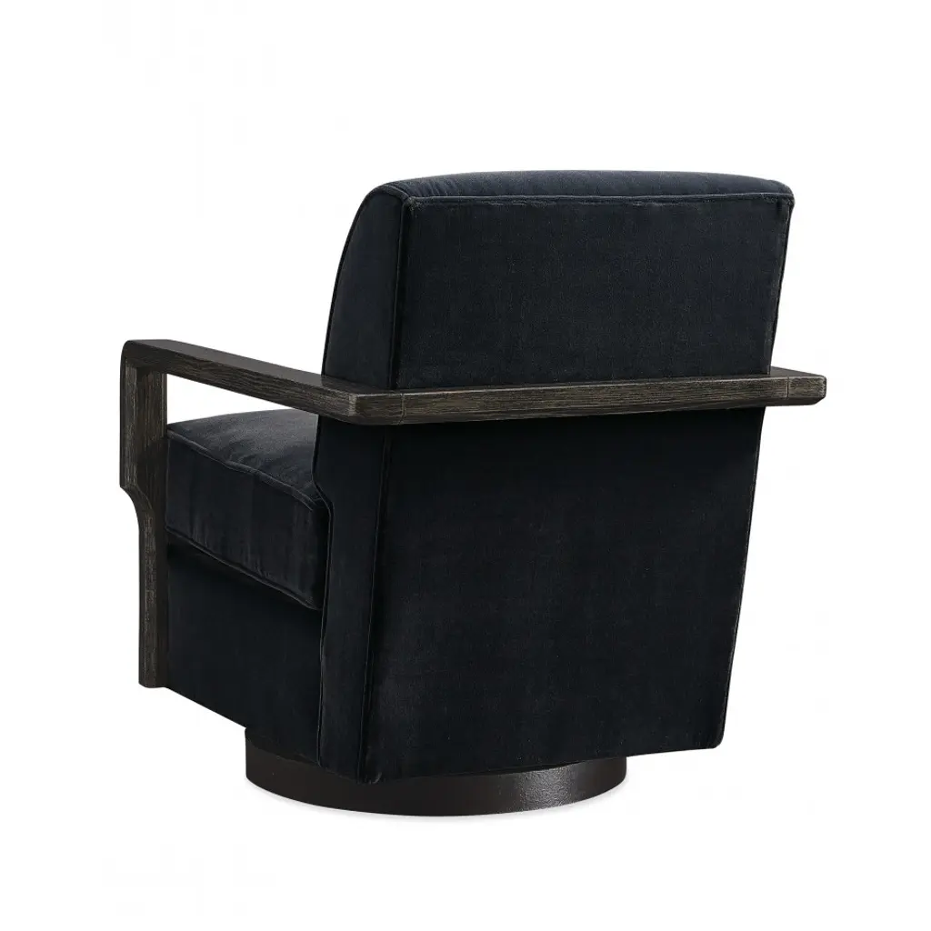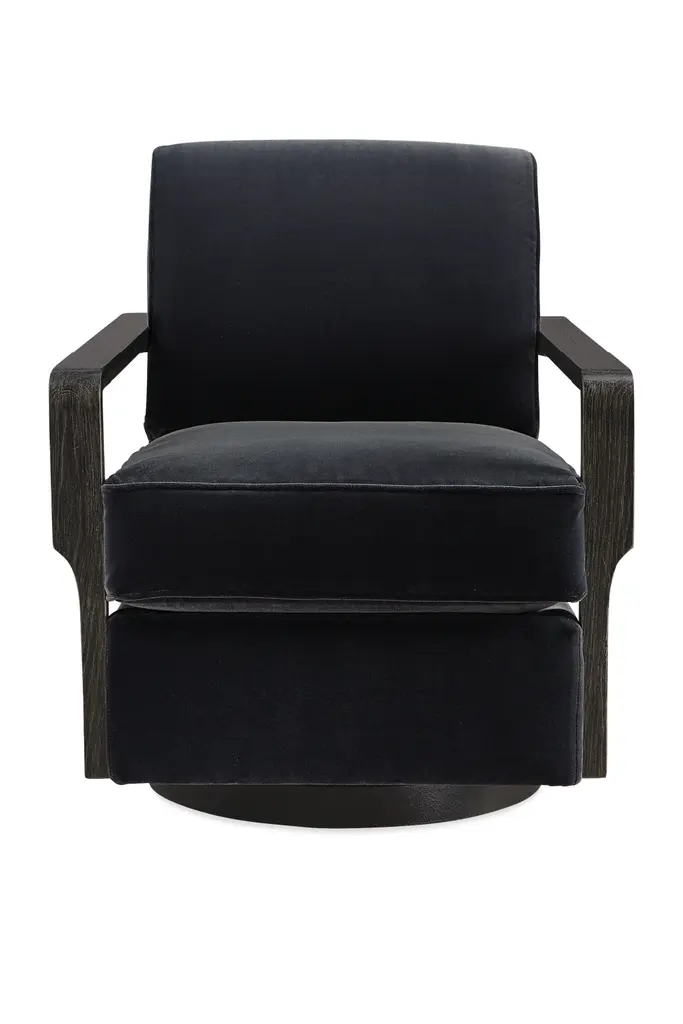When it’s time to relax and unwind in undeniable style, this is your chair. Its bold character was inspired by the svelte lines and powerful presence of an art-deco roadster chair. This open-arm swivel chair has a notched back to hold the cushion in place and ensure its stylish comfort while exposed wood arms wrap around the back in a seamless racetrack design. Its metal swivel base features a Remixed Gold Paint finish. Only a design as unique and distinctive as this Rewind chair can help you find a sense of adventure in the everyday.