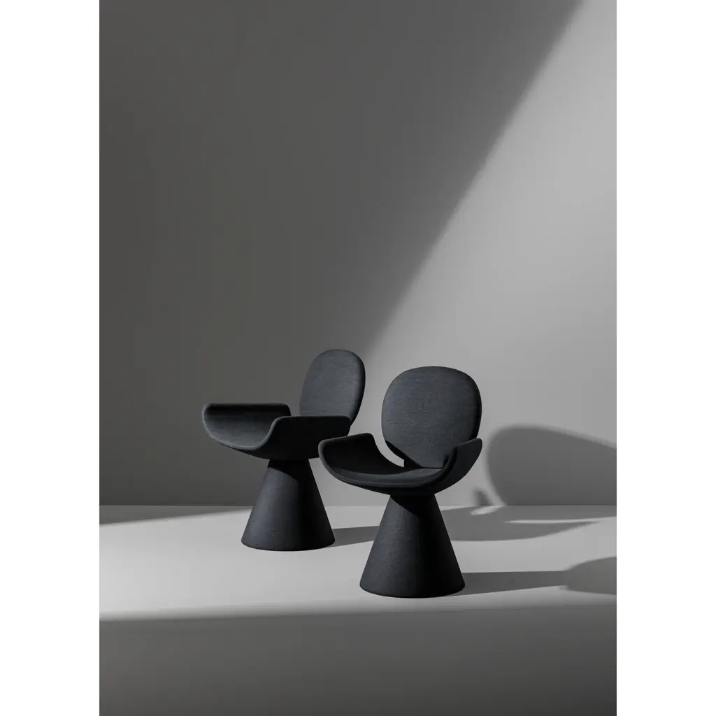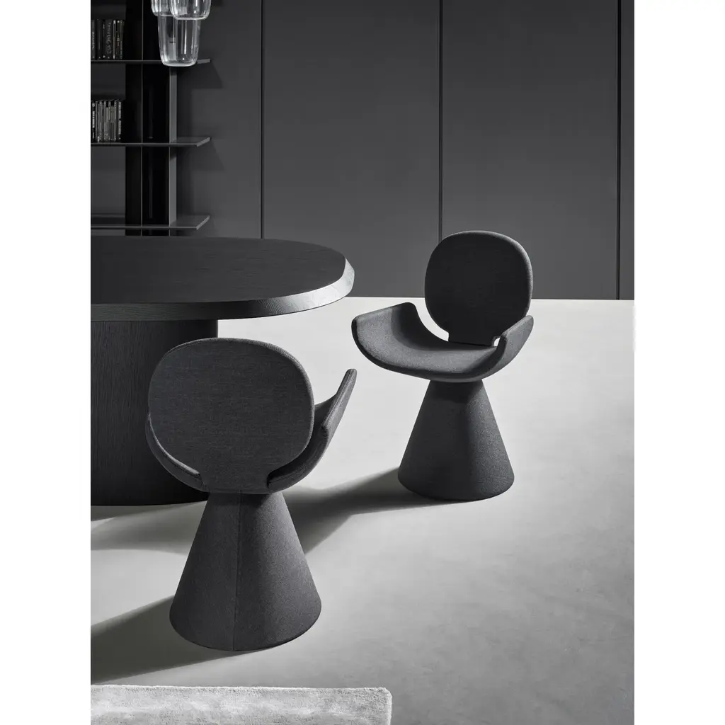 Seen from behind, the profile of the Youpi chair calls to mind the image of a stylized human figure, ready to welcome you in a comfortable embrace. Designed by Fabrice Berrux, what strikes the observer about the Youpi chair is its original shape, which adds style and a sense of lightness to any space. It consists of a series of different forms that combine to create a harmonious ensemble thanks to the fabric or leather upholstery that completely covers it: the circular backrest flows into the large seat and the whole is supported by a flared conical base. The Youpi unique design chair is also available in a version with four metal legs.