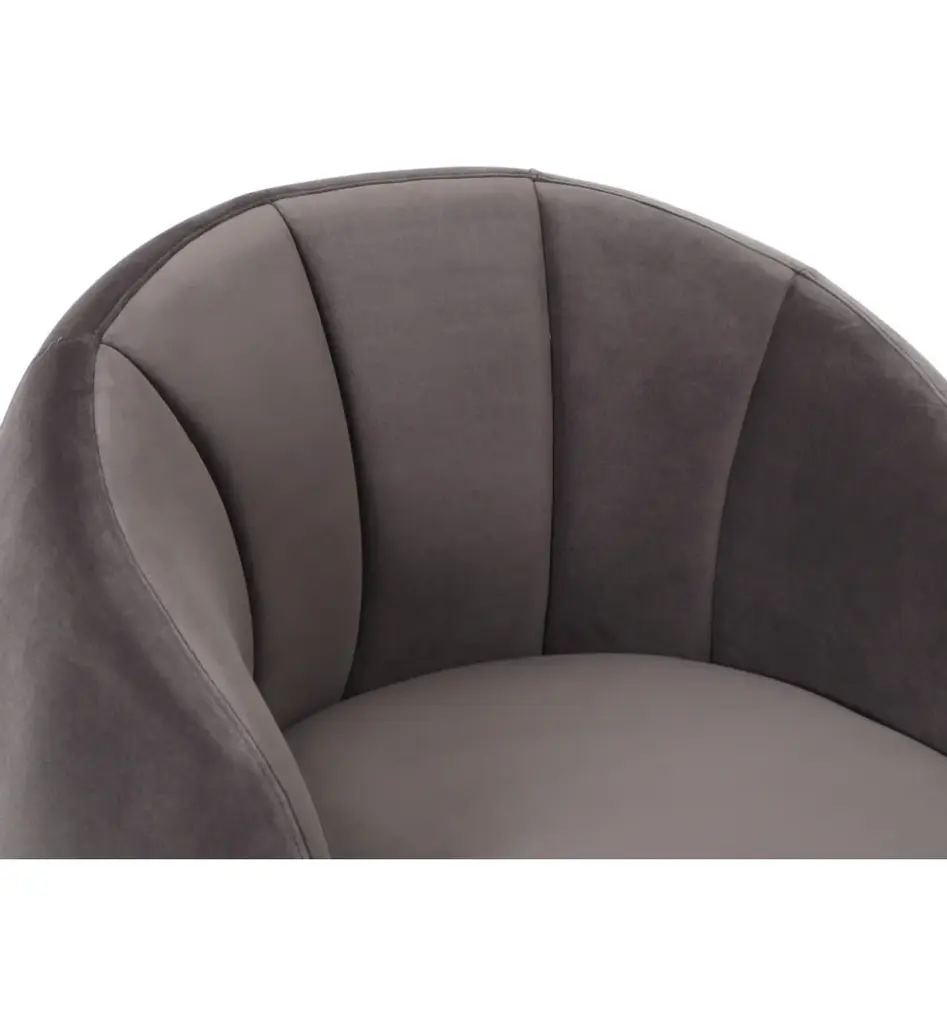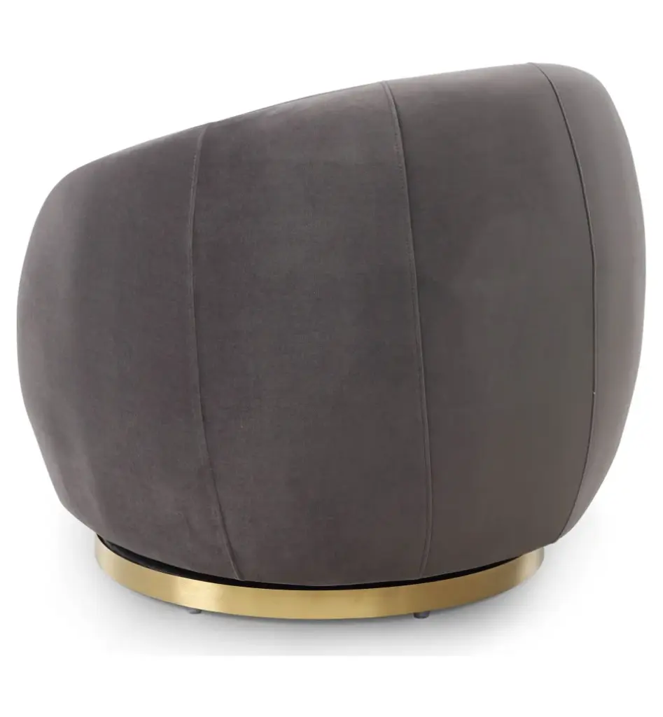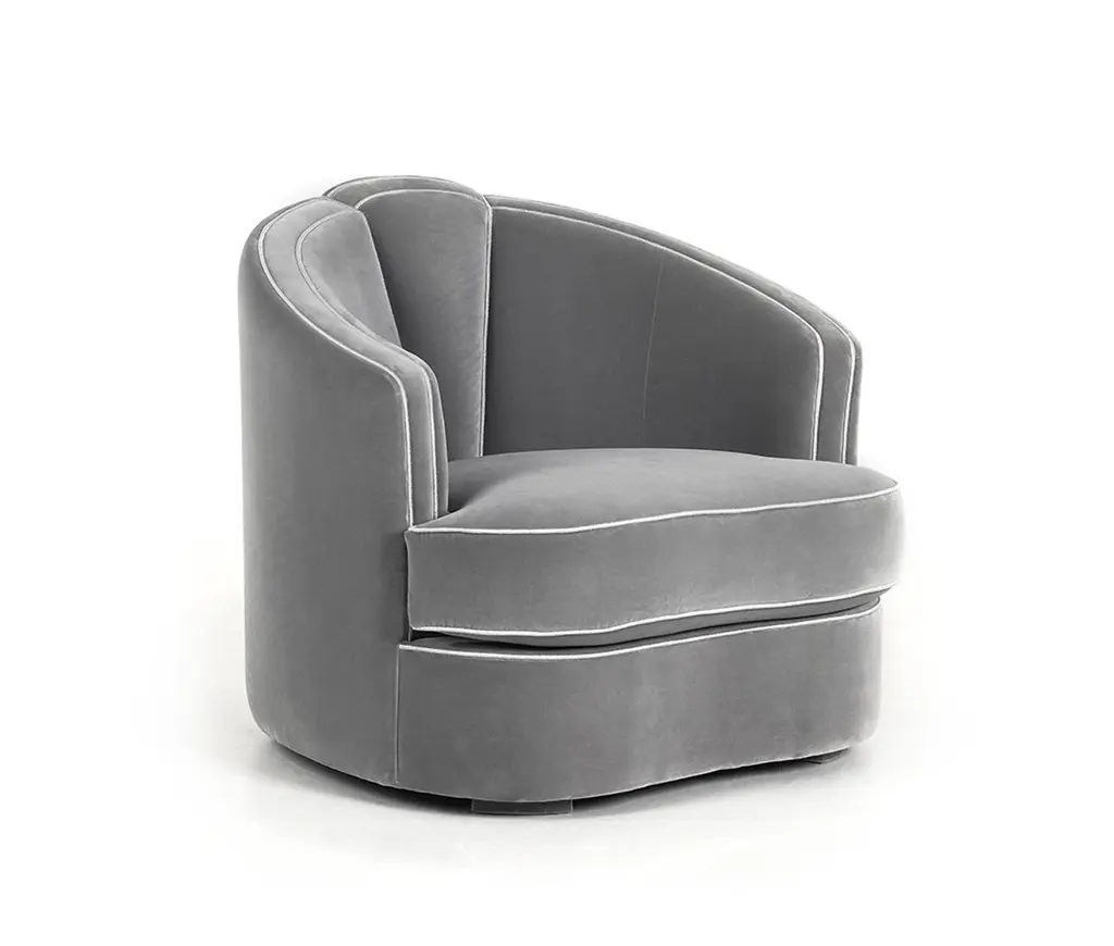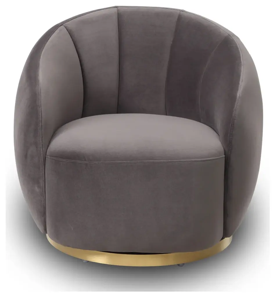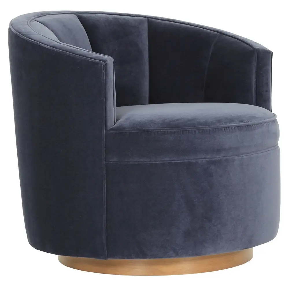 This Art Deco inspired occasional chair has an enveloping barrel back with flared channeled upholstery detailing to the inside back – in form and treatment a homage to the greatest designers of the Art Deco period. With a crisply upholstered tight seat and recessed matt black iron base concealing a 360-degree swivel mechanism it has both comfort and style for your well appointed living space.W33 x D33 x H29 in | Weight 57lbsSeat Dimension: W20 x D22 x H17 inArm Height: 19 inUpholstery | VelvetBase | SteelComes in 3 colors