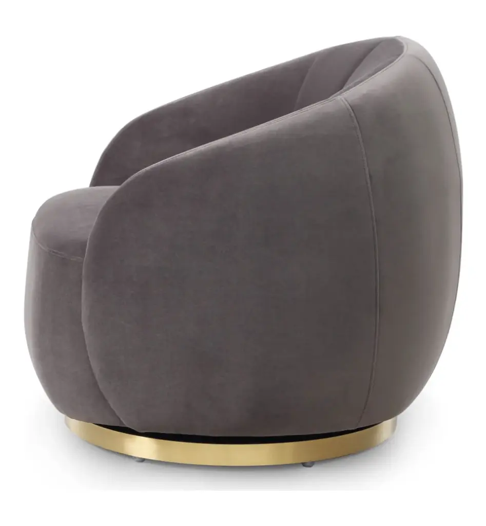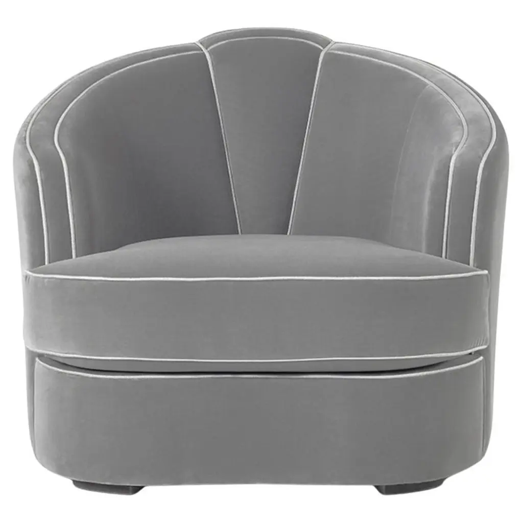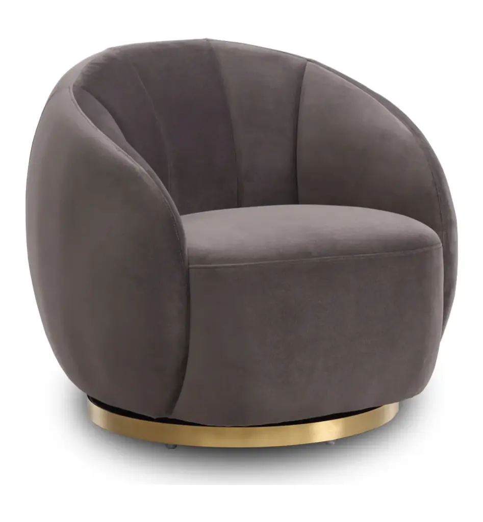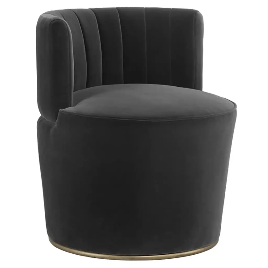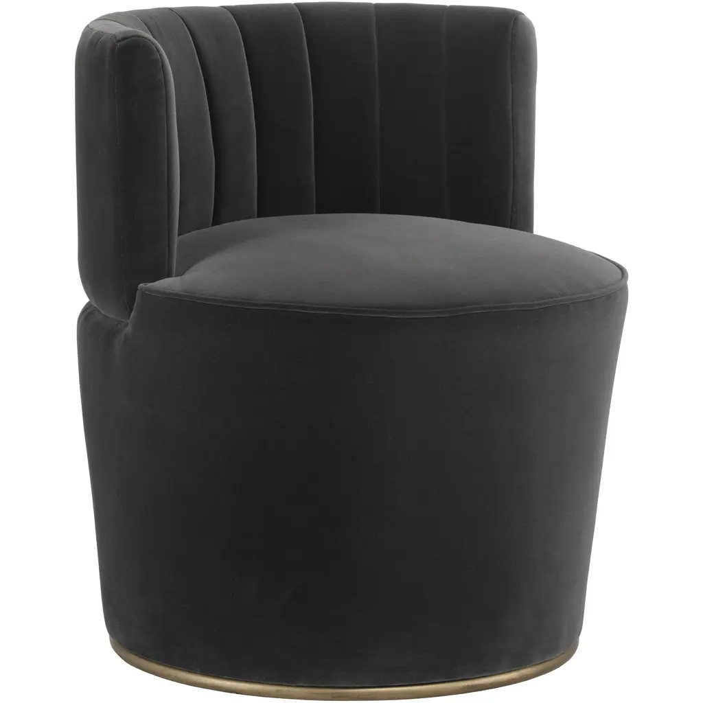 This Art Deco inspired occasional chair has an enveloping barrel back with flared channeled upholstery detailing to the inside back – in form and treatment a homage to the greatest designers of the Art Deco period. With a crisply upholstered tight seat and recessed matt black iron base concealing a 360-degree swivel mechanism it has both comfort and style for your well appointed living space.W33 x D33 x H29 in | Weight 57lbsSeat Dimension: W20 x D22 x H17 inArm Height: 19 inUpholstery | VelvetBase | SteelComes in 3 colors