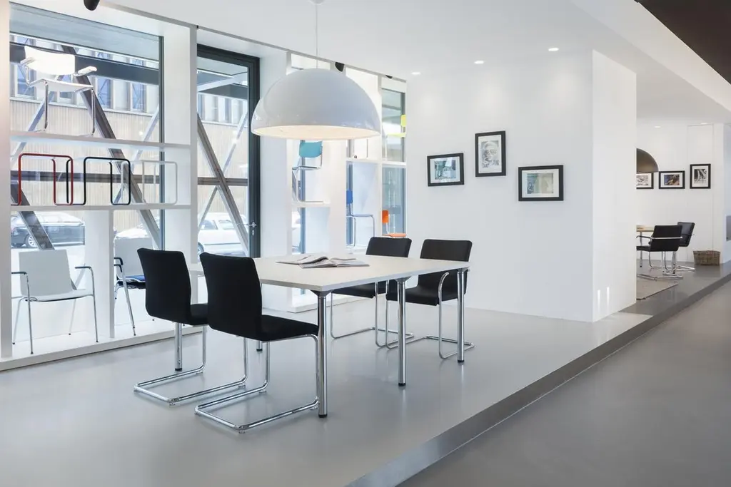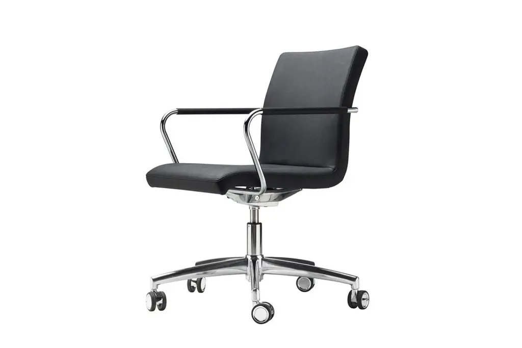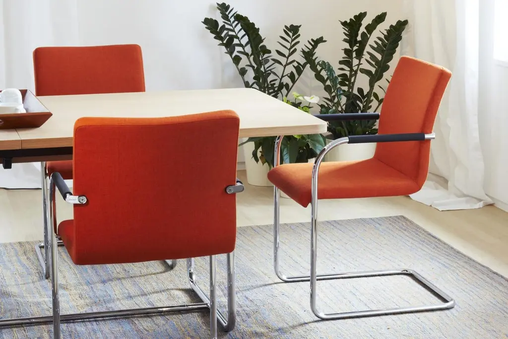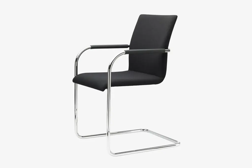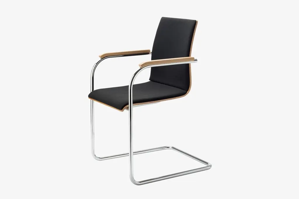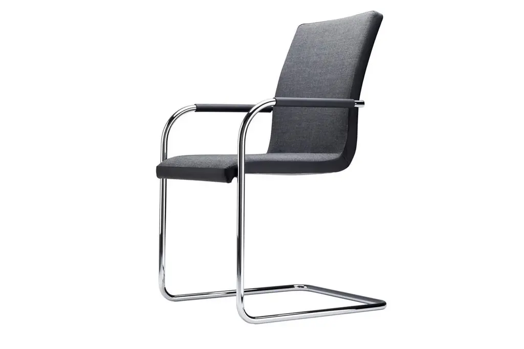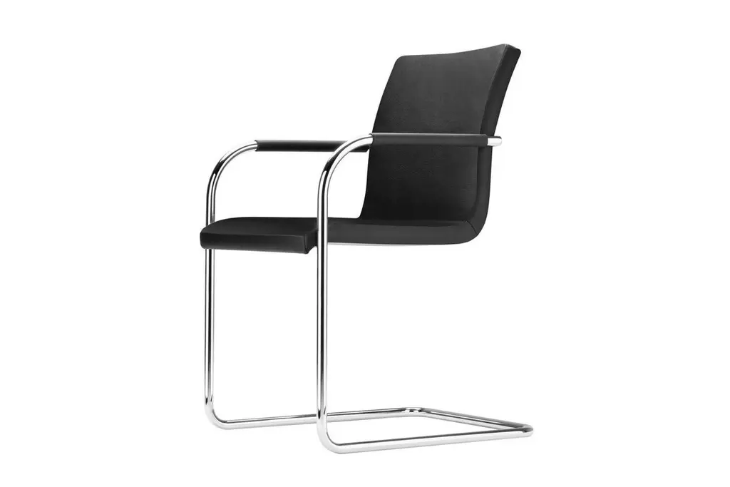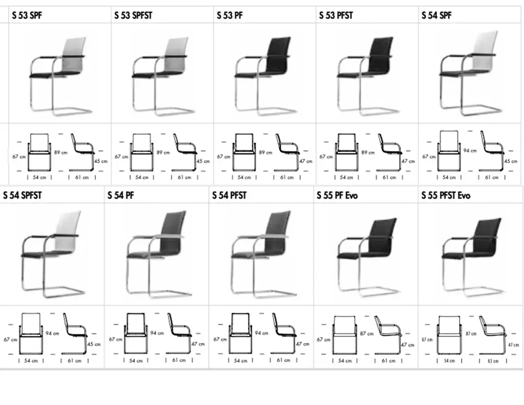 Range S 55A comfortable and elegant all-rounder, based on the construction principle of the cantilever chair. With its one-piece seat shell it offers the highest possible comfort, has a formally clear design and is produced in the typically high quality. Its area of uses ranges from conference and meeting rooms to training and seminar rooms and to the living segment. The model is produced with two different backrest heights, as a swivel chair version and is also available as a stackable version.Frame chrome-plated tubular steel, seat made of moulded plywood in beech and oak with natural cross-veneer, or stained. With partial upholstery for seat or for seat and backrest, or with full upholstery. Armrests made of black elastomer or covered with nappa leather, or armrests made of solid beech and oak, natural or stained. Covers in leather or fabric.