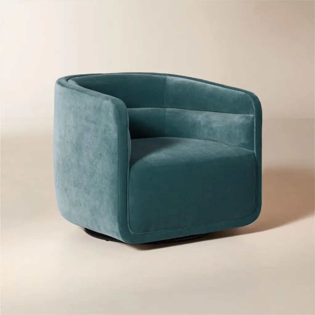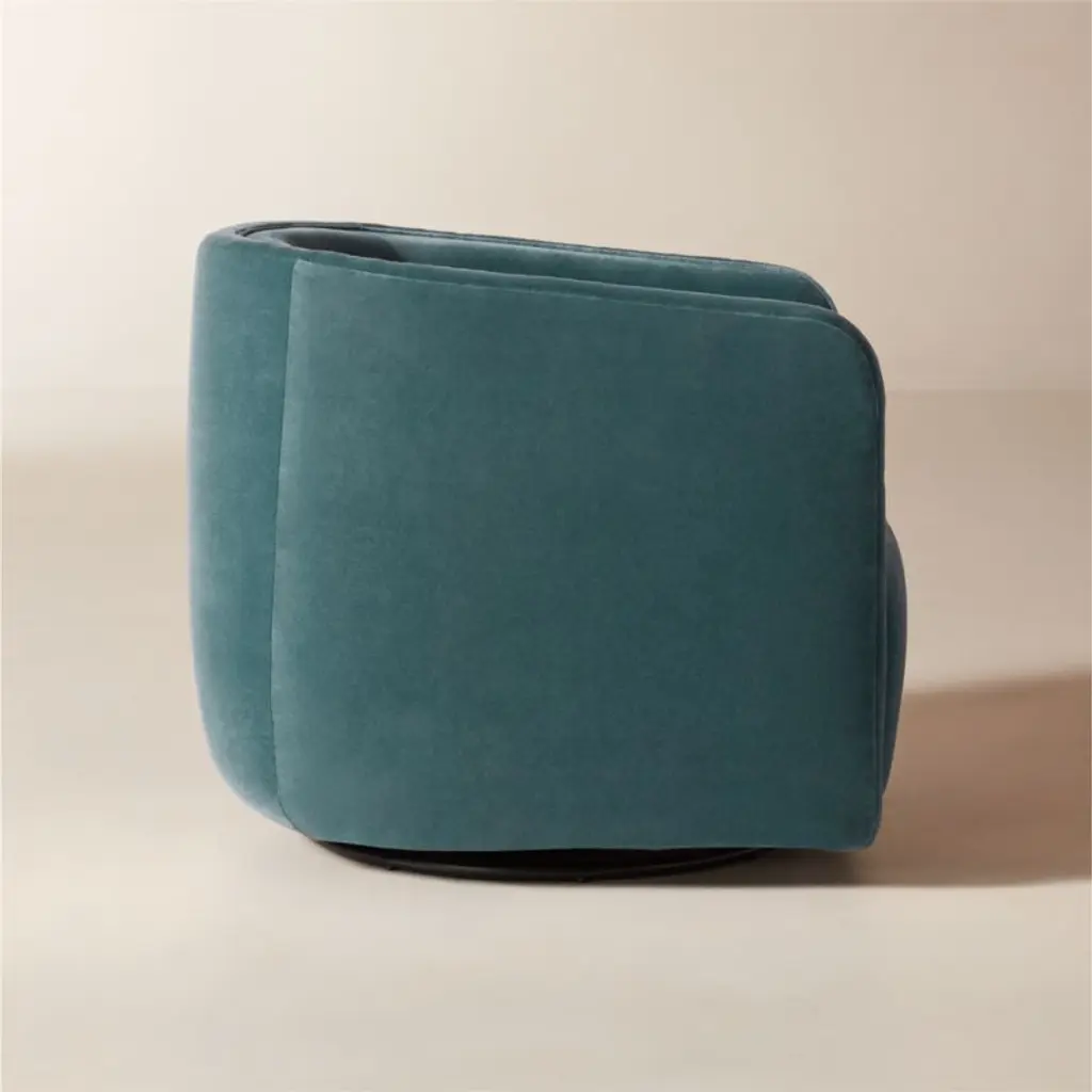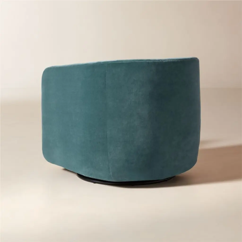 Smoothly upholstered in a swath of teal performance velvet, swivel chair sports the hallmarks of a classic Mermelada Estudio design. Modern silhouette reveals design details such as horizontal tufted channels and a crisp welt around the frame for a tailored look. Soft performance velvet upholstery woven by an esteemed South Carolina textile mill that's been making velvet for more than 180 years is made to stand the test of time. CB2 exclusive.