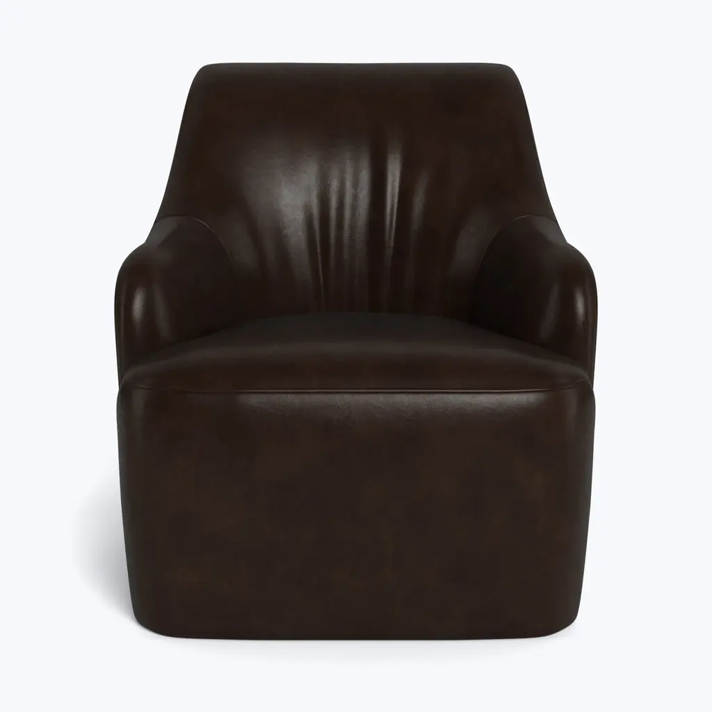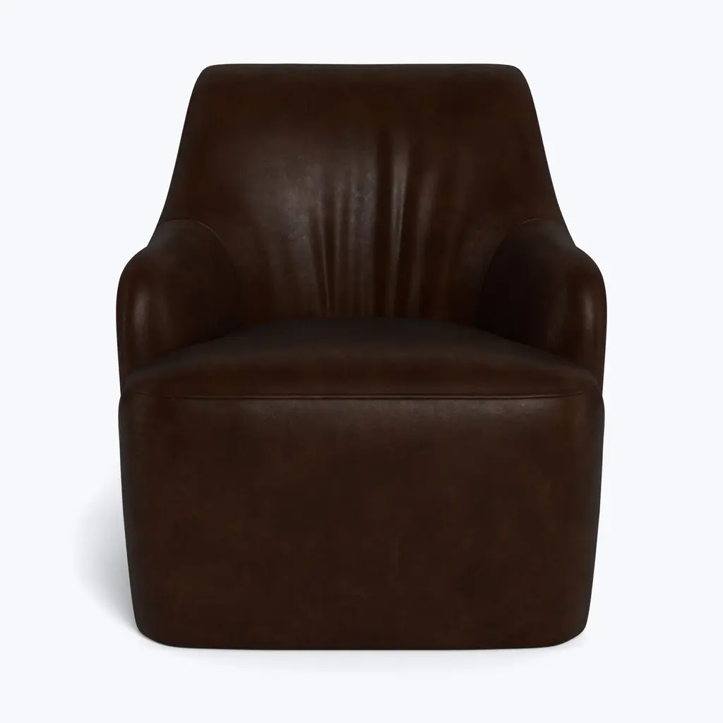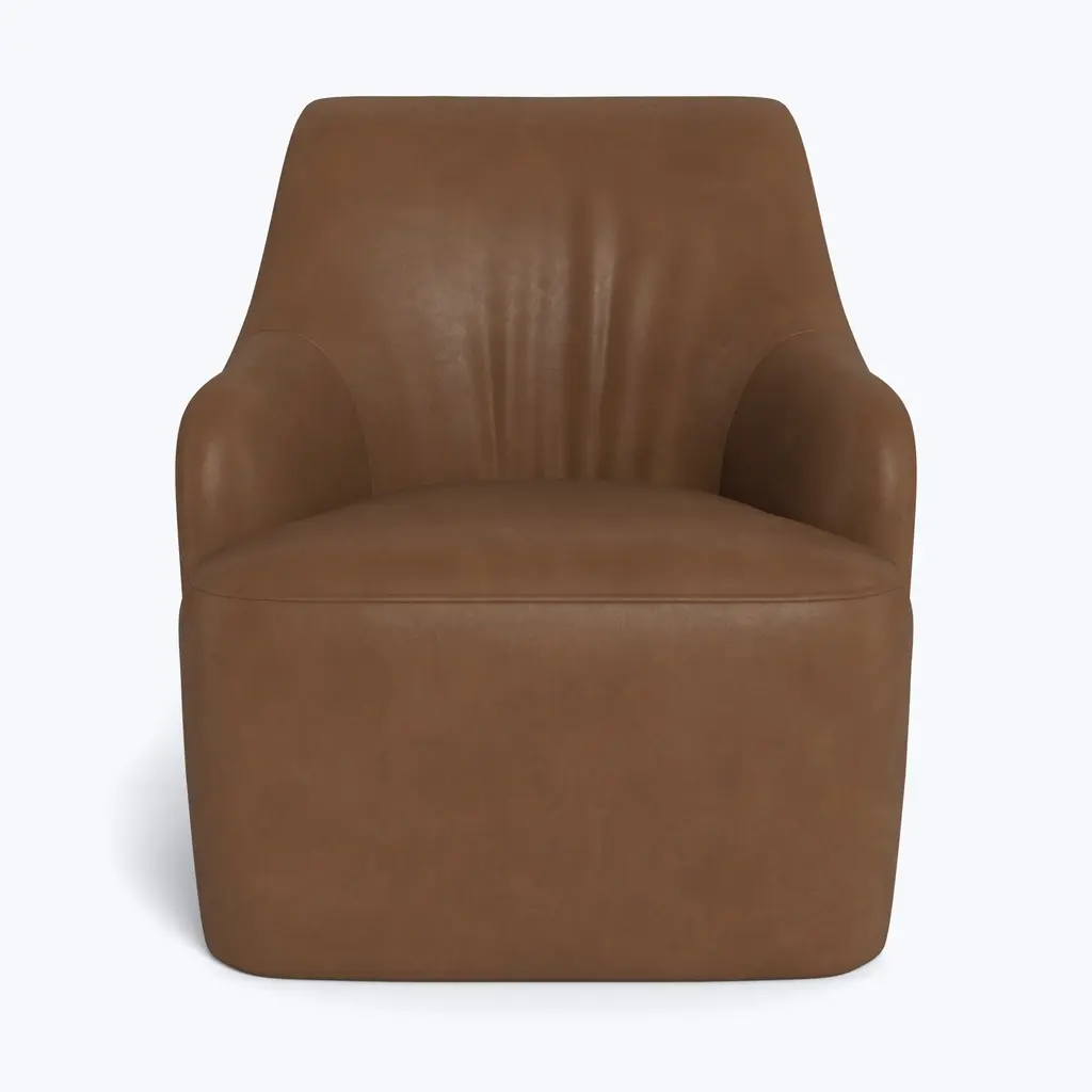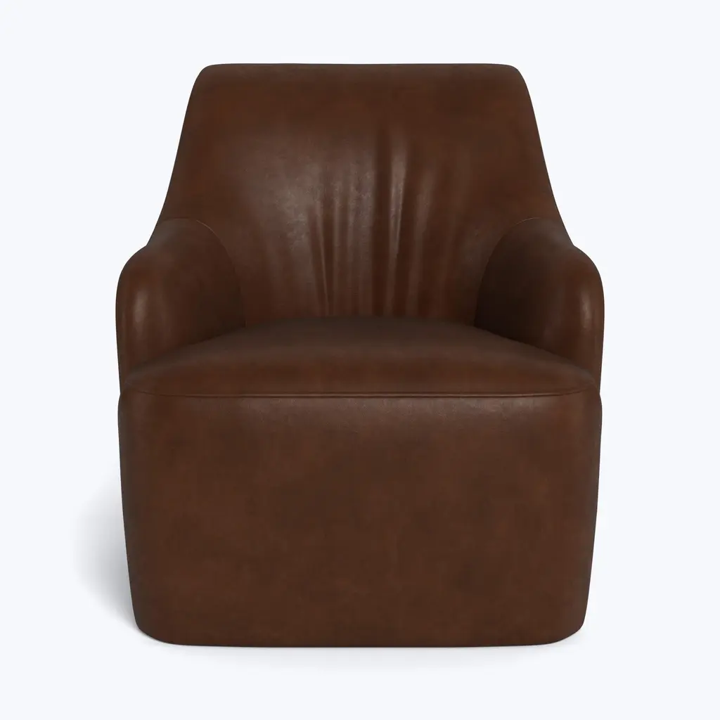 Relax in refined luxury with the Saratoga Leather Swivel Chair, exclusively from abc carpet & home. This elegant chair features a graceful curved silhouette and a sleek, modern swivel base, offering both style and versatility. Perfect for any space, whether you're unwinding with a good book or enjoying a quiet moment, the Saratoga Leather Swivel Chair brings a touch of sophistication to your living room, bedroom, or reading nook. Available in eight distinctive leather finishes, this chair is designed to age beautifully over time. As the leather develops a rich patina, it gains character with each use, giving it the look and feel of a vintage treasure. Natural markings and subtle variations in the leather add to its unique charm, ensuring that each chair is truly one of a kind. This patina effect not only enhances its appearance but also makes the Saratoga Swivel Chair a long-lasting investment in style and quality. Crafted with a sustainably sourced Goodwood frame, the Saratoga Leather Swivel Chair is both eco-conscious and durable. The high-quality craftsmanship reflects ABC’s commitment to sustainability, ensuring that this piece is as responsible as it is stylish. The chair's tight seat provides supportive comfort, while the swivel base allows for easy movement, making it as functional as it is elegant. Designed to elevate any space, the Saratoga Leather Swivel Chair combines timeless design with modern convenience. Whether you choose a rich, dark leather for a bold statement or a soft, light tone for a more subtle look, this chair can be tailored to fit your personal style. Its compact size and versatile design make it a perfect addition to any room, offering a luxurious seating experience without compromising on comfort or sustainability. Handcrafted to order and delivered to your home within 8-10 weeks, the Saratoga Leather Swivel Chair is the ultimate blend of elegance, functionality, and eco-conscious craftsmanship. Whether you’re furnishing a modern home or adding a timeless piece to a classic setting, this chair brings lasting luxury and sophisticated charm to your space.