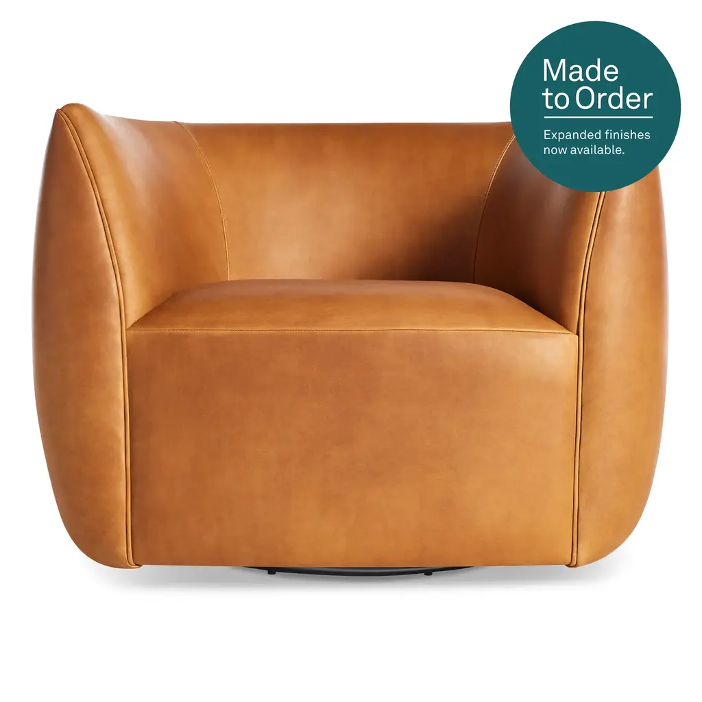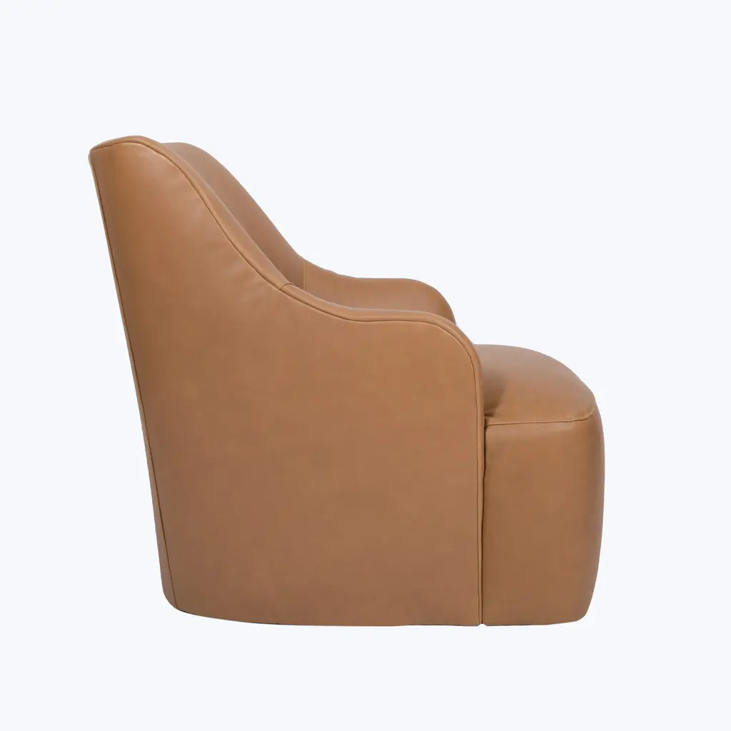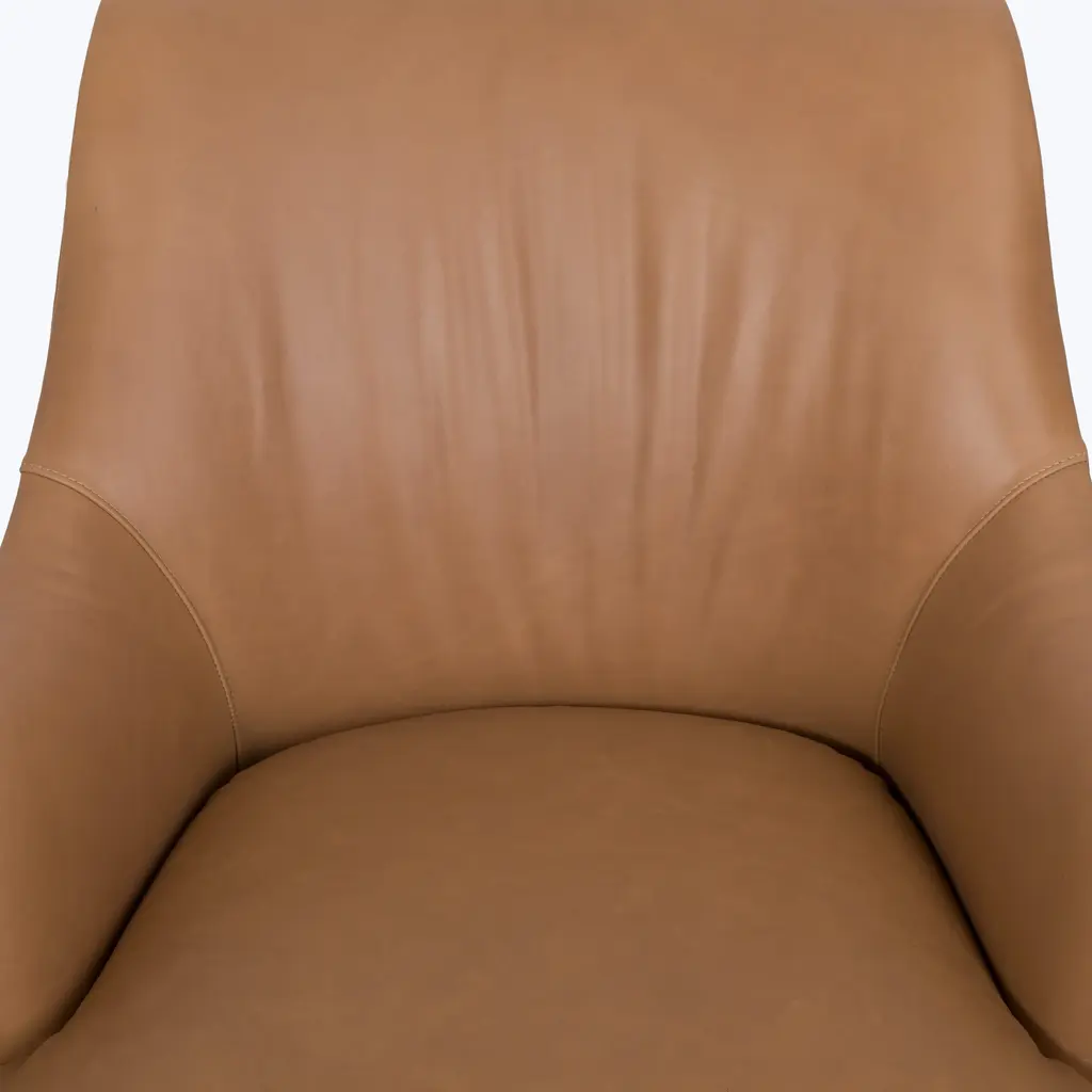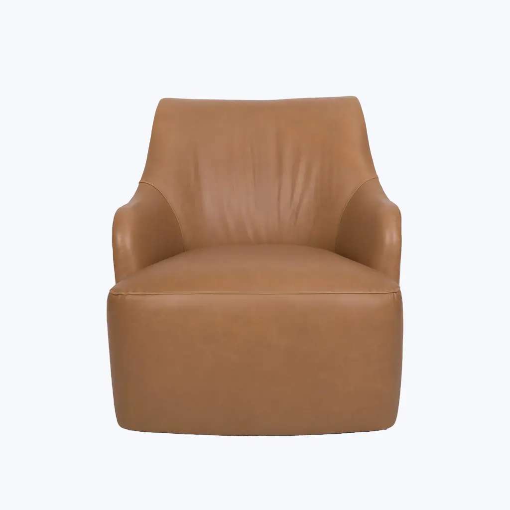 Relax in refined luxury with the Saratoga Leather Swivel Chair, exclusively from abc carpet & home. This elegant chair features a graceful curved silhouette and a sleek, modern swivel base, offering both style and versatility. Perfect for any space, whether you're unwinding with a good book or enjoying a quiet moment, the Saratoga Leather Swivel Chair brings a touch of sophistication to your living room, bedroom, or reading nook. Available in eight distinctive leather finishes, this chair is designed to age beautifully over time. As the leather develops a rich patina, it gains character with each use, giving it the look and feel of a vintage treasure. Natural markings and subtle variations in the leather add to its unique charm, ensuring that each chair is truly one of a kind. This patina effect not only enhances its appearance but also makes the Saratoga Swivel Chair a long-lasting investment in style and quality. Crafted with a sustainably sourced Goodwood frame, the Saratoga Leather Swivel Chair is both eco-conscious and durable. The high-quality craftsmanship reflects ABC’s commitment to sustainability, ensuring that this piece is as responsible as it is stylish. The chair's tight seat provides supportive comfort, while the swivel base allows for easy movement, making it as functional as it is elegant. Designed to elevate any space, the Saratoga Leather Swivel Chair combines timeless design with modern convenience. Whether you choose a rich, dark leather for a bold statement or a soft, light tone for a more subtle look, this chair can be tailored to fit your personal style. Its compact size and versatile design make it a perfect addition to any room, offering a luxurious seating experience without compromising on comfort or sustainability. Handcrafted to order and delivered to your home within 8-10 weeks, the Saratoga Leather Swivel Chair is the ultimate blend of elegance, functionality, and eco-conscious craftsmanship. Whether you’re furnishing a modern home or adding a timeless piece to a classic setting, this chair brings lasting luxury and sophisticated charm to your space.