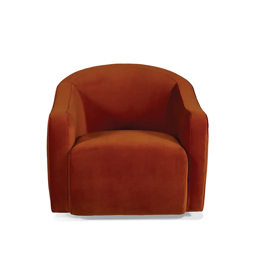 Chic and inviting, the Scout Swivel Chair features a classic barrel back but includes thick arms and a unique base silhouette. Welt trim along the edges of the upholstery add an extra level of elevation, while the swivel base makes this chair convenient for any entertaining space. Ships In 8-10 Weeks Tight back Tight seat As Shown Fabric: Diamond Orange If you choose to purchase COM, once you have placed your order a customer service rep will contact you regarding where to send your fabric. Please note that current lead time is 8-10 weeks once your fabric arrives at the factory, and if unused fabric is under 1.5 yards, it cannot be sent back to you.This product can be special ordered in additional fabrics, leathers, and cushion fillings. Click here to email us for for additional information about special ordering.This image is for illustrative purposes only. The colors shown are accurate within the constraints of lighting, photography, and the color accuracy of your screen.