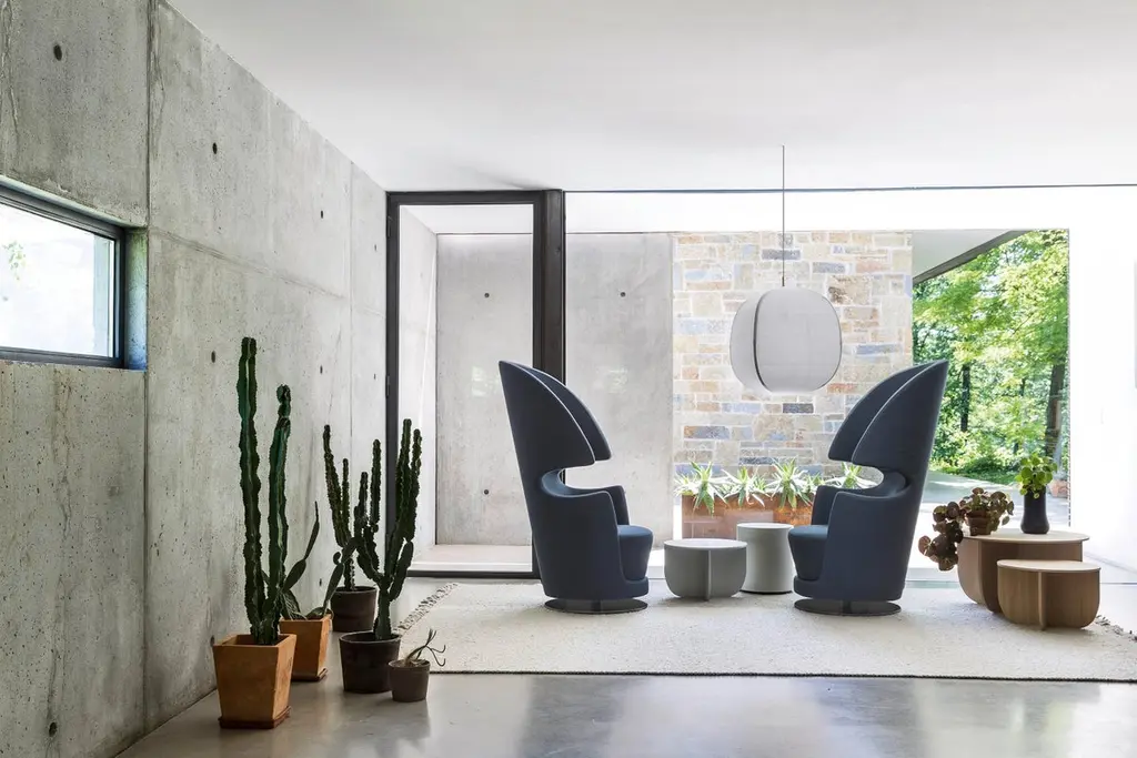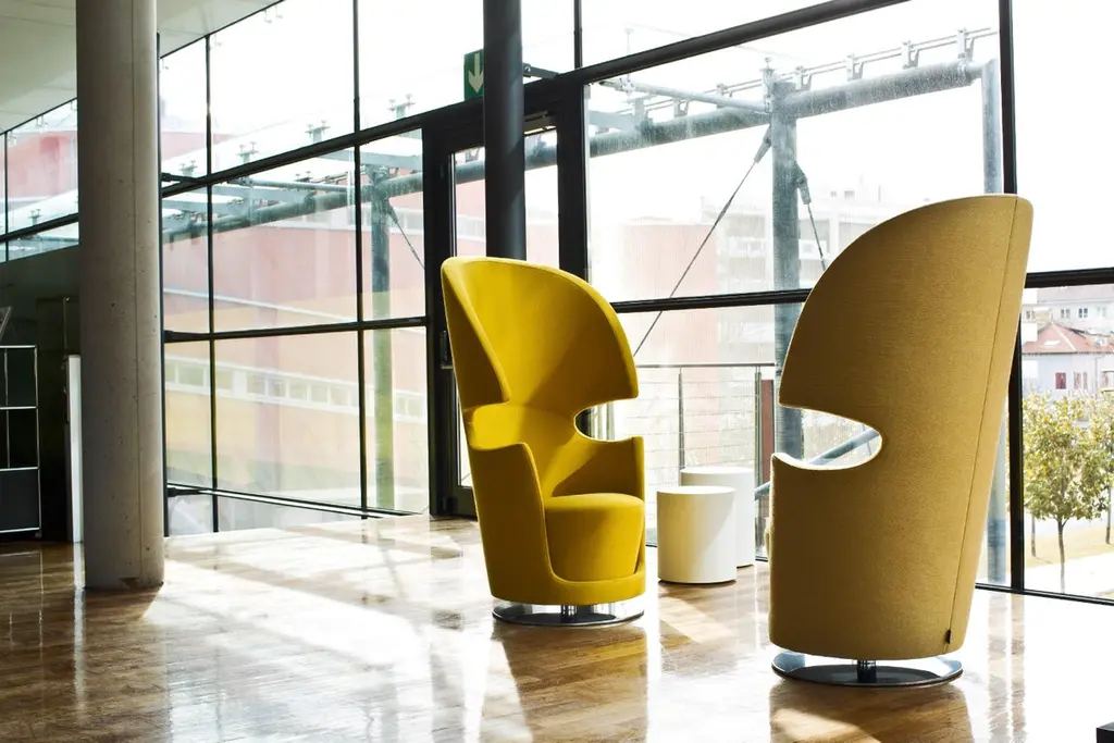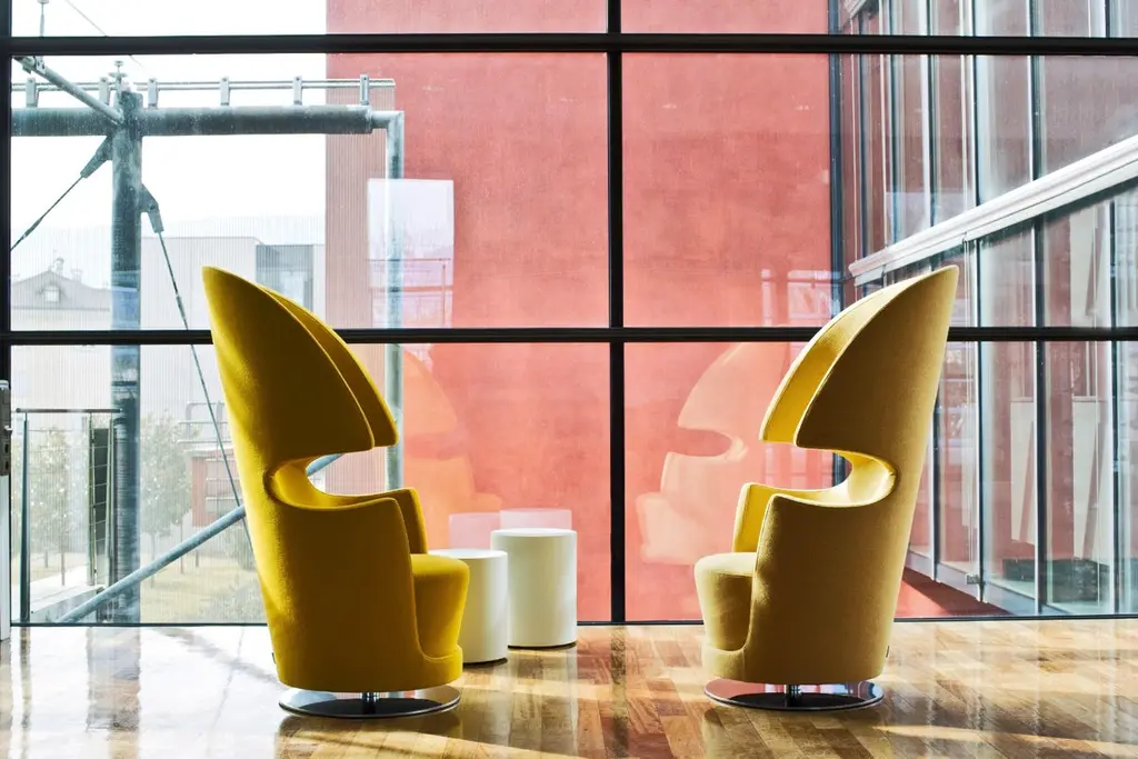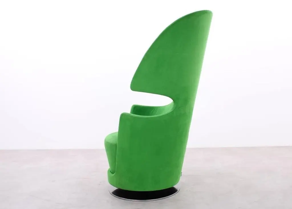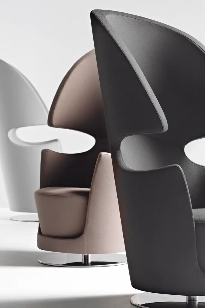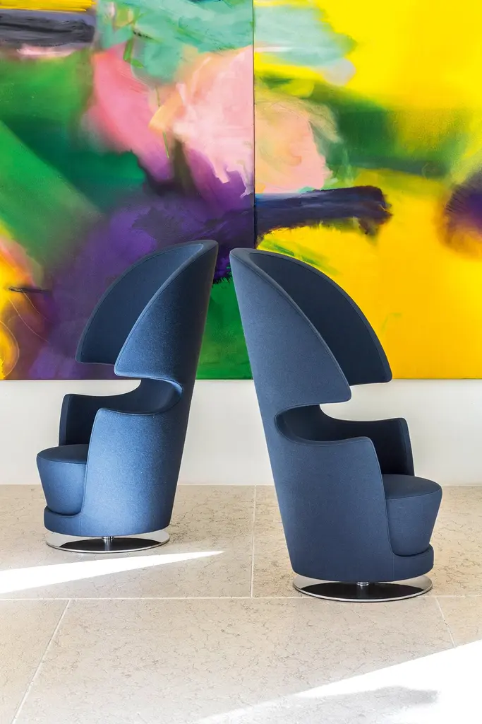 This armchair is designed for both comfort and a sense of personal space. The high back and shell-like shape provide a feeling of enclosure, creating a quiet and private haven ideal for relaxing alone or enjoying a conversation with a companion. The swivel base allows for easy movement, while the upholstered seat and back offer comfort. The metal base adds a modern touch to the design. Overall, it's a chair that combines style and comfort.We will be glad to check with the factory’s technical team if sizes, finishes, and colors can be customized. We do our best to expedite production and to ship and deliver product within the listed lead time, however current lead times might be longer due to global shipping backlog and delays. These delays are out of our control and cannot be a reason to cancel an order.